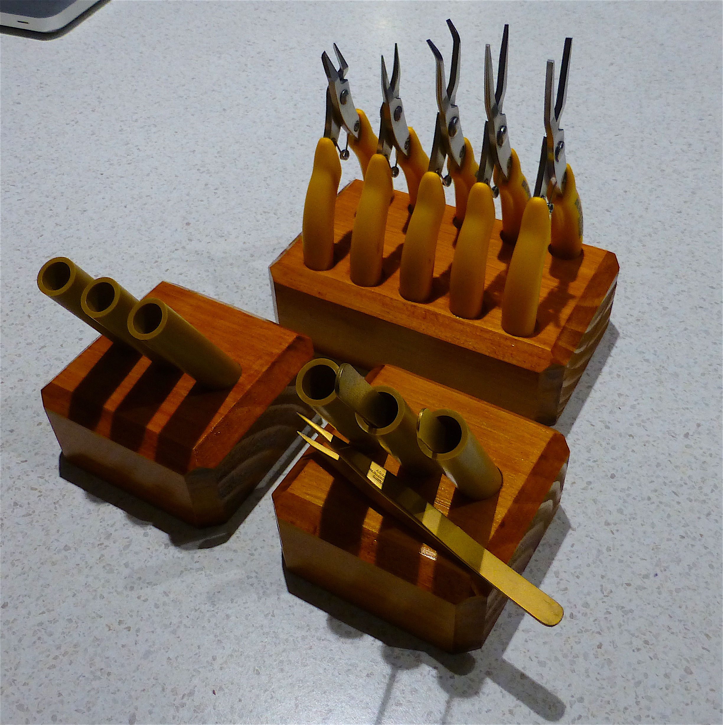 So I made a rack for my pliers and two racks for tweezers and pokey tools.