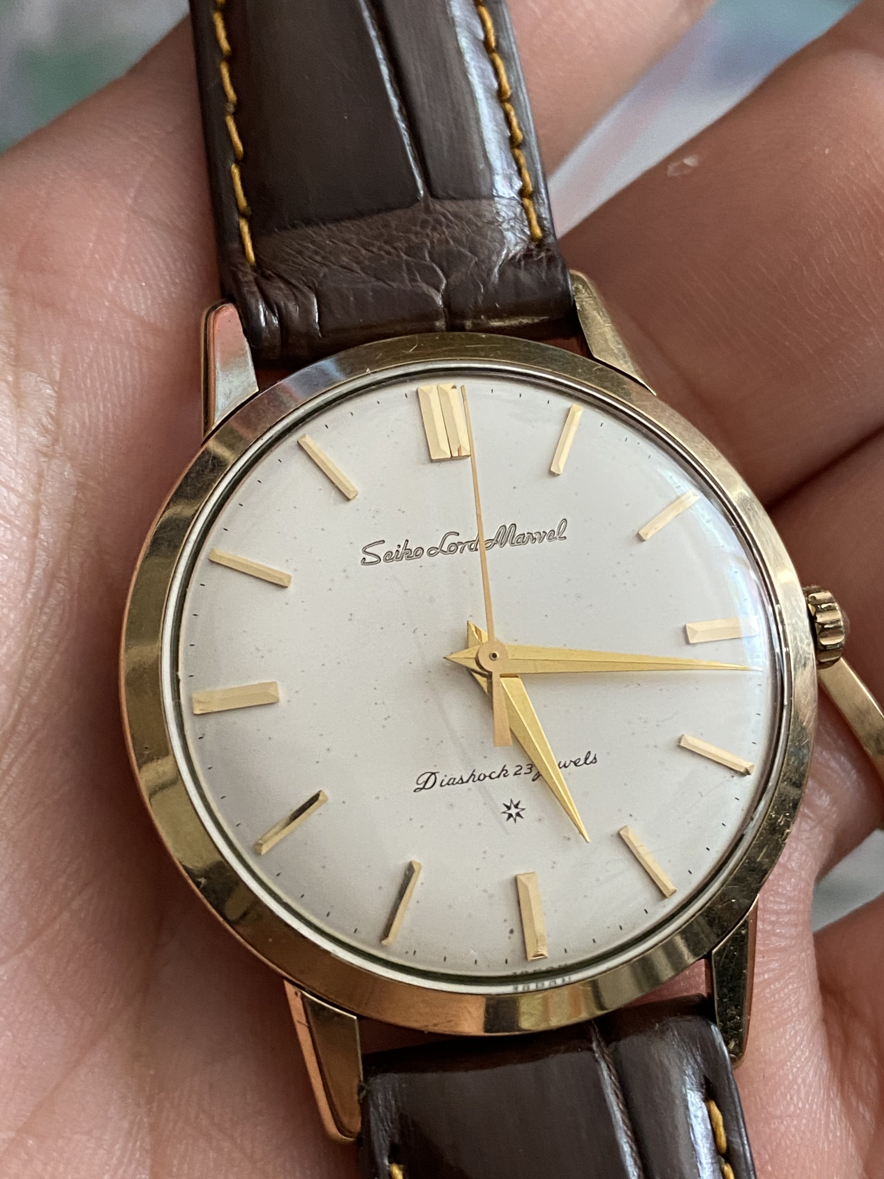 This is the very first Grand Seiko ever made, and was the model after the Seiko Lord Marvel carved dial models. (I believe these carved dials gave Grand Seiko the confidence to create the First)