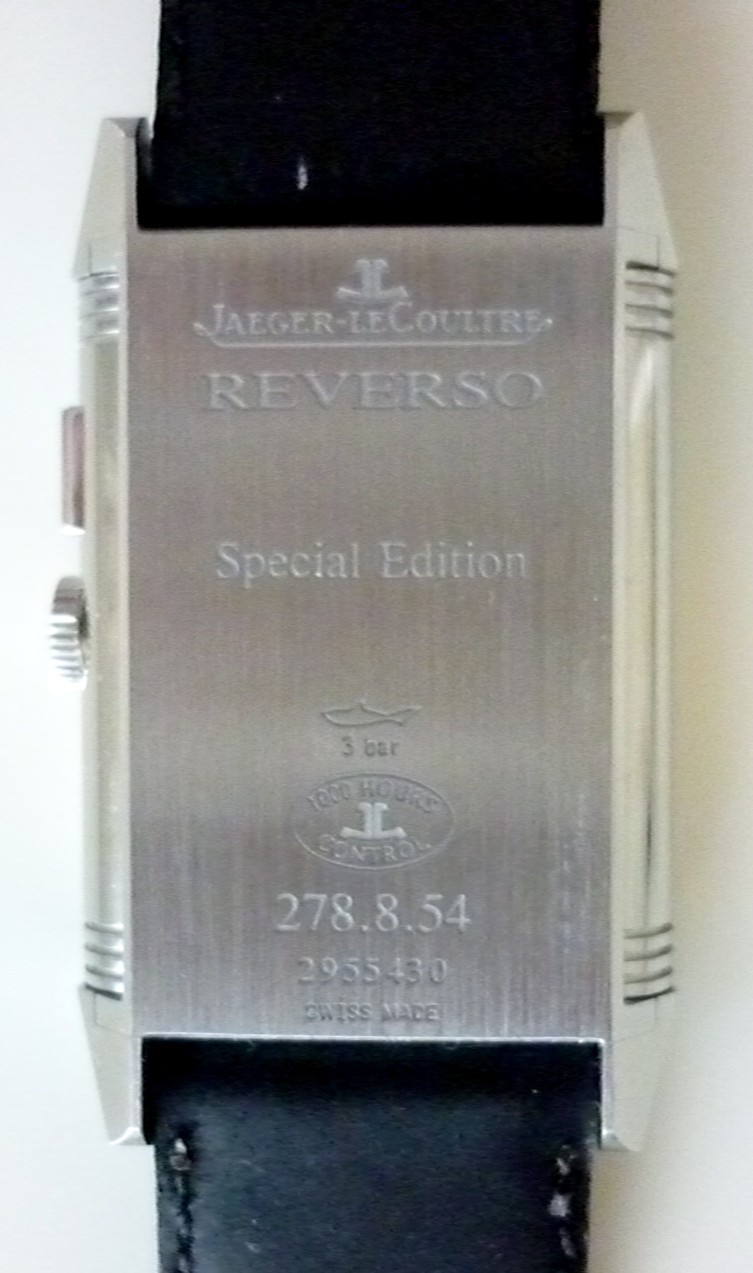 That sort of brings us to the movement, a cal 854/1. JLC have used the cal 854 in their Duoface watches for some time. Cal 854 was introduced in 1994, runs at 21,600v/h, has 180 parts and 21 jewels and is 3.8mm high. The Duoface watches have been thinned down for the Ultra Thin range by JLC being able to take a few fractions of a mm off of the movement casing and by also reducing the thickness of the traditional Reverso casing surround (i.e. the backing plate and housing that the watch itself is located in). Normally the cal 854 and 854/1 have a seconds hand in a sub dial just above the 6 o'clock position. This is a wholly manual movement, with a 45 hour reserve. The winding action is very smooth & easy. I'm not sure what the /1 designation represents, so if anyone knows please chip in.