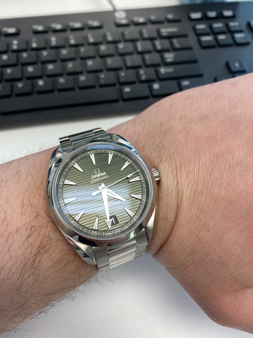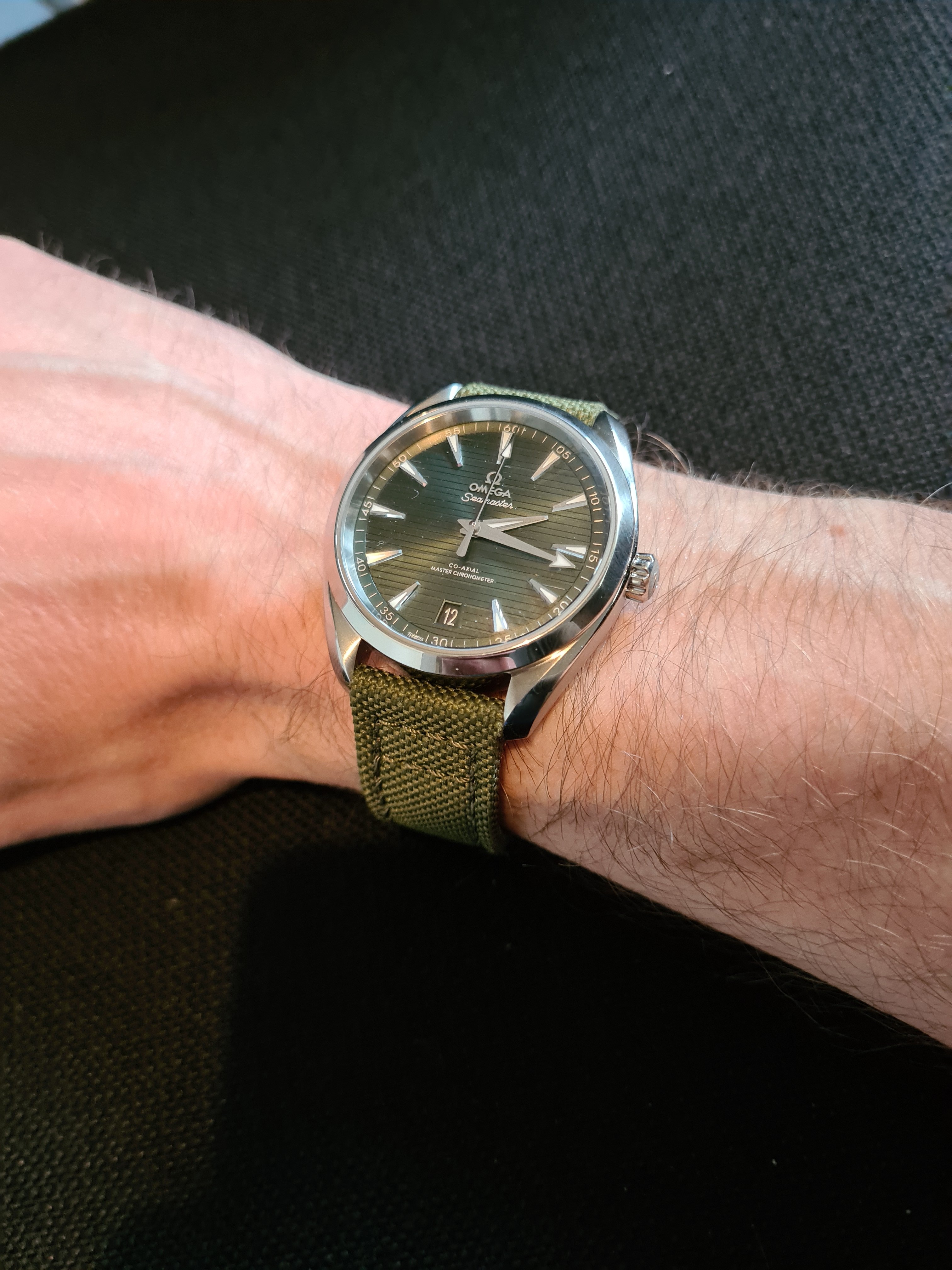 This is probably the most polarizing aspect to this watch and I'll start by saying it looks way better in the metal than most of the photographs or renderings on the internet. When I first saw the images, I was turned off even. Really Omega, that's what you put on the website? Absolutely dreadful. No wonder why most folks were trashing the green watch dial without seeing it in the flesh...I must admit I was the same. That all changed when I called up my AD and they sent me real life pictures and a short video with the dial dancing in some lighting. Oh boy, the hook was set. I journeyed to the AD to see it on wrist and I was in love. Now, it is definitely muted in most lighting conditions. It appears a dark green / olive 80% of the time, sometimes coming across as near black. The remaining 20% is an emerald type of green, which is very mesmerizing to stare at - time almost seems to stand still in those moments.