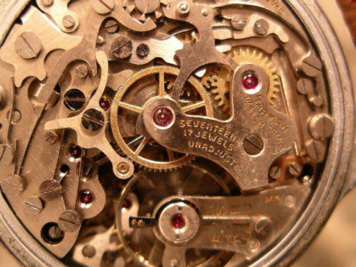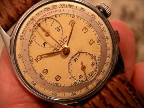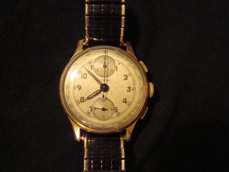 MOVEMENT: original mechanical with manual winding movement, RARE & DESIRED highest quality caliber VALJOUX 77 used as well by many others TOP watch brands during 40'ies & 5'ies. Movement is signed: HARMAN WATCH Co, SEVENTEEN, 17 JEWELS UNADJUSTED SWISS. Caliber VALJOUX 77 measures 29.50mm diameter (13 lines) and has a 30 minutes counter.