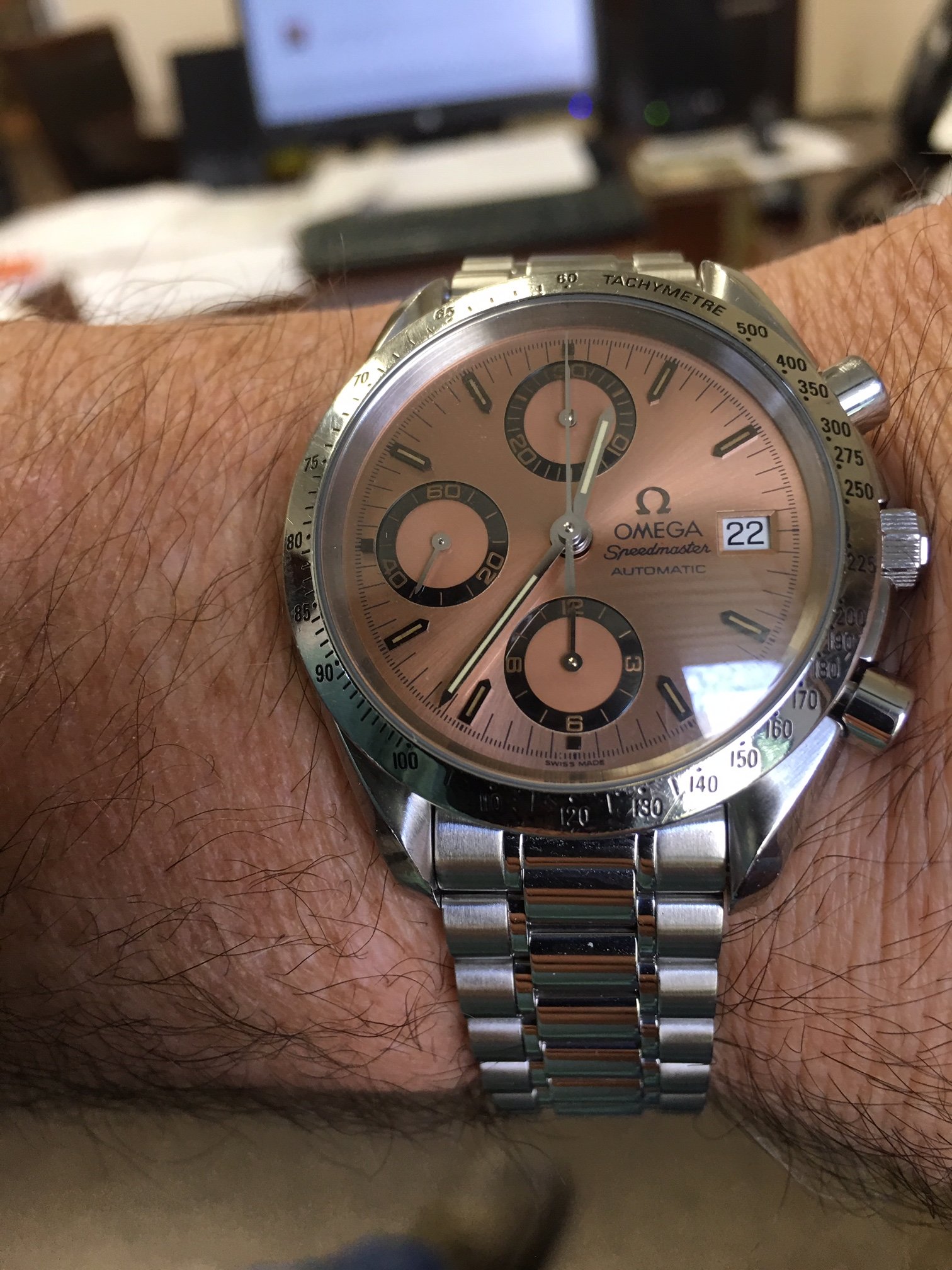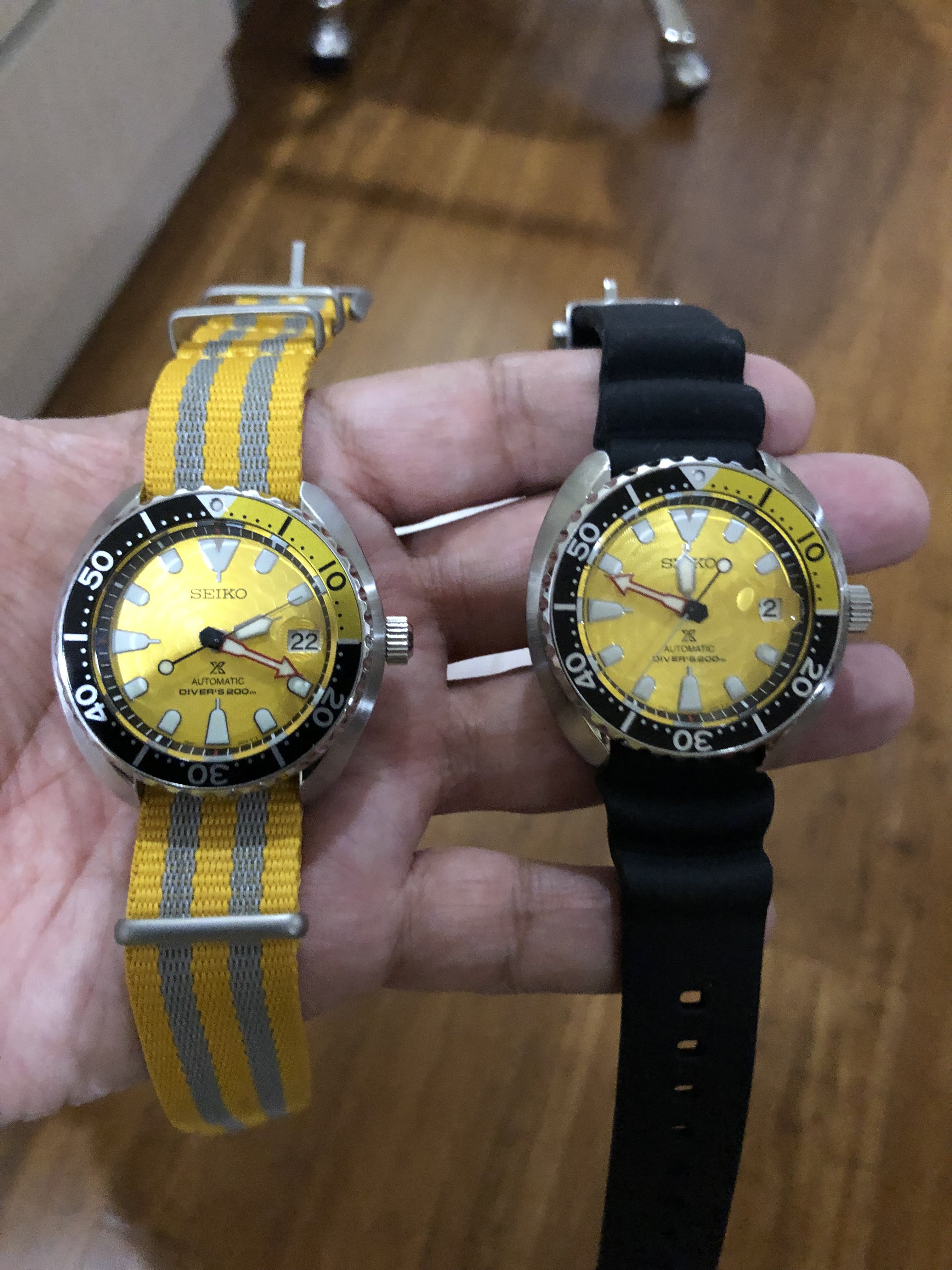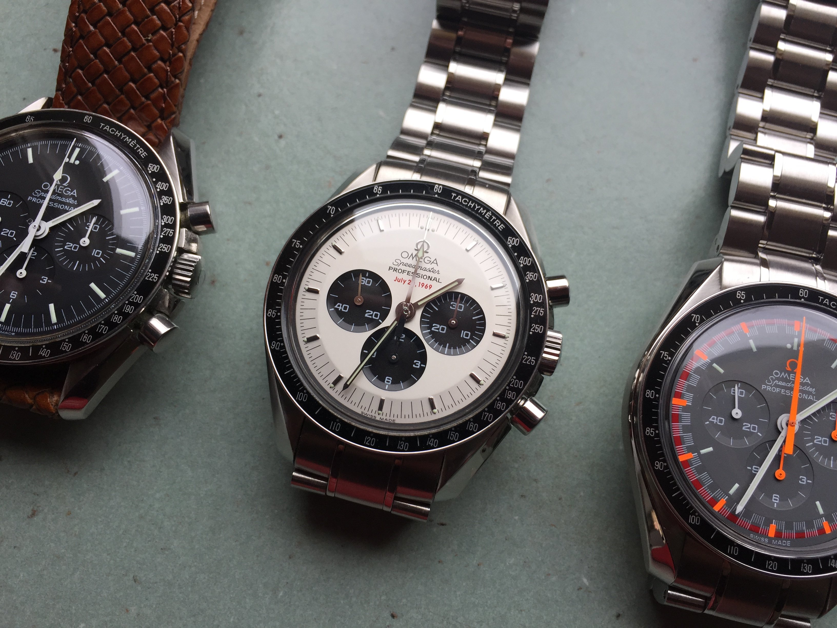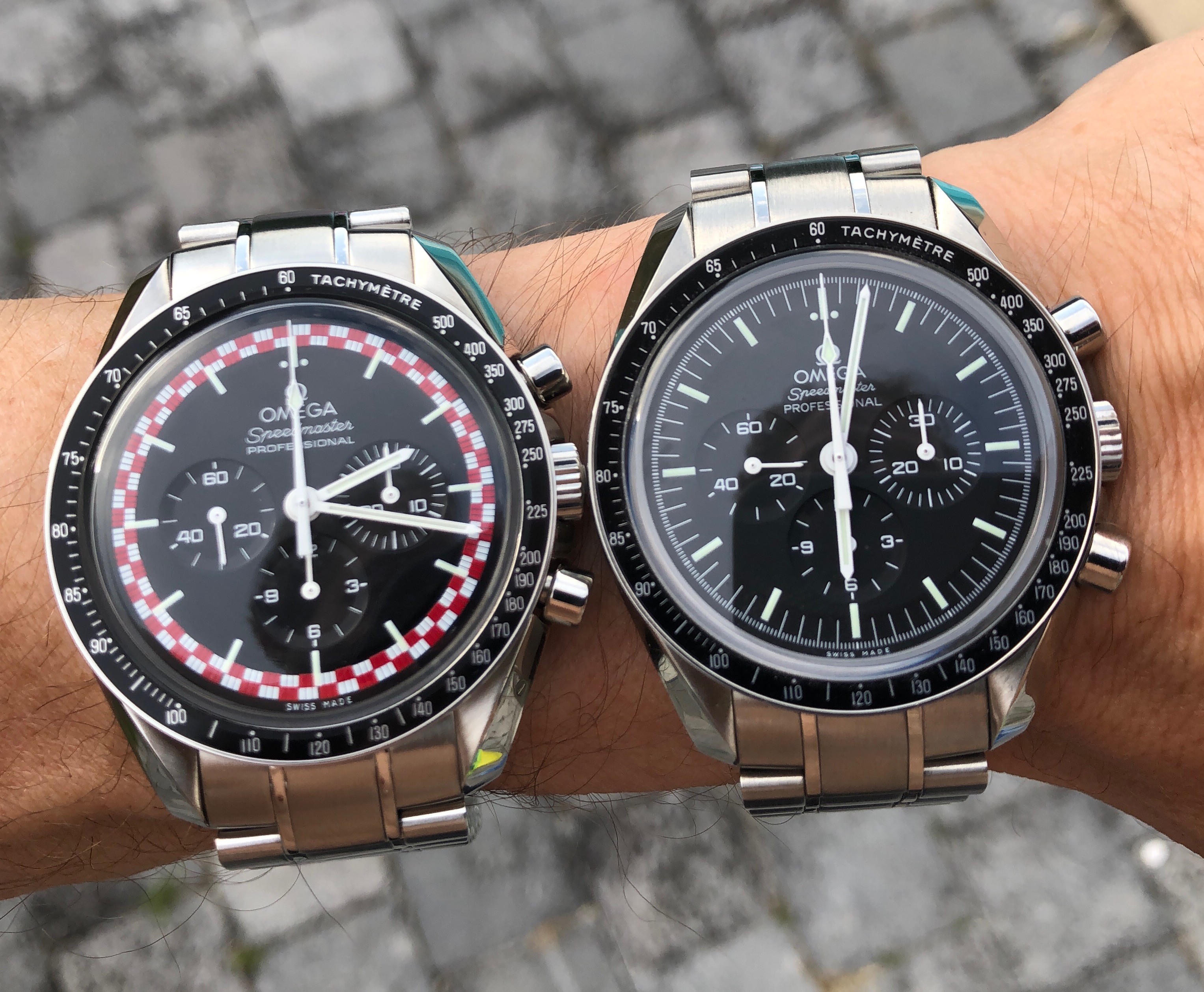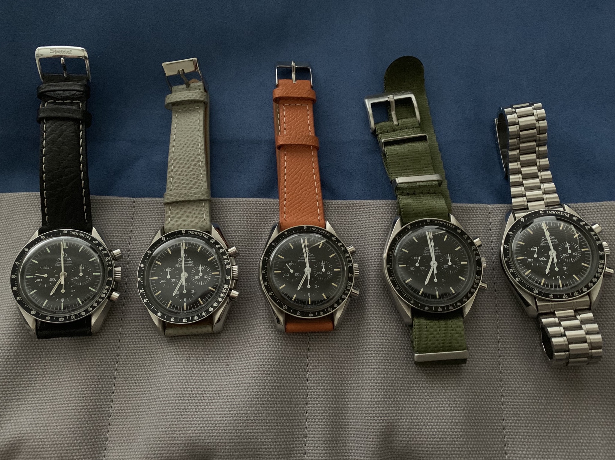Currently I have a Speedmaster Pro with white Italian dial, one with Mitsukoshi dial, the Speedy Tuesday with reverse panda dial, and two with a standard black dial. I have three Victorinox Dive Master 500 in stainless and black dial, PVD and black dial, and PVD with red dial. Have a Luminox Atacama chronograph with black dial and one with blue sunburst dial. I have a Seiko PADI Turtle and the Blue Lagoon Turtle that differ in dial and bezel. Blah Blah Blah.