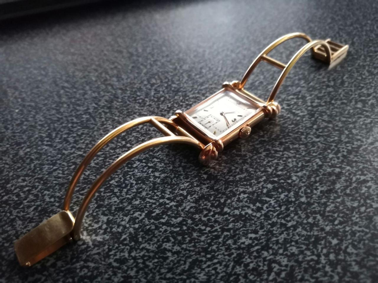 The watch has a two-piece rectangular body made of 18k yellow gold with a snap-on case back and fancy