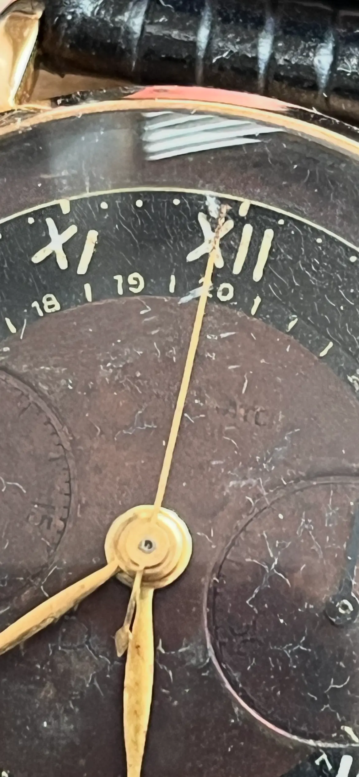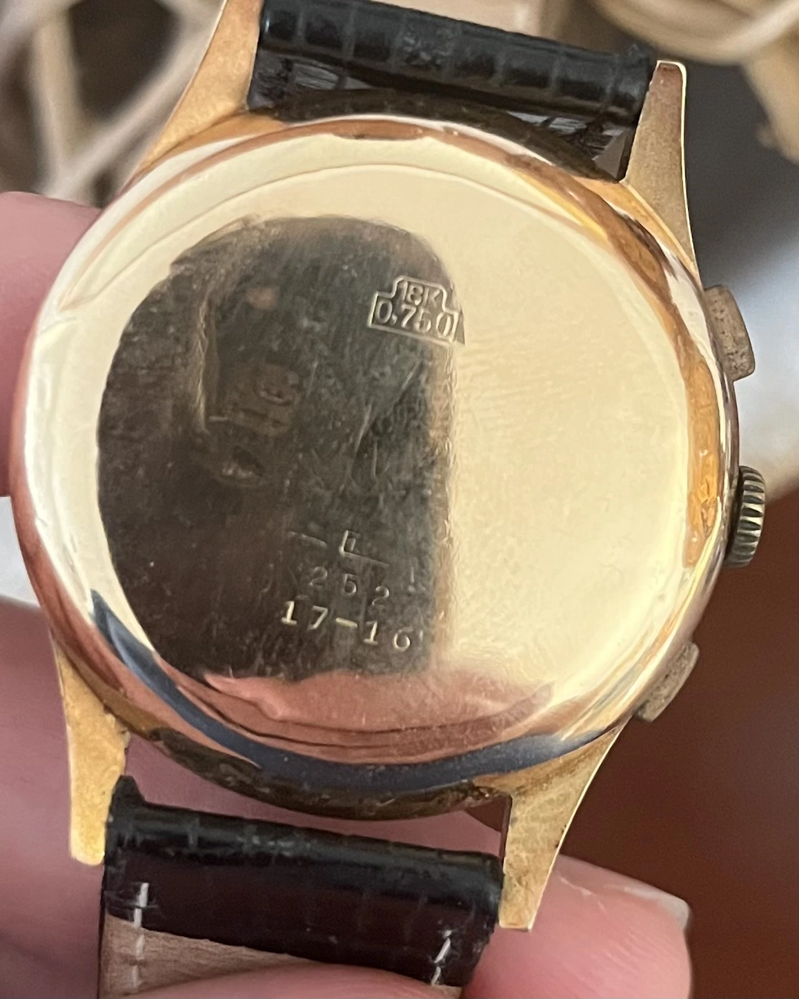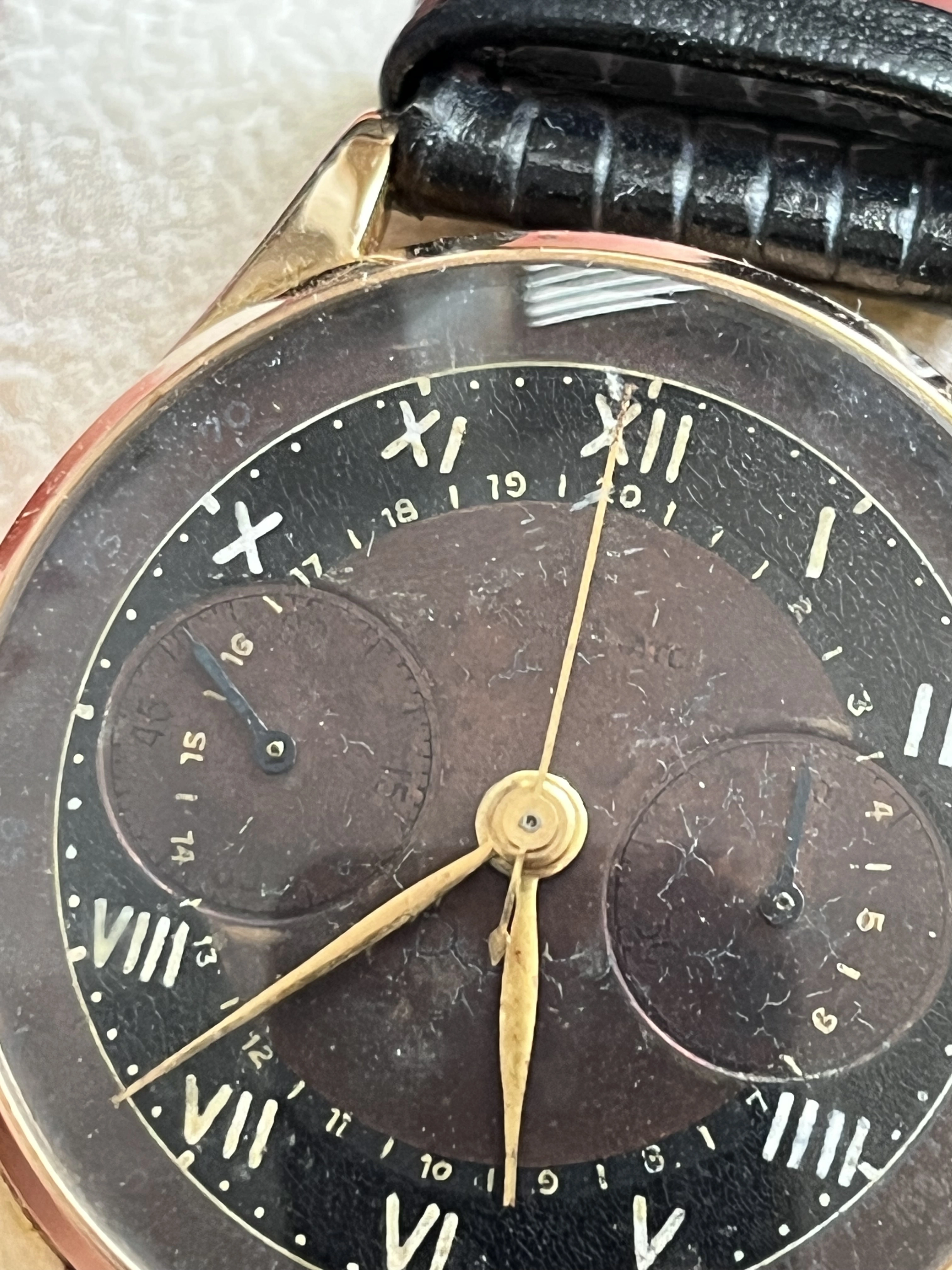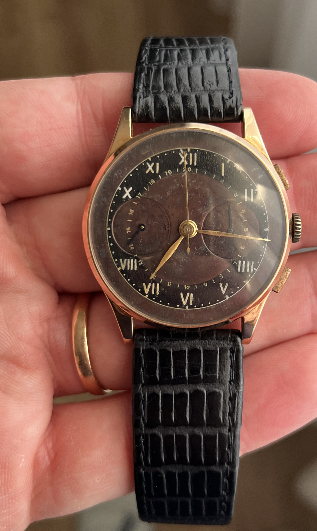 That looks awfully like the generic Chronographe Suisse style of watch seen with various branding dating from the late ‘40s up until the end of the ‘60s. Despite being marked 18K gold, there is very very little actual gold in them, like 6g at most. The cases are paper thin and very easy to damage. If you pop the back you'll find a base metal inner back and also similar movement ring which adds the strength but of course lowers the gold weight. These were cheap to buy back in the day and were sold as souvenirs to visitors to Switzerland. They trade for low to mid hundreds of pounds/mid to high hundreds of dollars on ebay and the like, though the recent rise in gold prices should put a floor under their values. In theory, a black dial should fetch a higher price, but that one is pretty heavily patinated and the numbers looks to have perhaps been repainted so probably wont attract much of a premium over the other paler versions.