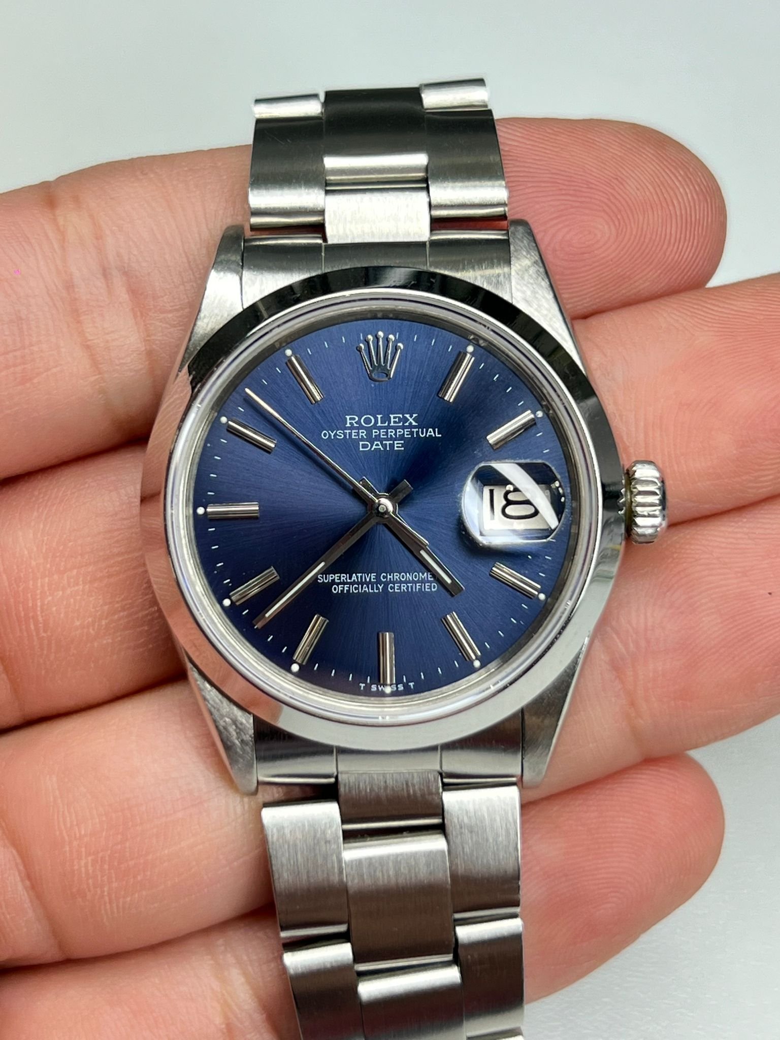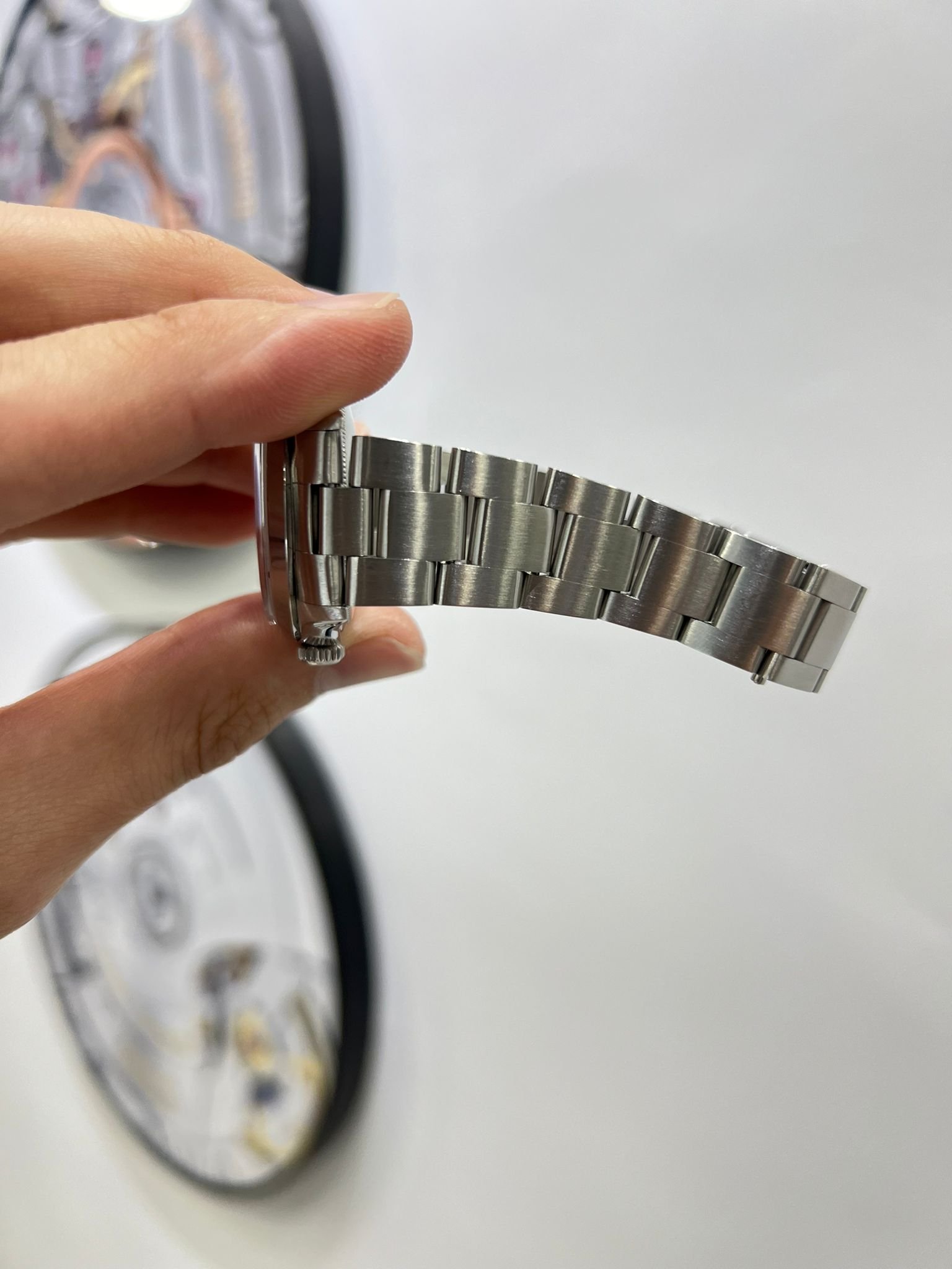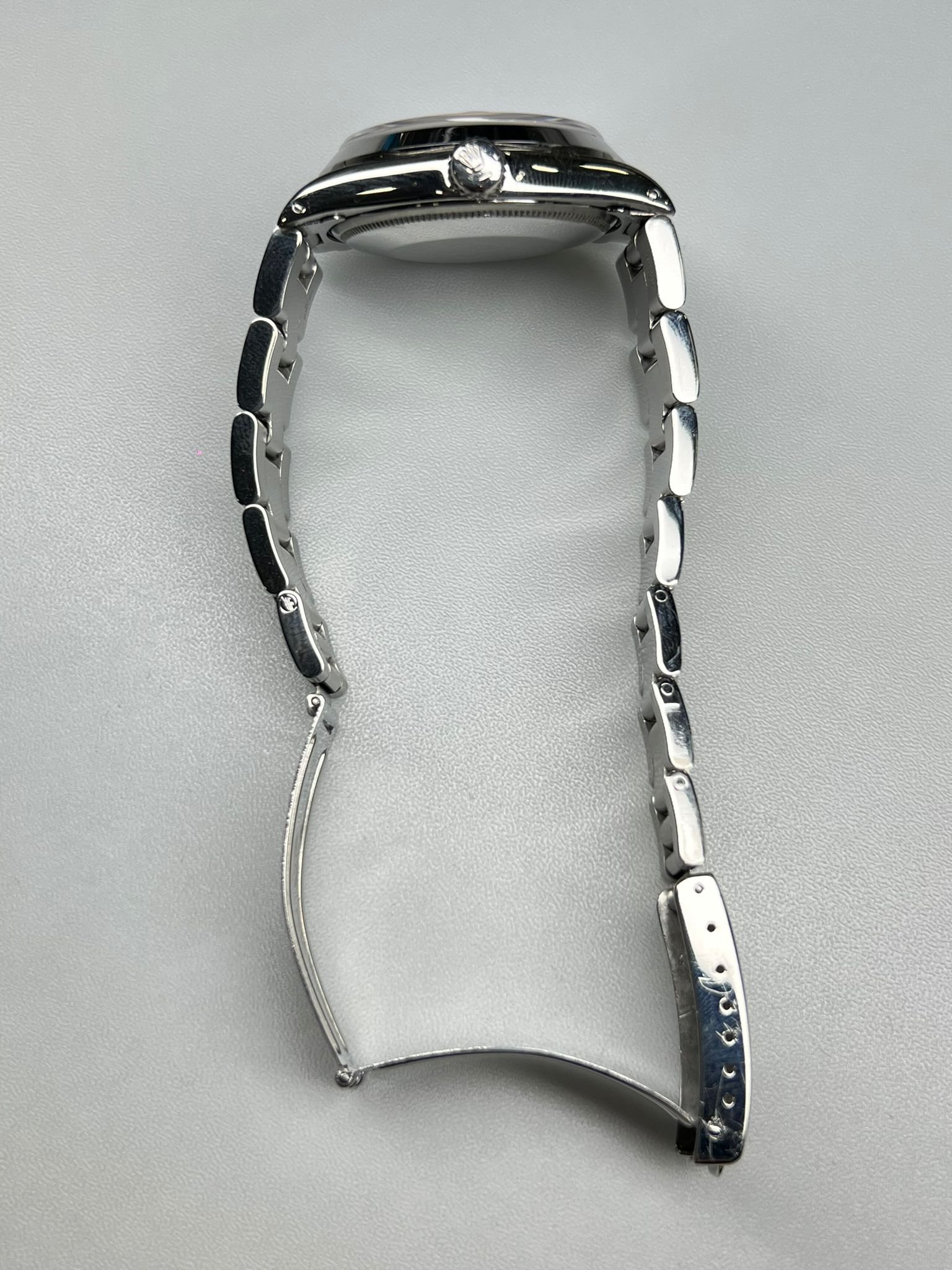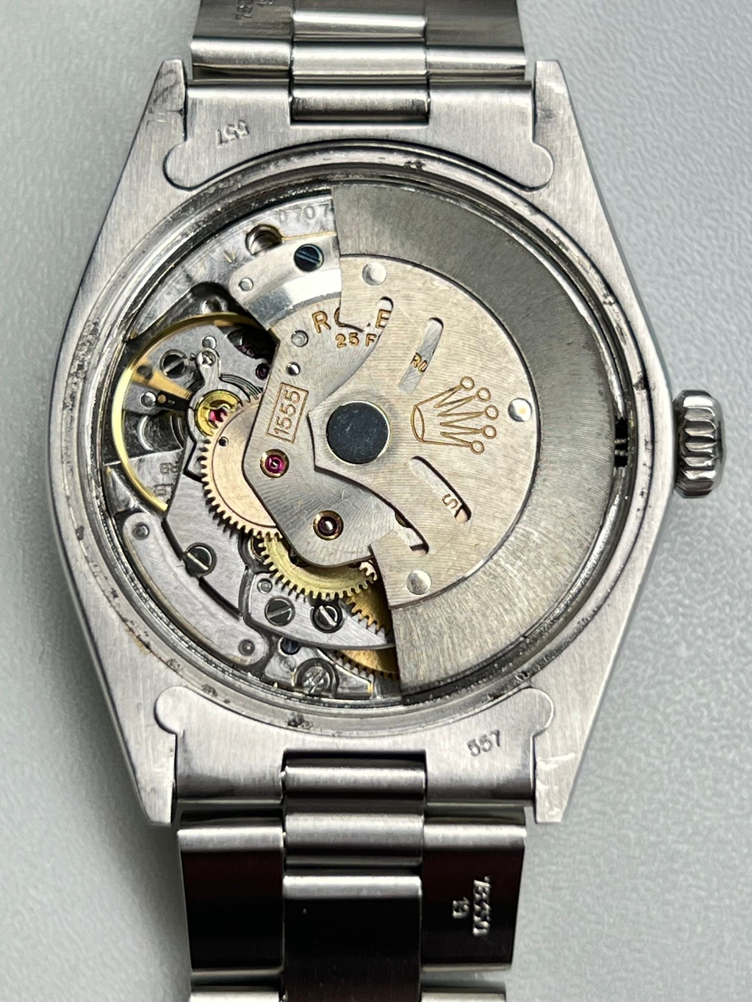 The dial looks nice and in good shape but why the heck is there a 1555 movement (day date) in there? Actually, it looks like a Frankenstein’d movement because there is a kif shock system, a non-chronometer balance setup, and a much earlier auto module with cal 1555 engraving, older reversing wheels and early butterfly weight.