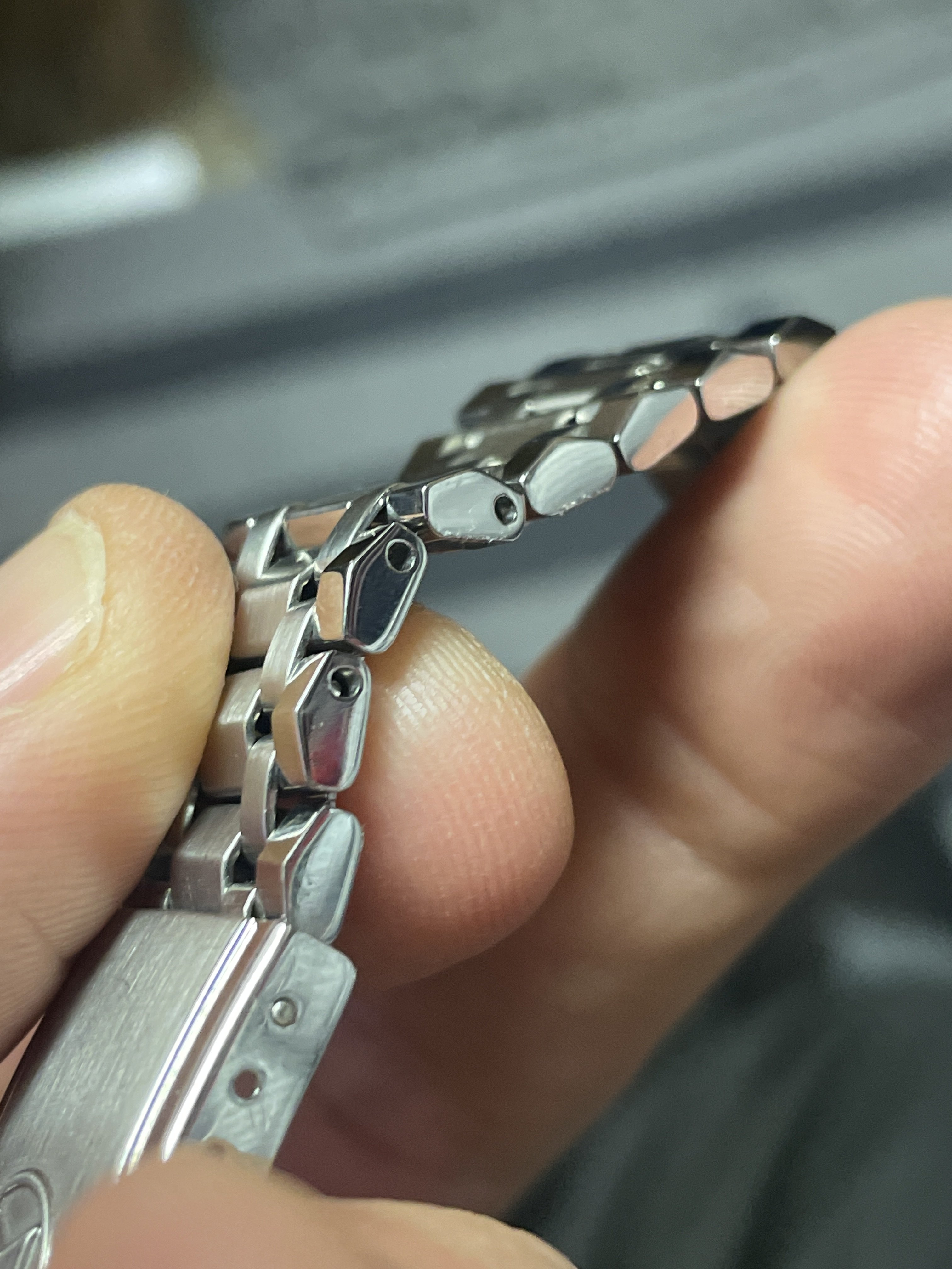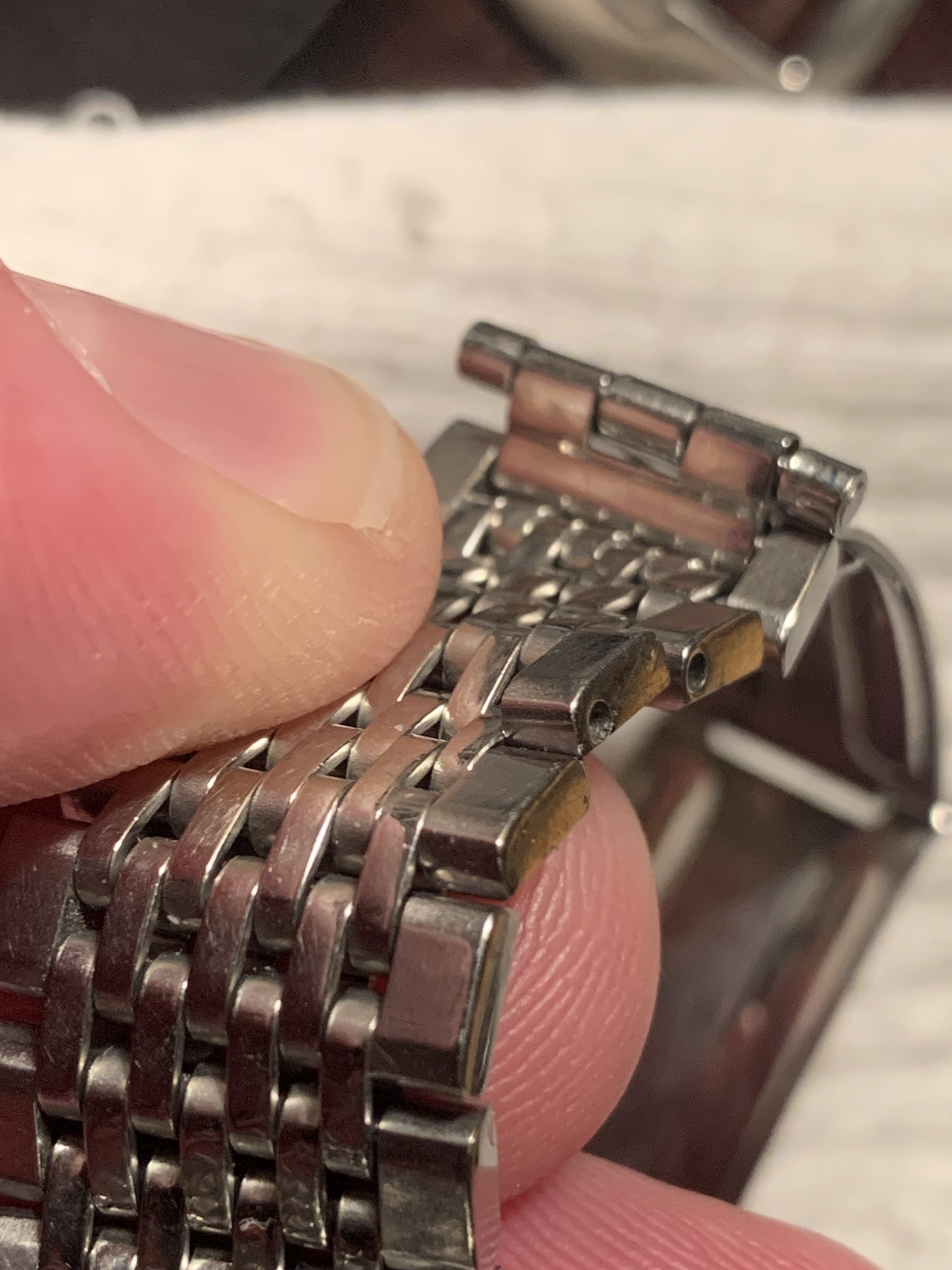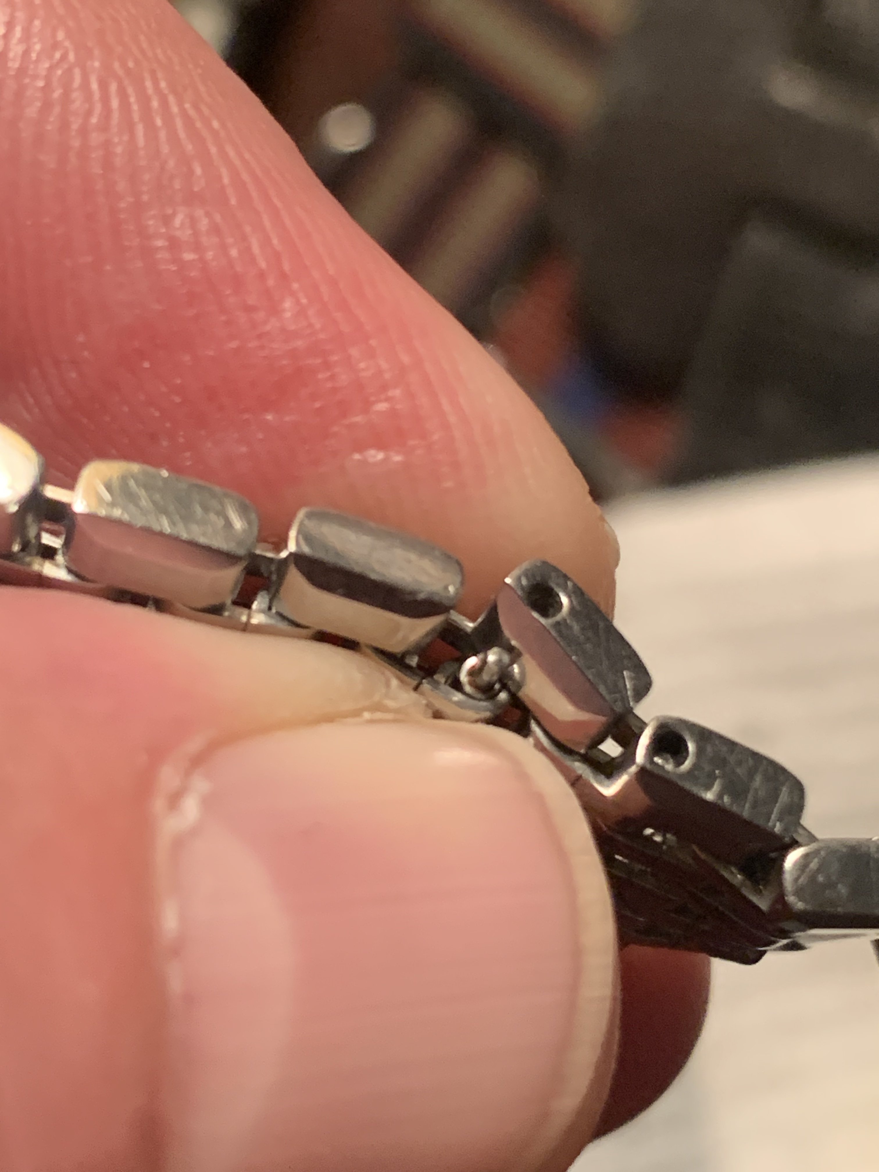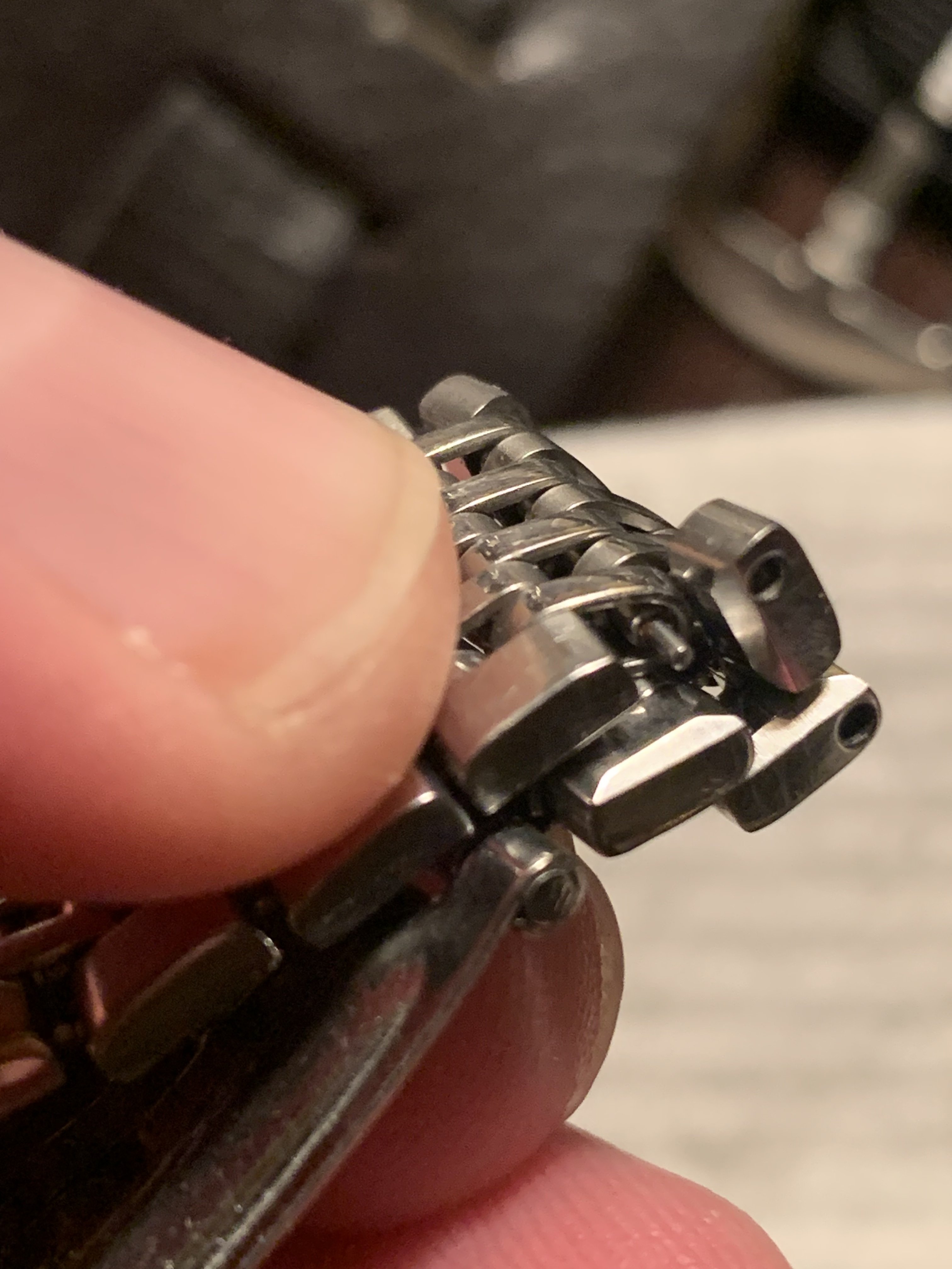 ·I have this bracelet here with a couple of removable links. These are not the split or friction pins that pushes out uni-directionally. They are spring loaded and can push in 2-3mm, but nothing happens. I assume they have to be pushed in a certain depth and then behave like a spring bar, however I can’t figure it out.
