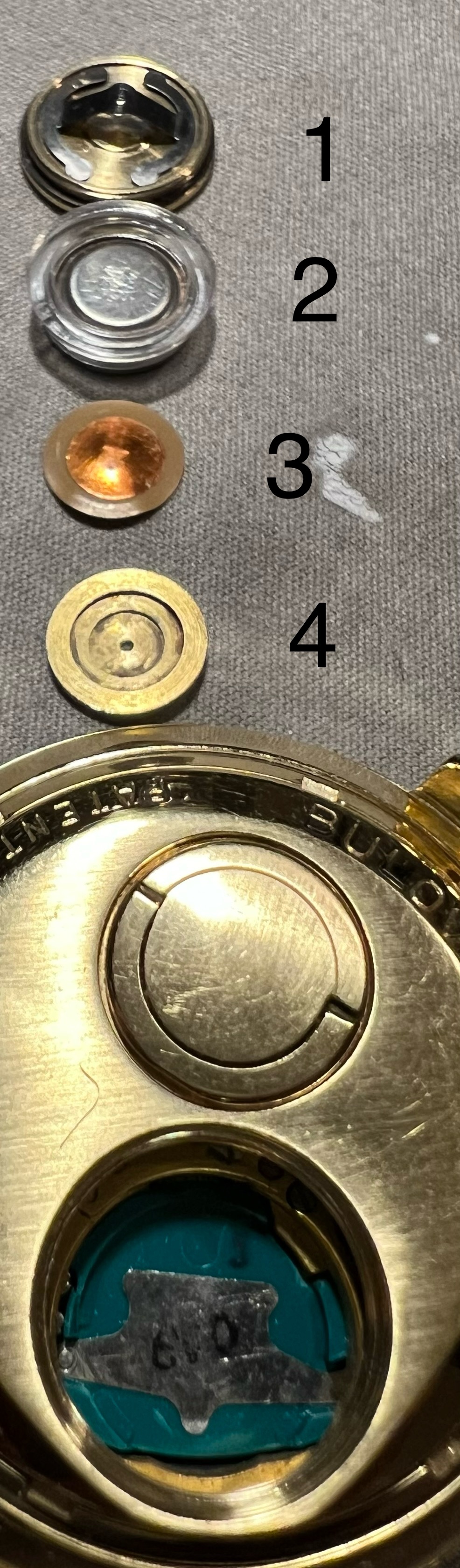 ·I’m replacing the battery on this Astronaut for the first time. After unscrewing the hatch, two unexpected components fell out the compartment beyond just the battery and its fitted spacer. Unfortunately I didn’t take note of the order and orientation of how parts 3 & 4 fit in the battery compartment. Advice much appreciated.