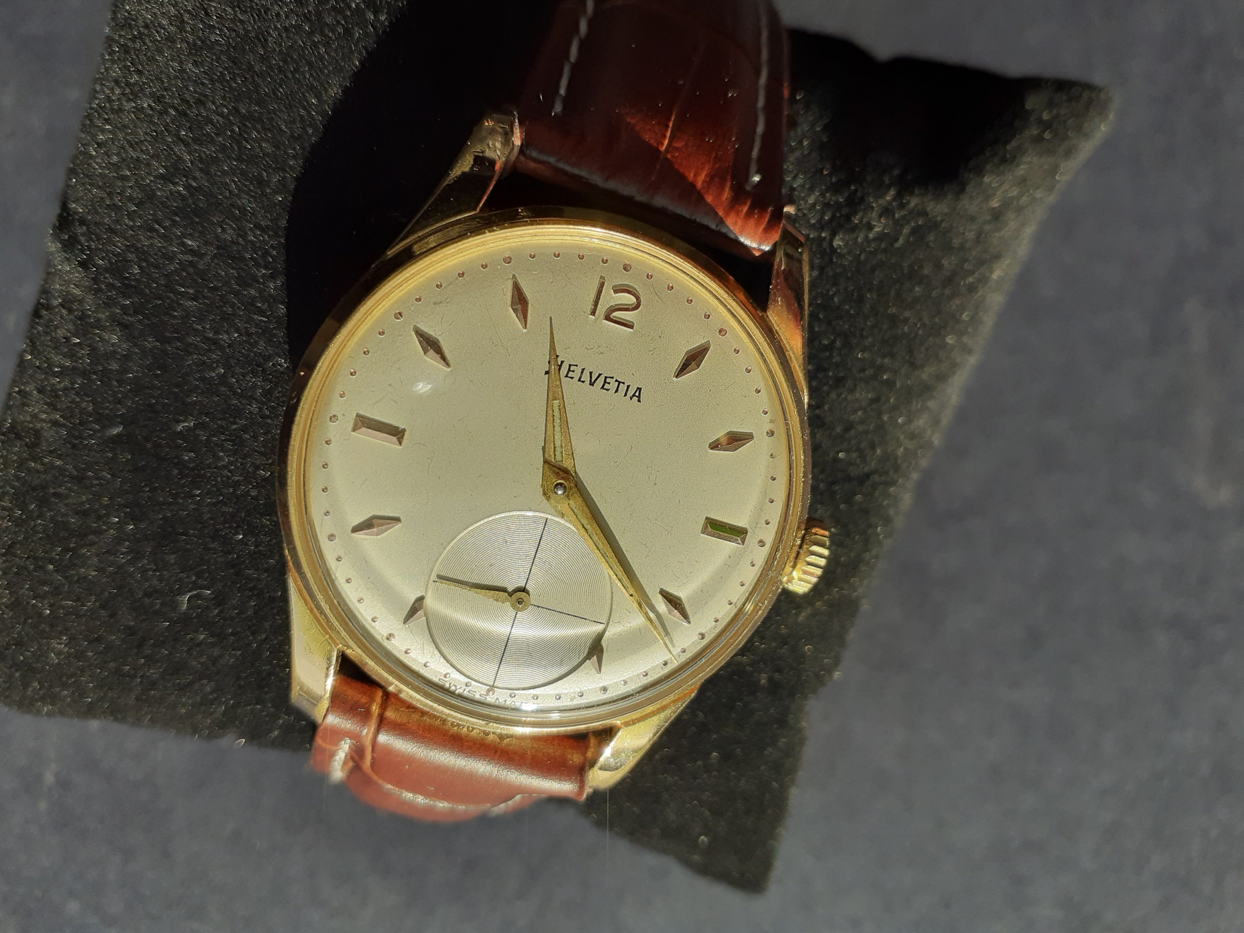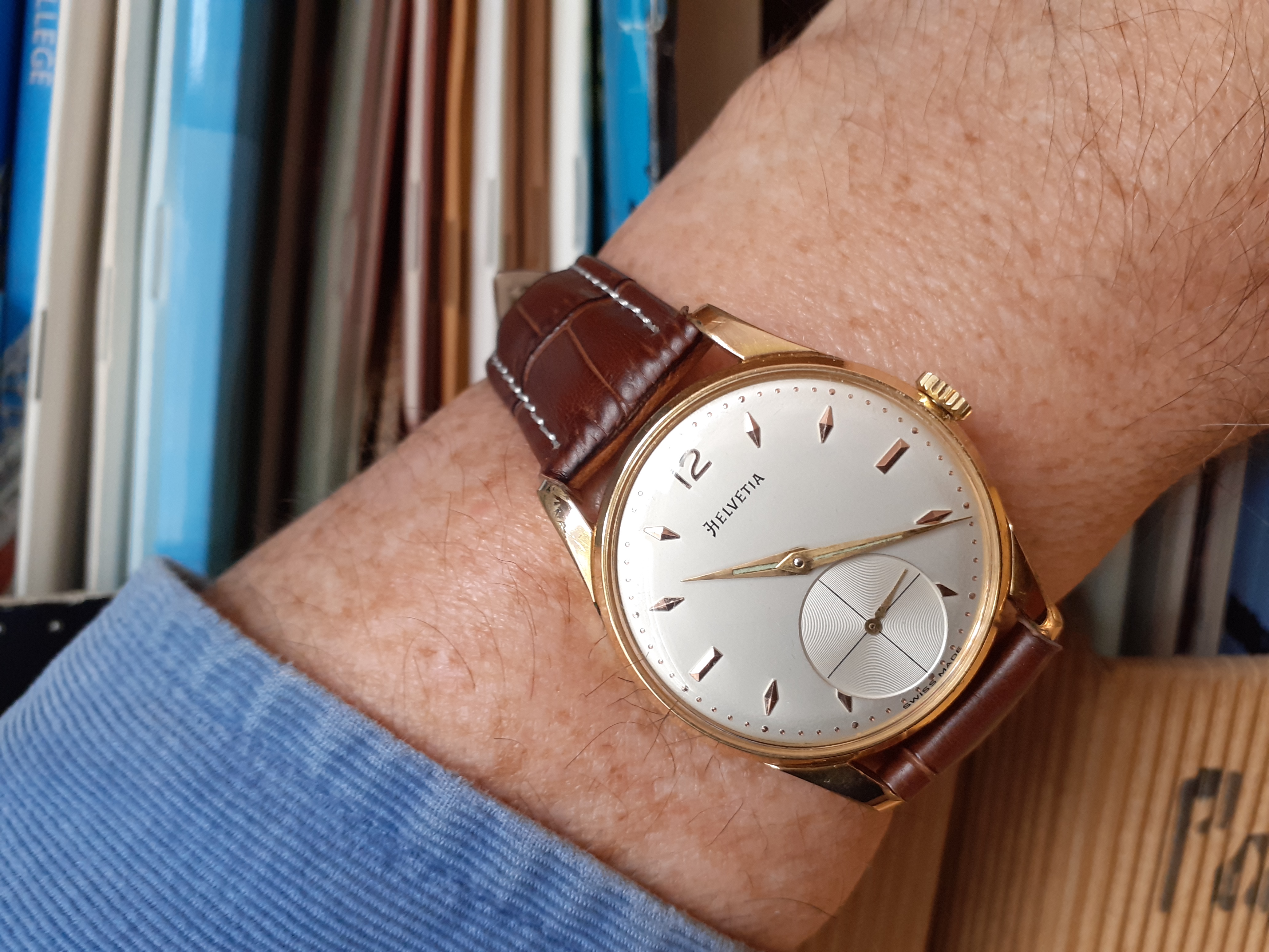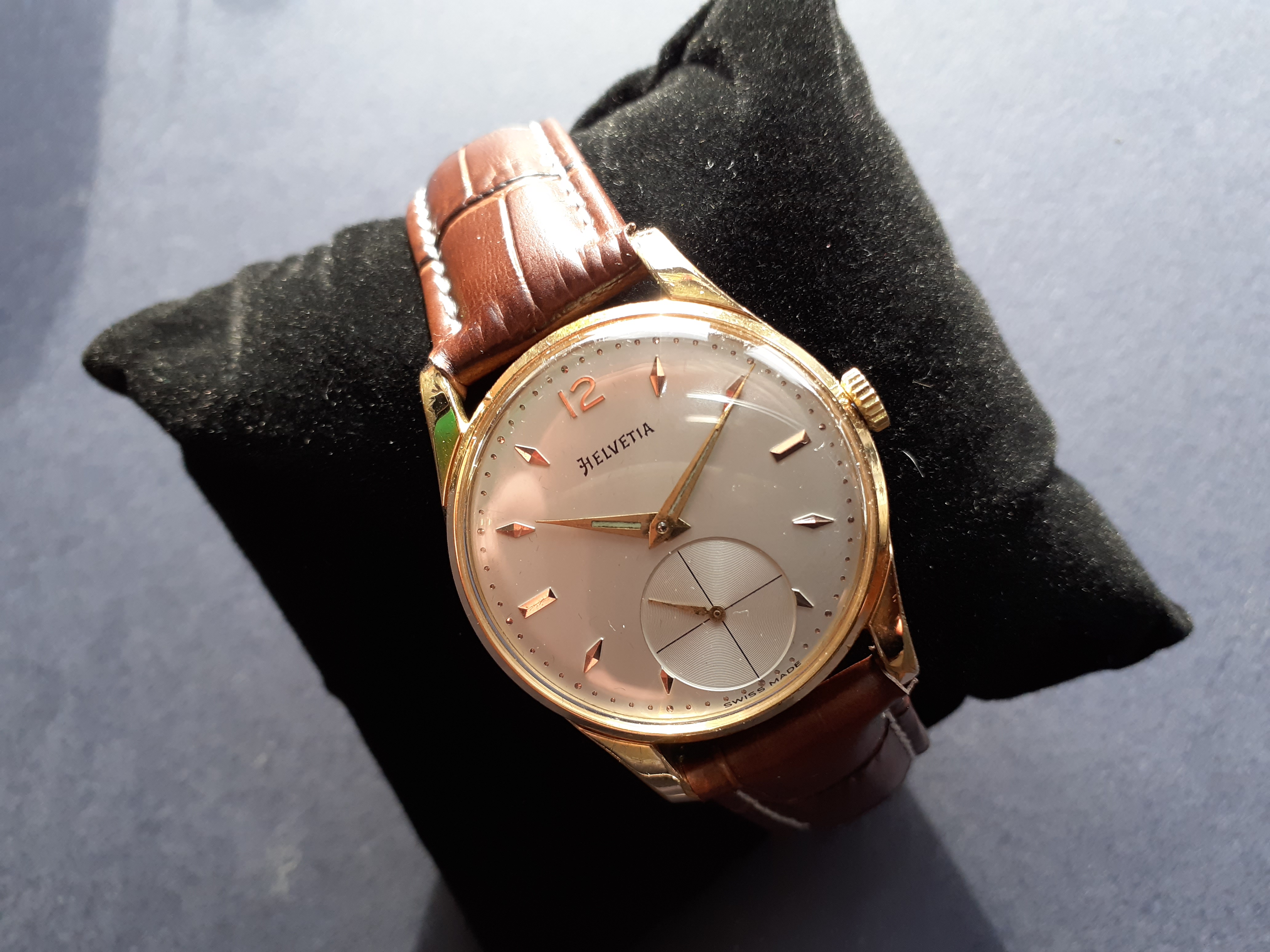 Here it is - Helvetia cal 830 from 1955. A little WM TLC and a new strap (it arrived on black - crying out for liberation), and a new life beckons! It's certainly making me very happy.