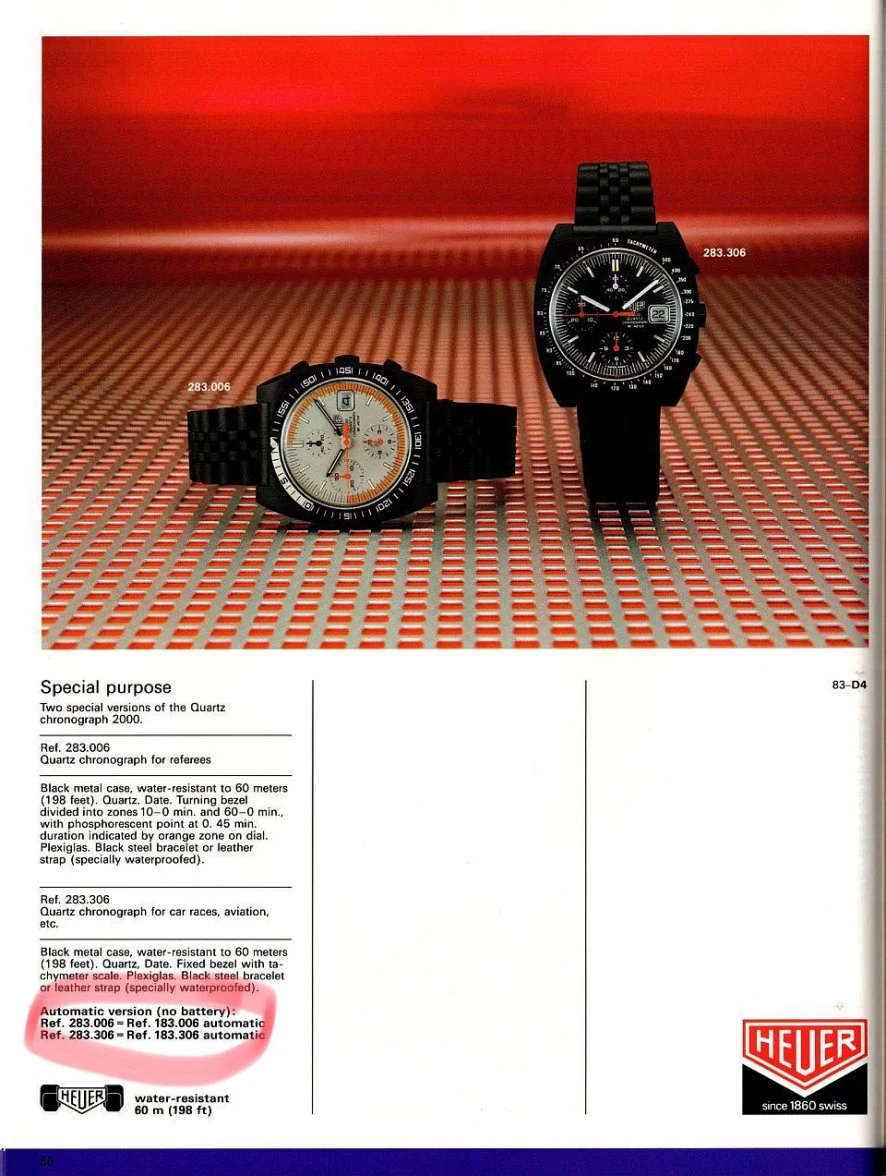 My first encounter with these scarce and interesting watches was I'm sure in late 1982,I had just left school and started as a trainee opposite a jewellers who retailed Heuer amongst other brands. I saw a 283.306 in the window and immediately fell in love with it. If memory serves me correctly it was around 拢250 GBP and I clearly remember the sales lady telling me they only had two,one auto and one quartz,both were the same price. I was on a trainee wage and there was no way on earth I could afford one,拢250 was more than i'd just paid for a 5 year old Honda, my first motorcycle !