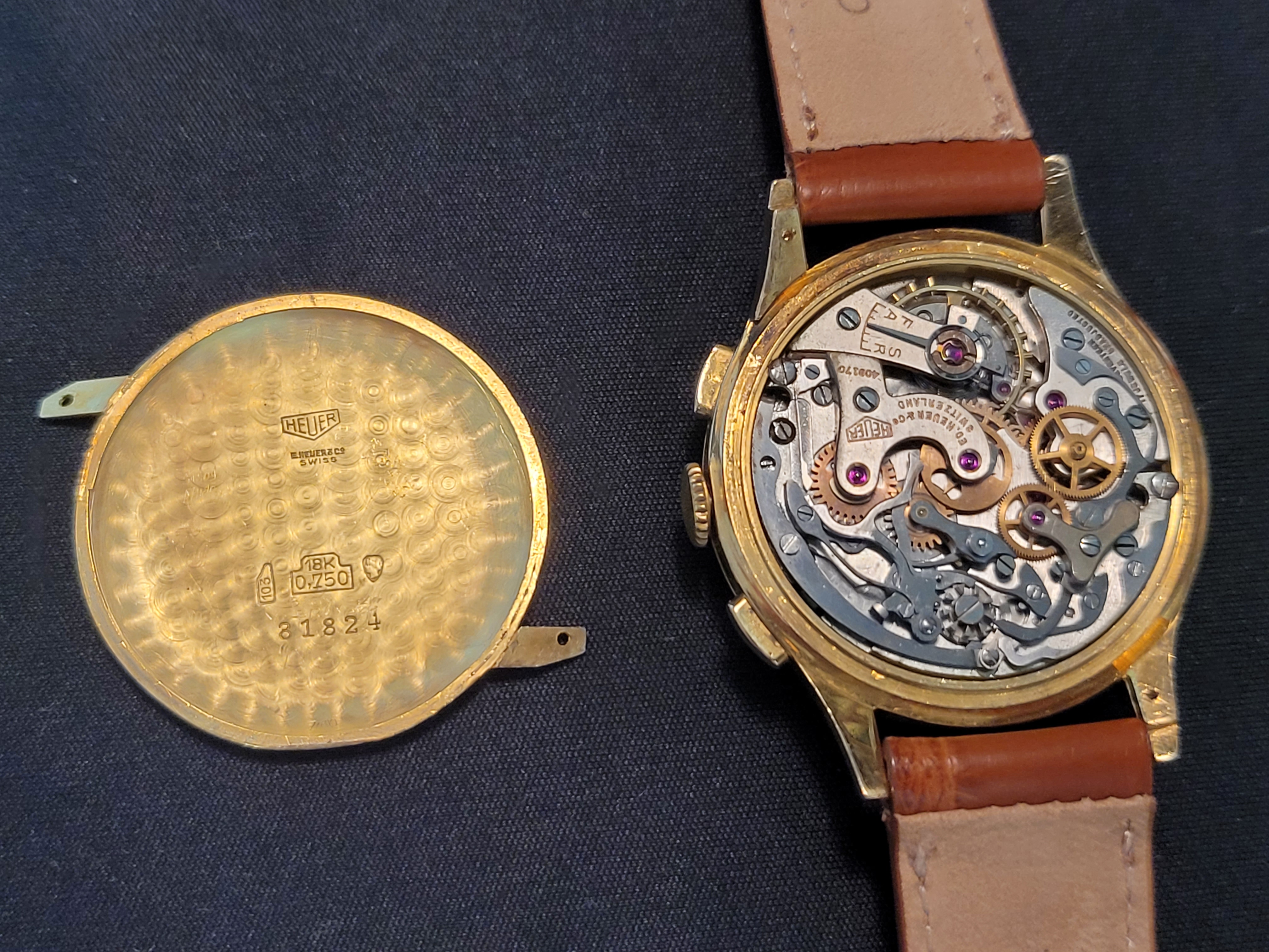 Here are some pics of the dial and movement, which is signed "Ed. Heuer & Co." which dates this to the 1950s. The dial looks extremely clean, too clean, and it does not match other original examples of this watch. However, tapping into the vast knowledge of OF members, does anyone know where this type of dial would have come from? It does not look handpainted, so the dial is a better qaulity dial and the printing looks pristine. It actually looks similar to an Omega chronograph dial from the same era, including the hands. The caseback has also been modified to be screwed in, since it's a snapback, but the extra gold can be easily removed to original. The lugs has another layer of gold for the screw and the original lugs have not been damaged.