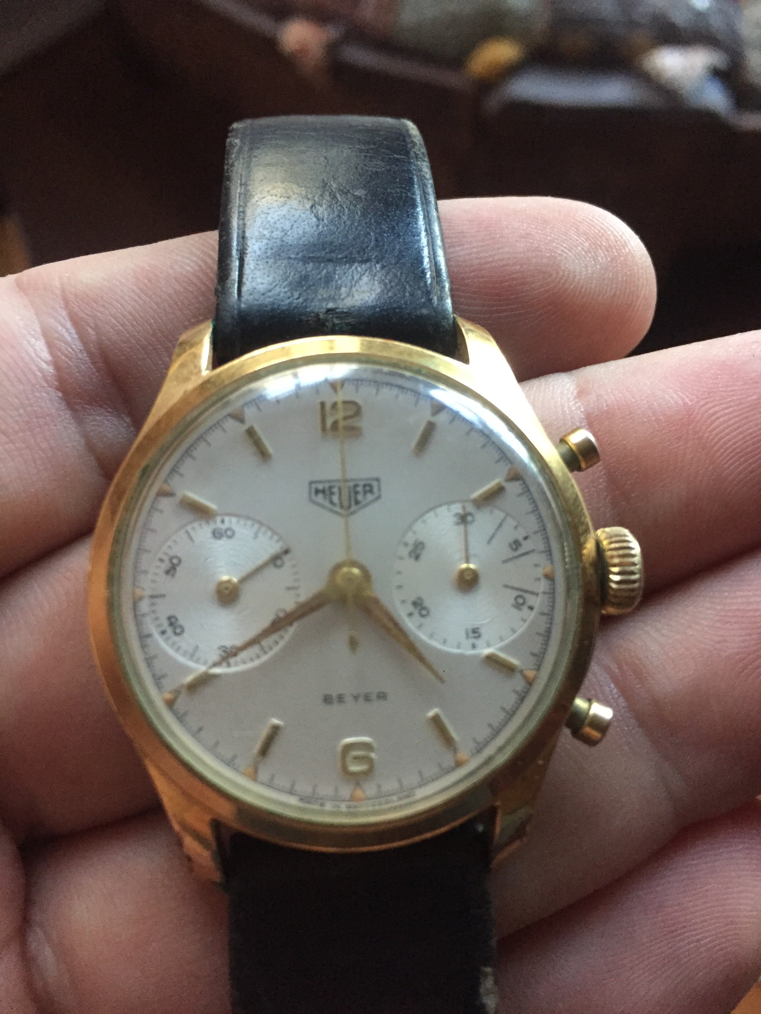 Posts 7,124 Likes 15,117 Calibre11 ·Nov 21, 2016 Hi. I think you have a Heuer Reference 409 from the 1950s- if so, it's a Gold-plated case. I'd suggest getting in touch with Abel Court at HeuerTime. Good luck!