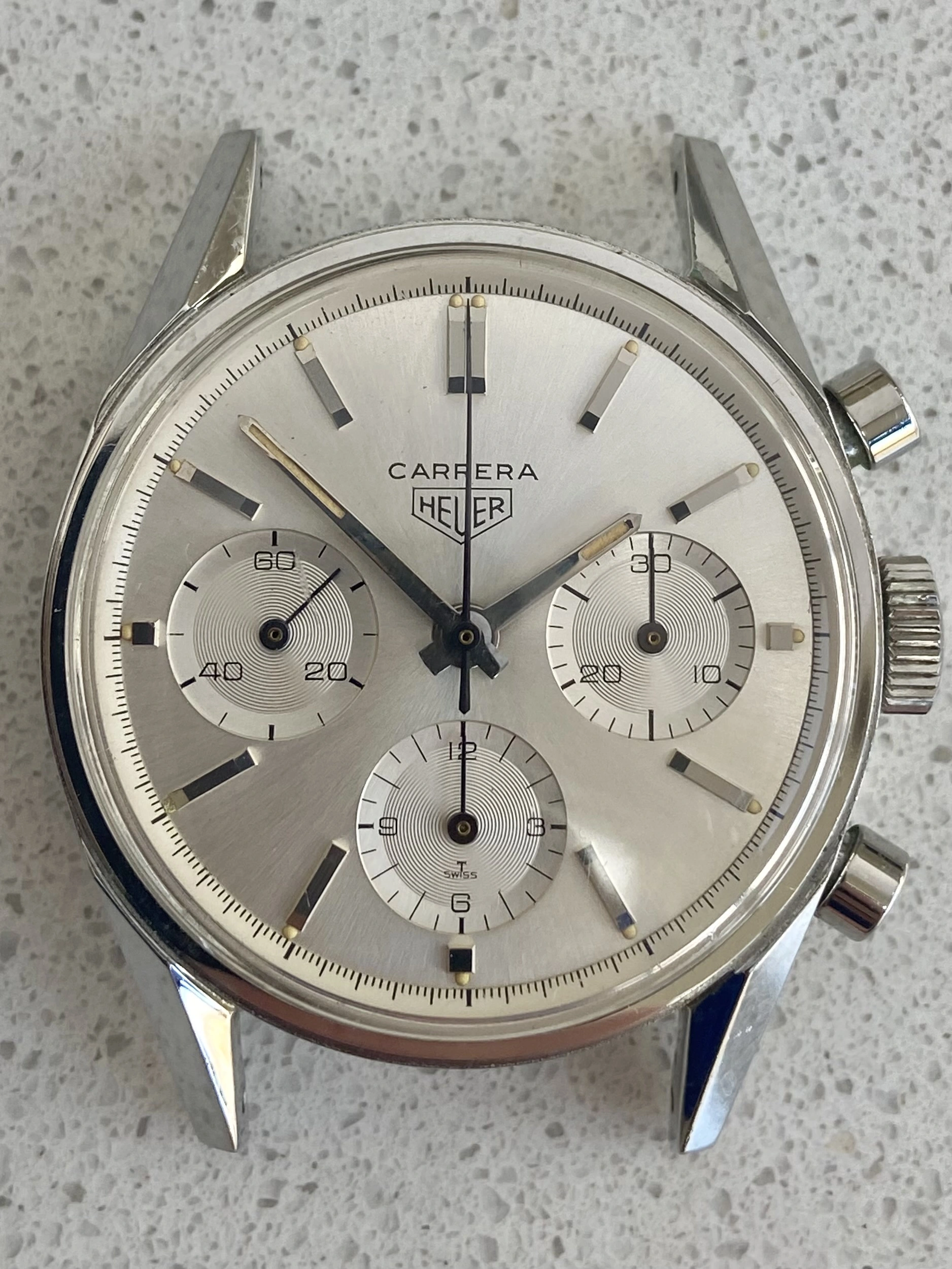An early-ish first ex Carrera 2447s. Not the very first as these came with the eggshell dial, but the next iteration with silver sunburst dial, narrow hour markers and plain hands. This one has a T Swiss dial but still an early enough serial for the large unsigned crown.