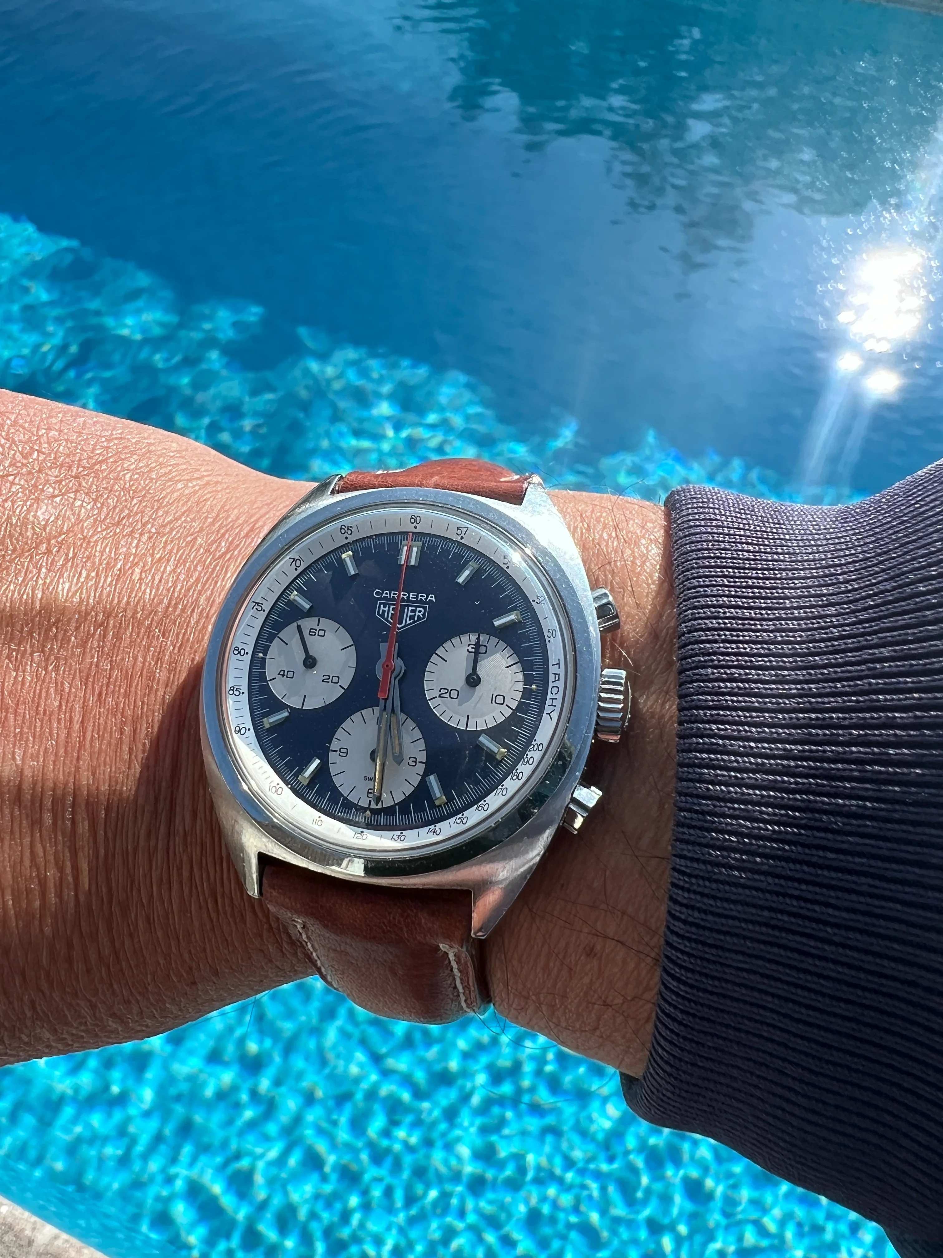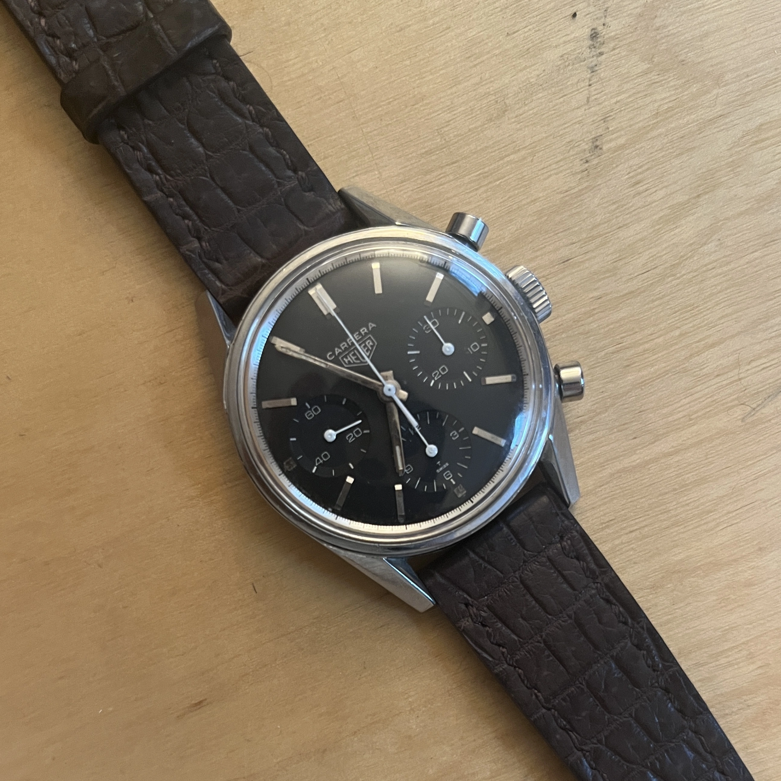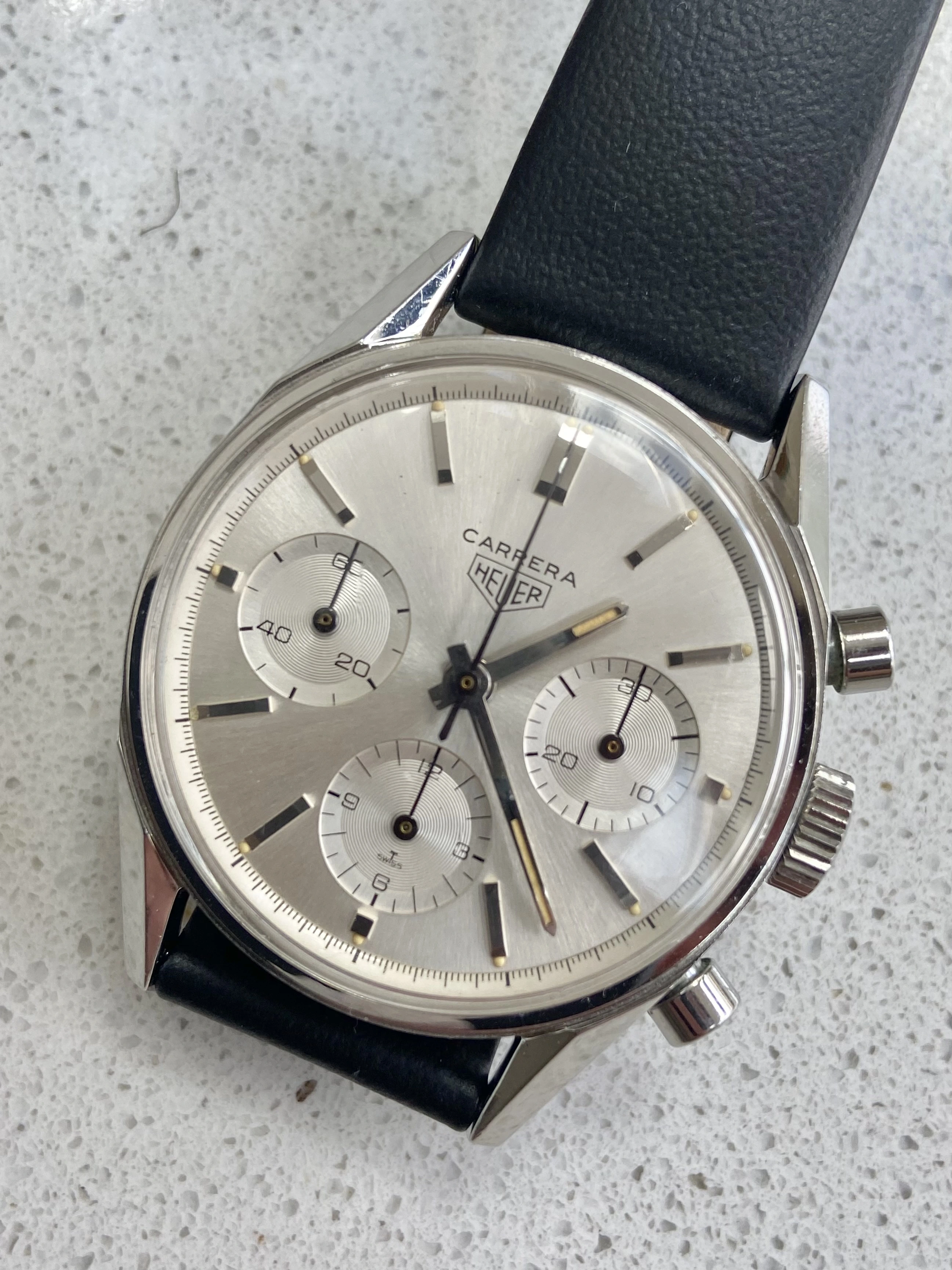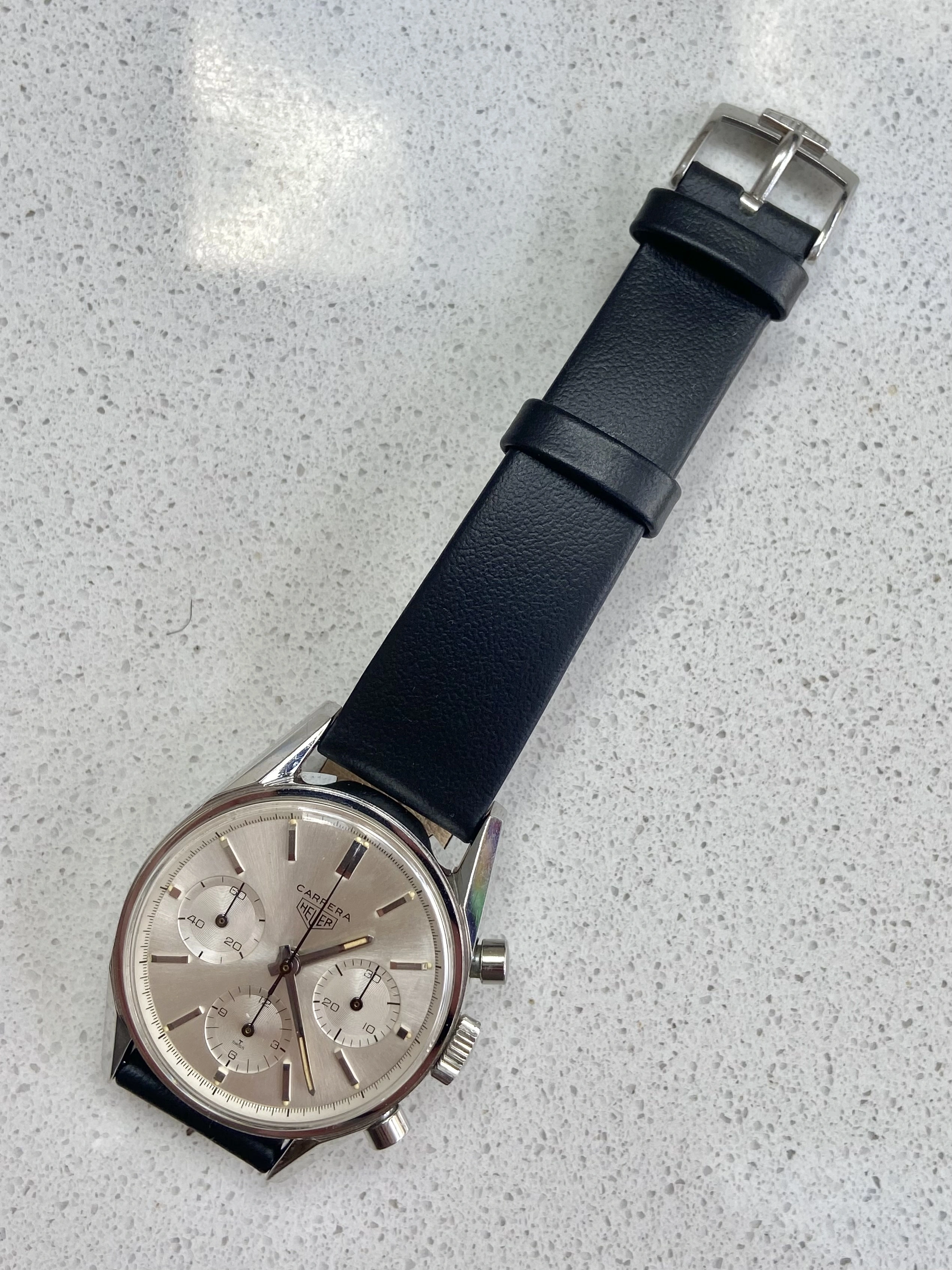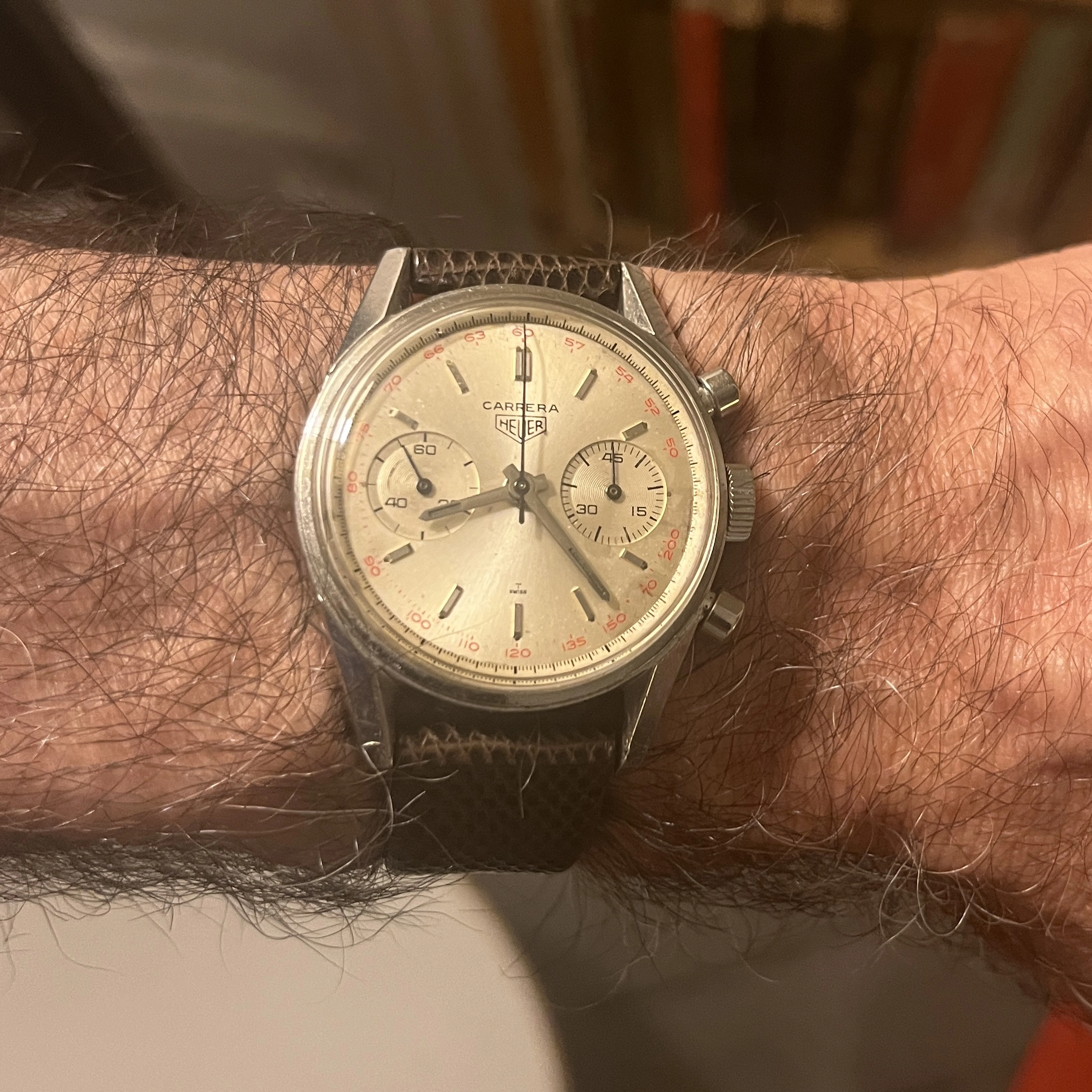 Here’s mine with a modern strap and vintage buckle. As I’ve learnt recently the straps used on early Carreras were devoid of stitching so I tried to find something along those lines to complement it.
