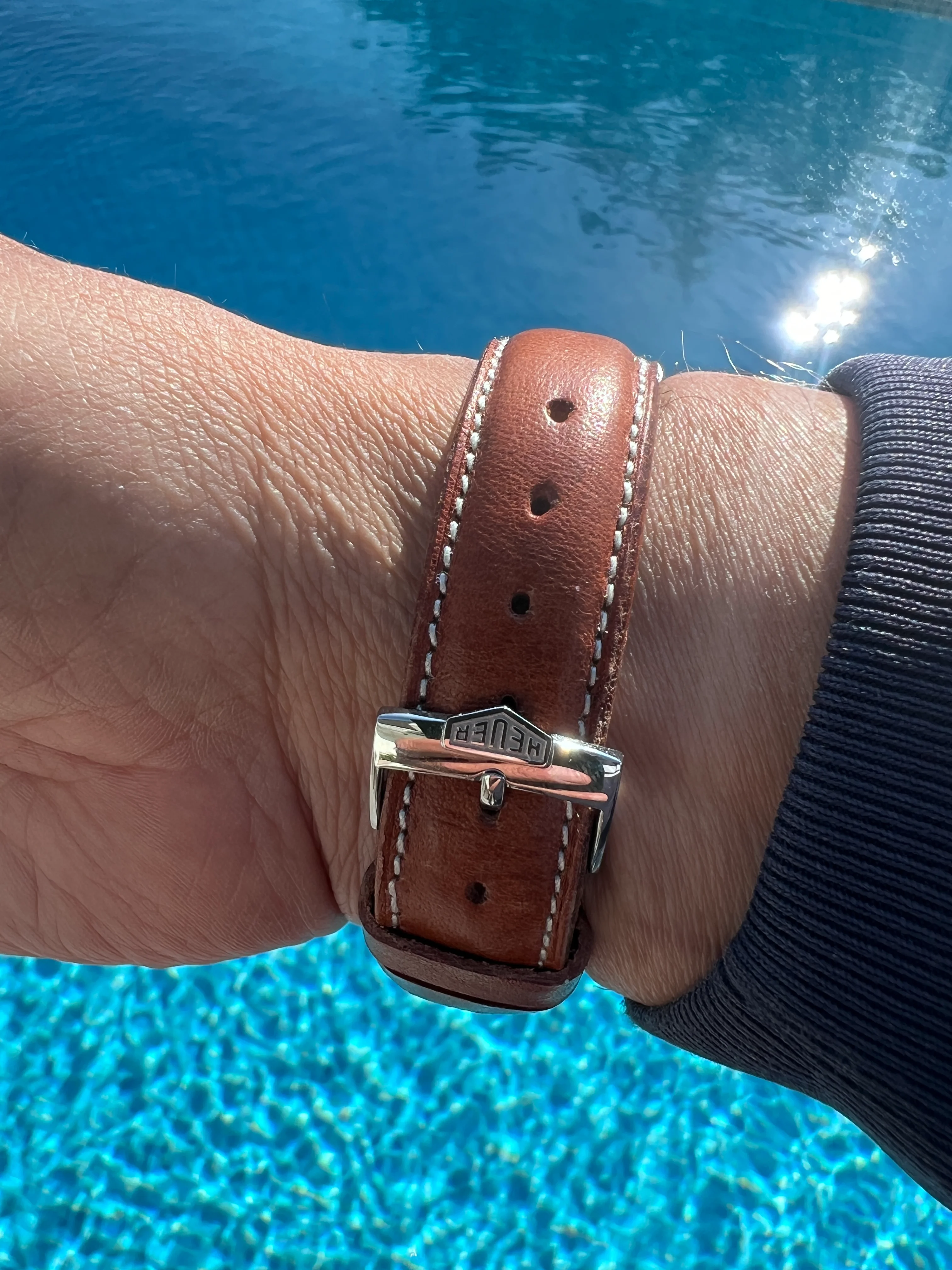 Looking good! Period Heuer ‘sun’ buckles aren’t easy to find but they do set the watch off nicely. Have you considered a racing or Corfam style strap?
