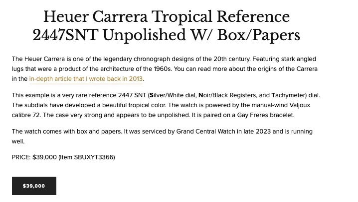 High, but not extreme. These prices are in GBP, so 6350 in EUR for a private sale and 7800 for a dealer sale, when in mint condition. Have seen multiple dealers posting for up to 9k and recently even a 10k 3647 NT. Source: https://www.heuerpriceguide.com/carrera-1960s-price-guide