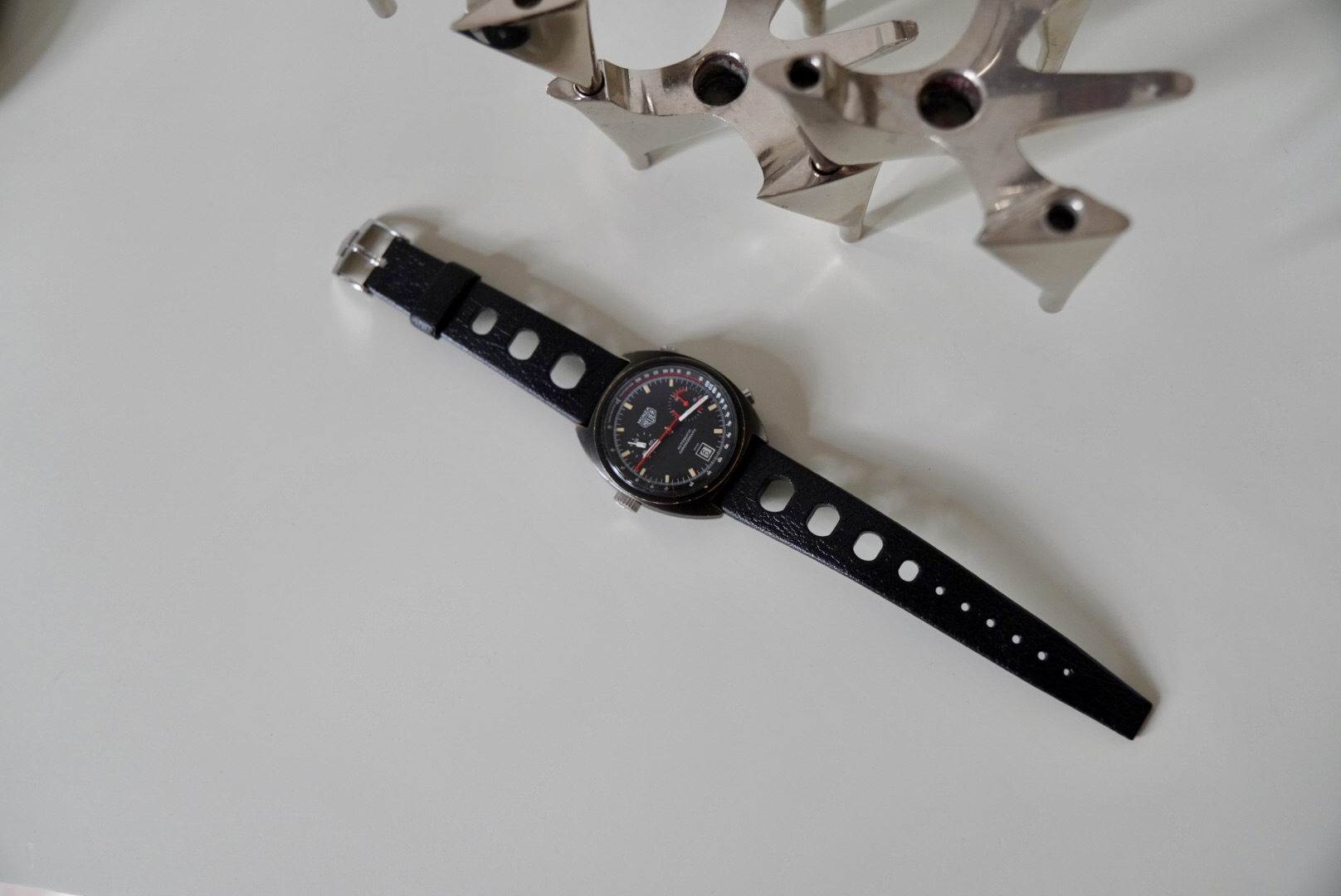The strap of the watch is a contemporary Vintage Tropic Sport strap with an original Heuer clasp.