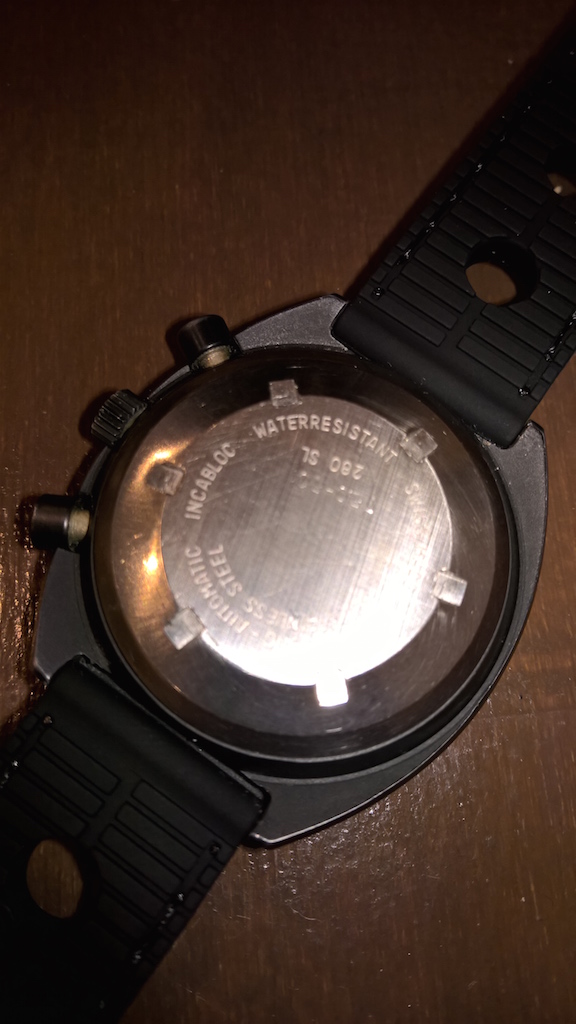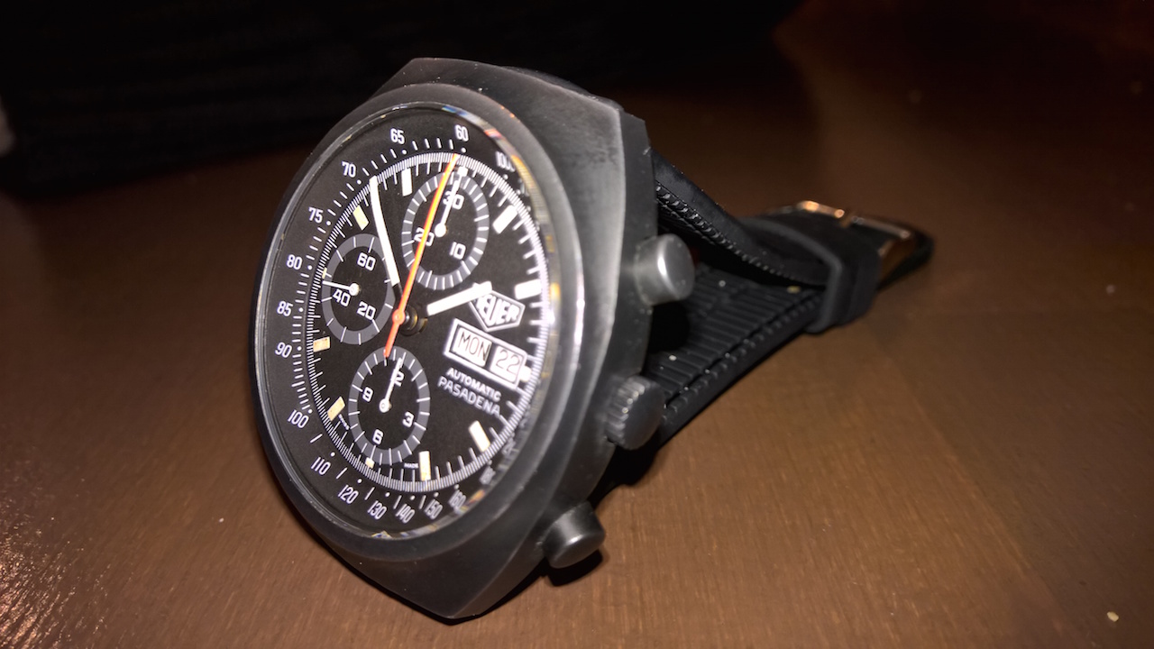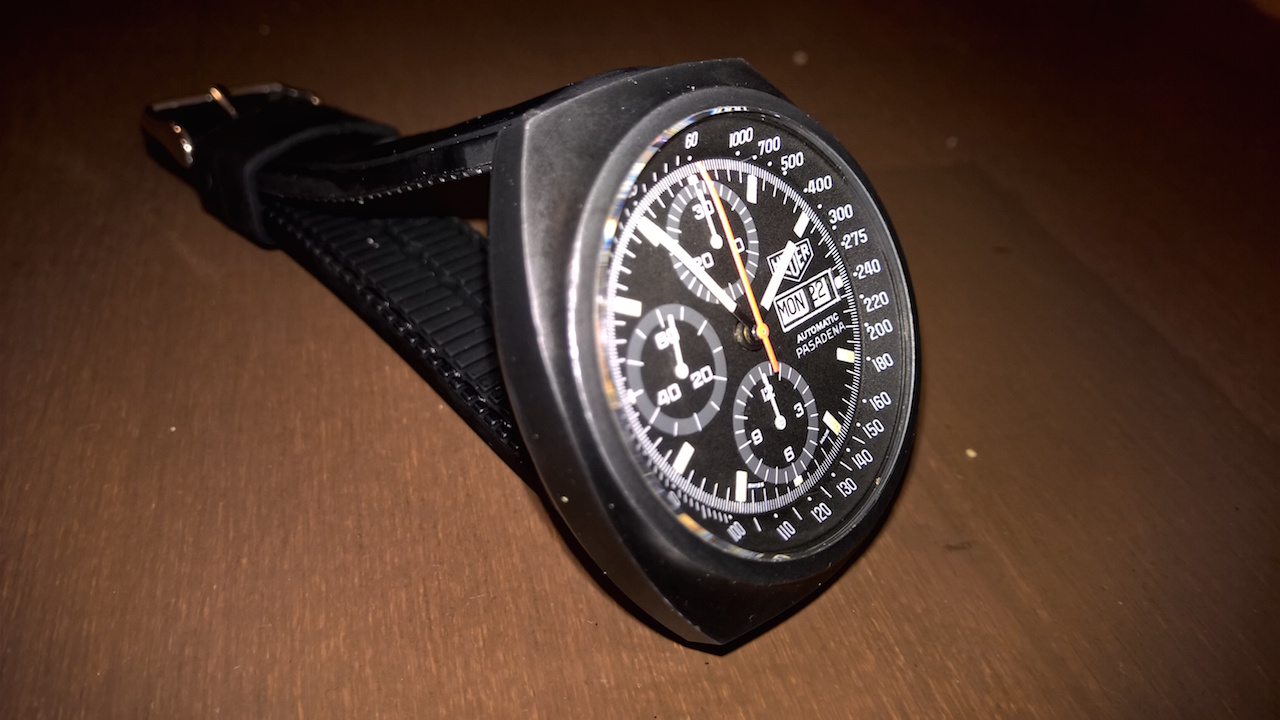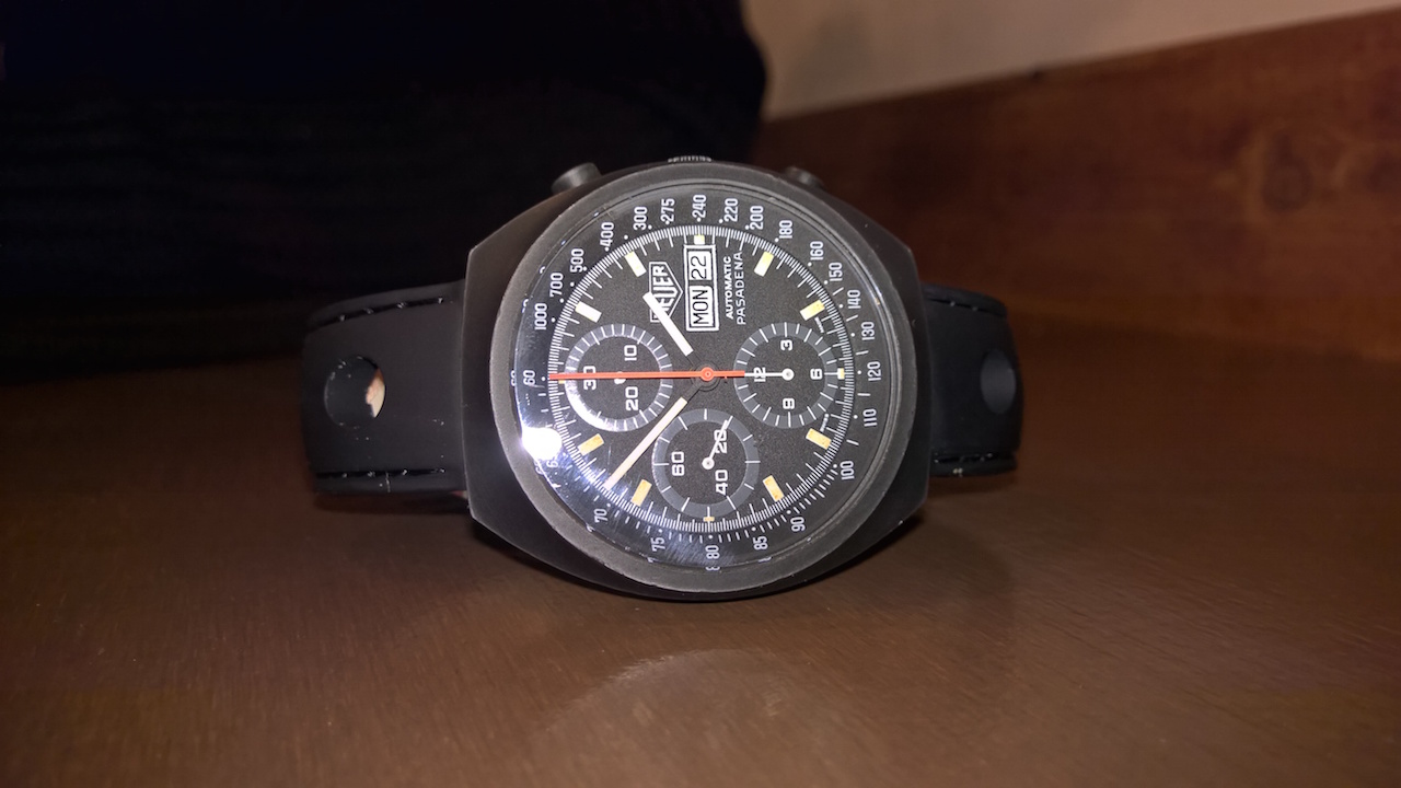 ยทFor sale is a black Heuer Pasadena 750.501 in all original condition from the 70ies in great condition. The watch comes on an unworn, sporty rally strap. The tritium dial is perfect, no chips or scratches as well as the tritium hands. The caliber valjoux 7750 runs good.