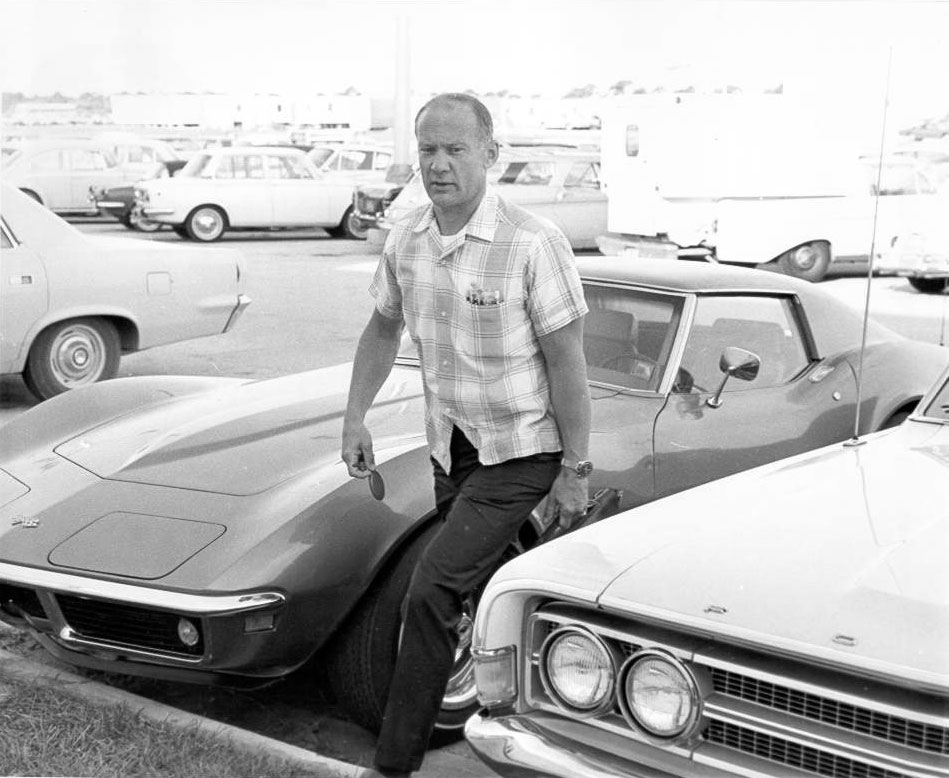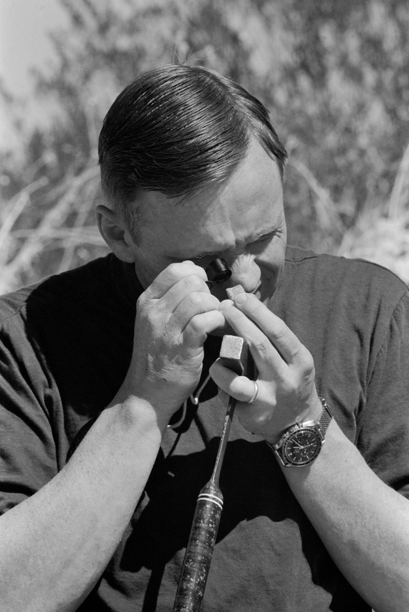 Neil examines a rock sample during the Sierra Blanca trip. He is holding a geology hammer in his left hand and is wearing an Omega Speedmaster watch. Journal contributor Dan Buchan notes "his watch shows 1:12:33." 24 February 1969.