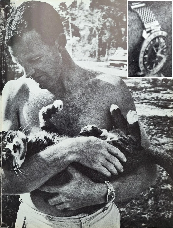 Interesting LIFE magazine photo showing NASA "Mercury 7" astronaut Gordon "Gordo" Cooper holding his cat, wearing an Accutron Astronaut GMT pilot watch on a lightweight steel Jacoby Bender Champion bracelet. Between 1962 & 1965 Cooper has been spotted with both the one line & two lines dial versions of this battery-powered tuning fork movement Accutron.