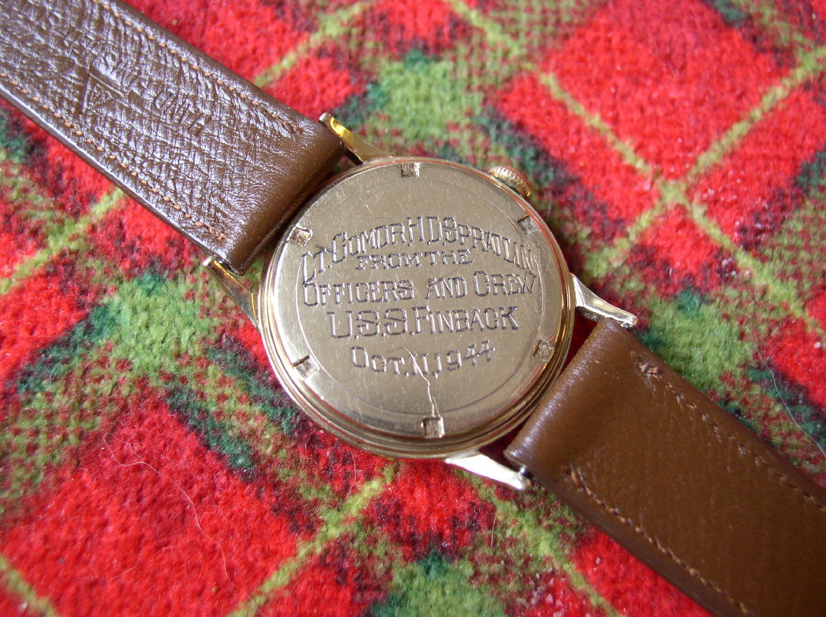 ·I mentioned this watch below but thought I'd add a few more pics. Interesting that this watch doesn't have a serial number. Was that the norm for the 14k models? The owner of the watch was involved with the Bush rescue in Sep 1944 and got his own command in Oct 1944 so the crew of the Finback probably took up a collection and presented him this watch. Pretty expensive piece in 1944 dollars. (Still trying to figure out how the pics work on this site).