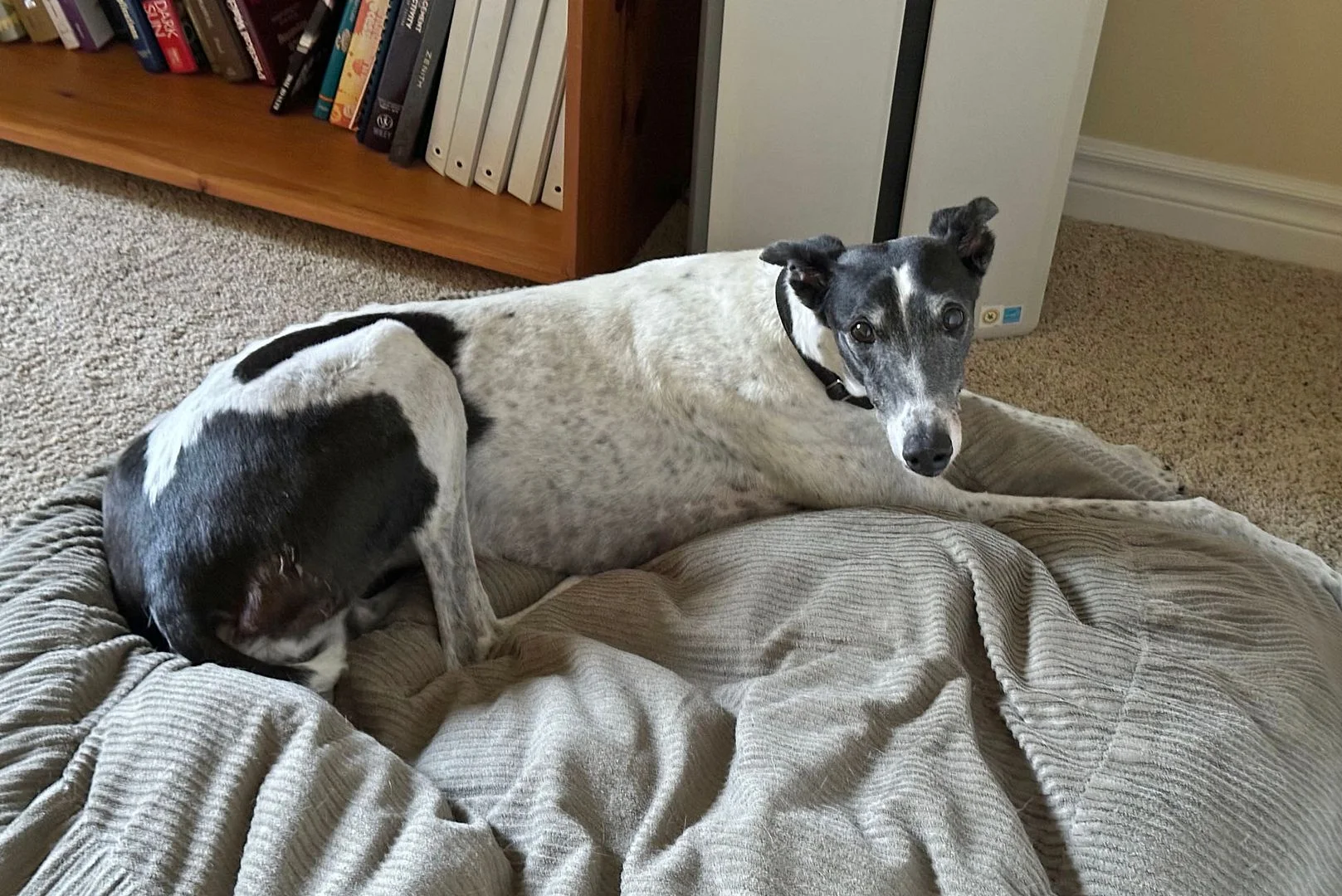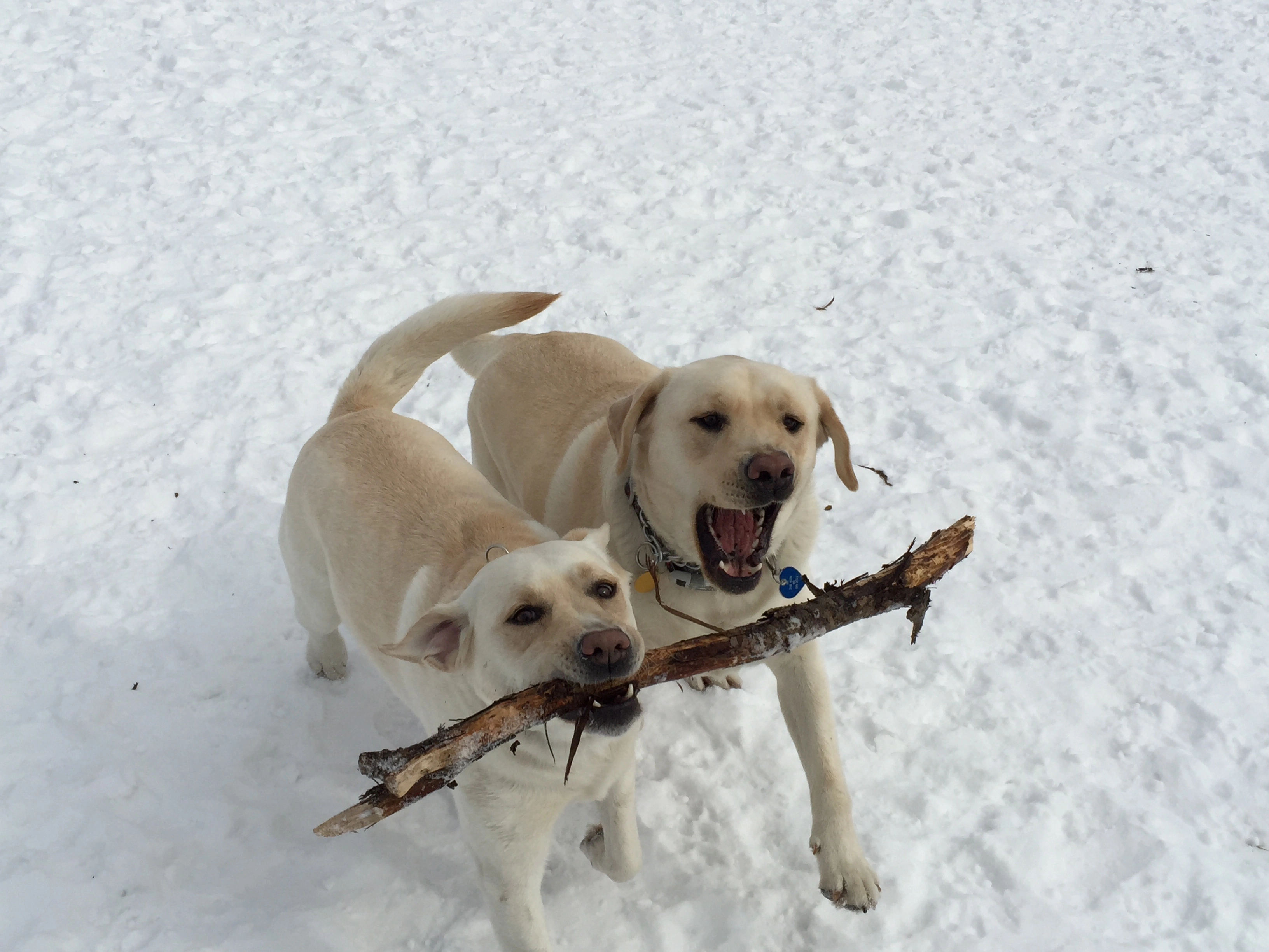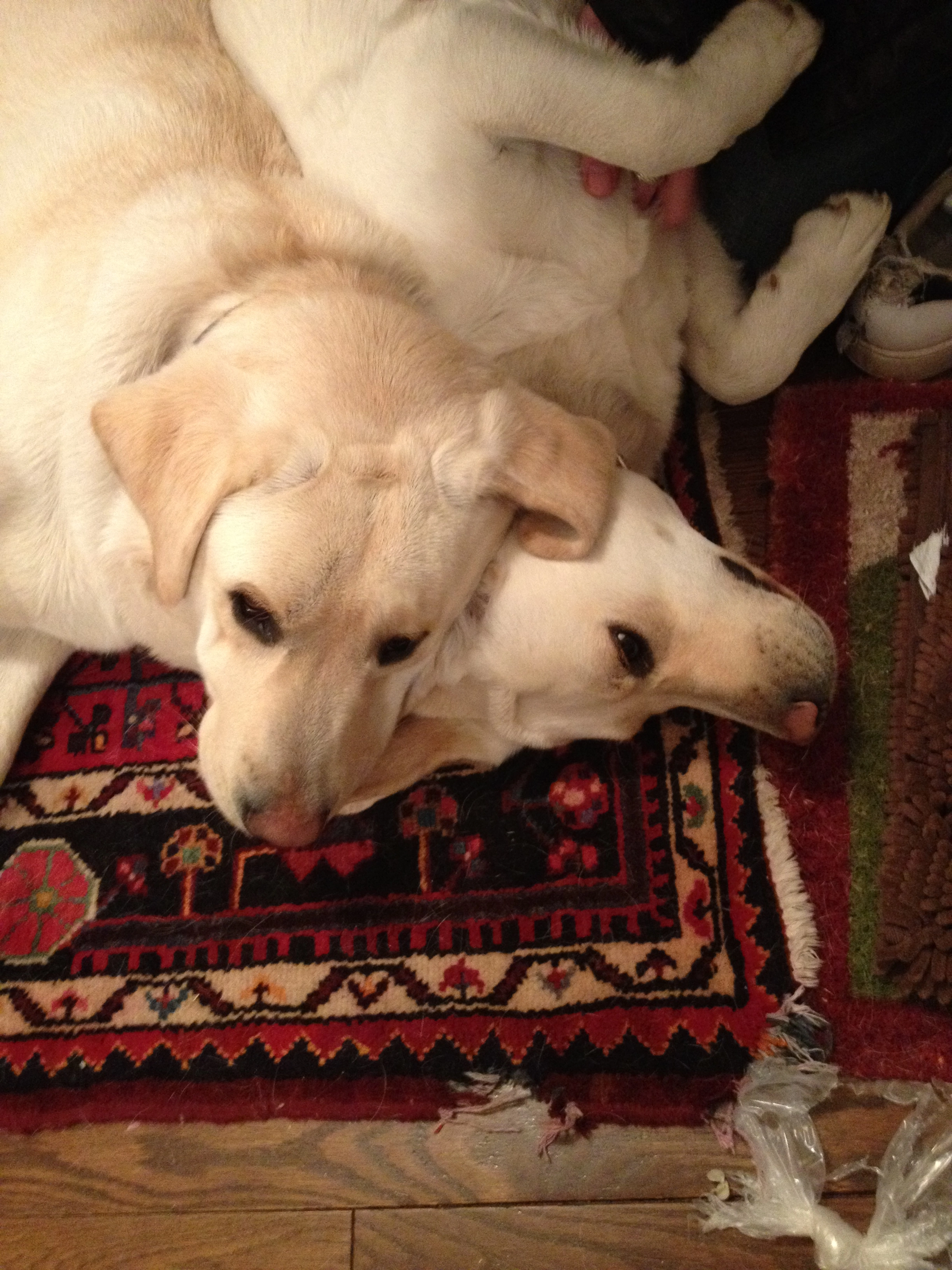Maeve, our Whippet, can be snotty to other dogs in the house, but fortunately not only is Pearl big enough so that Maeve won't get too heated, they know each other well as Maeve has stated at Pearl's house for weeks at a time when we were on vacation.