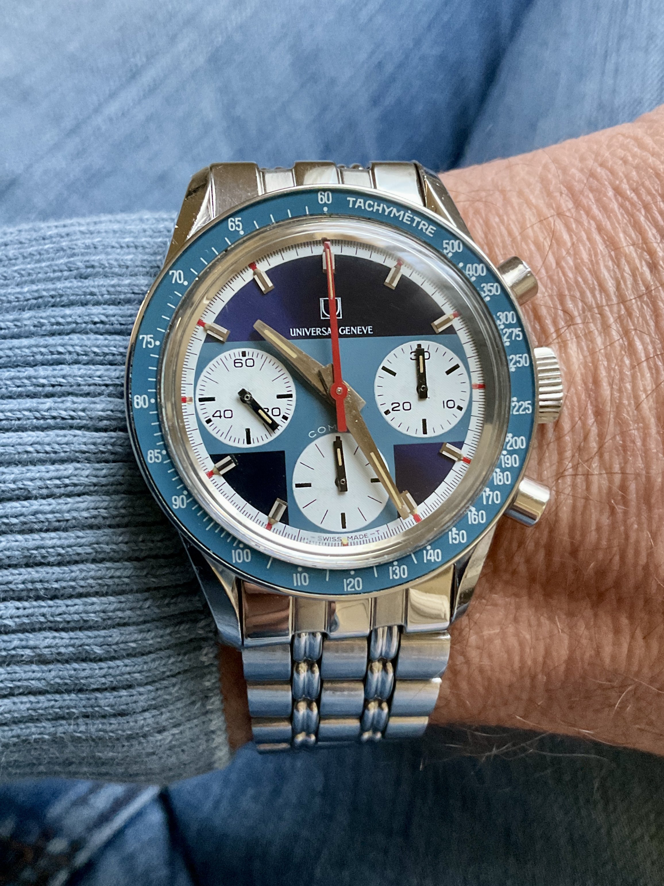 Hodinkee was giving the bounce to a very nice film Compax up for auction. The writer (I paraphrase) ) said that UG is mainly known for their chronographs and designs from the 40’s and 50’s and that few are talking about them these days. Fighting words, especially coming from the Dink who relentlessly pumped the brand back in the day, …so let’s talk about how we came to appreciate the brand.