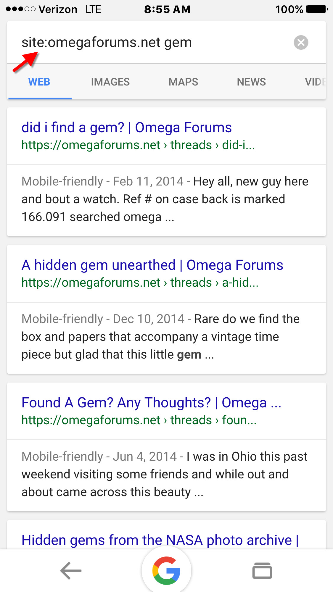 Not to worry. Just go to Google and do a search as indicated below by the red arrow. This approach is also very useful when searching Omega's official web site for a watch reference that is no longer in the current catalogue.