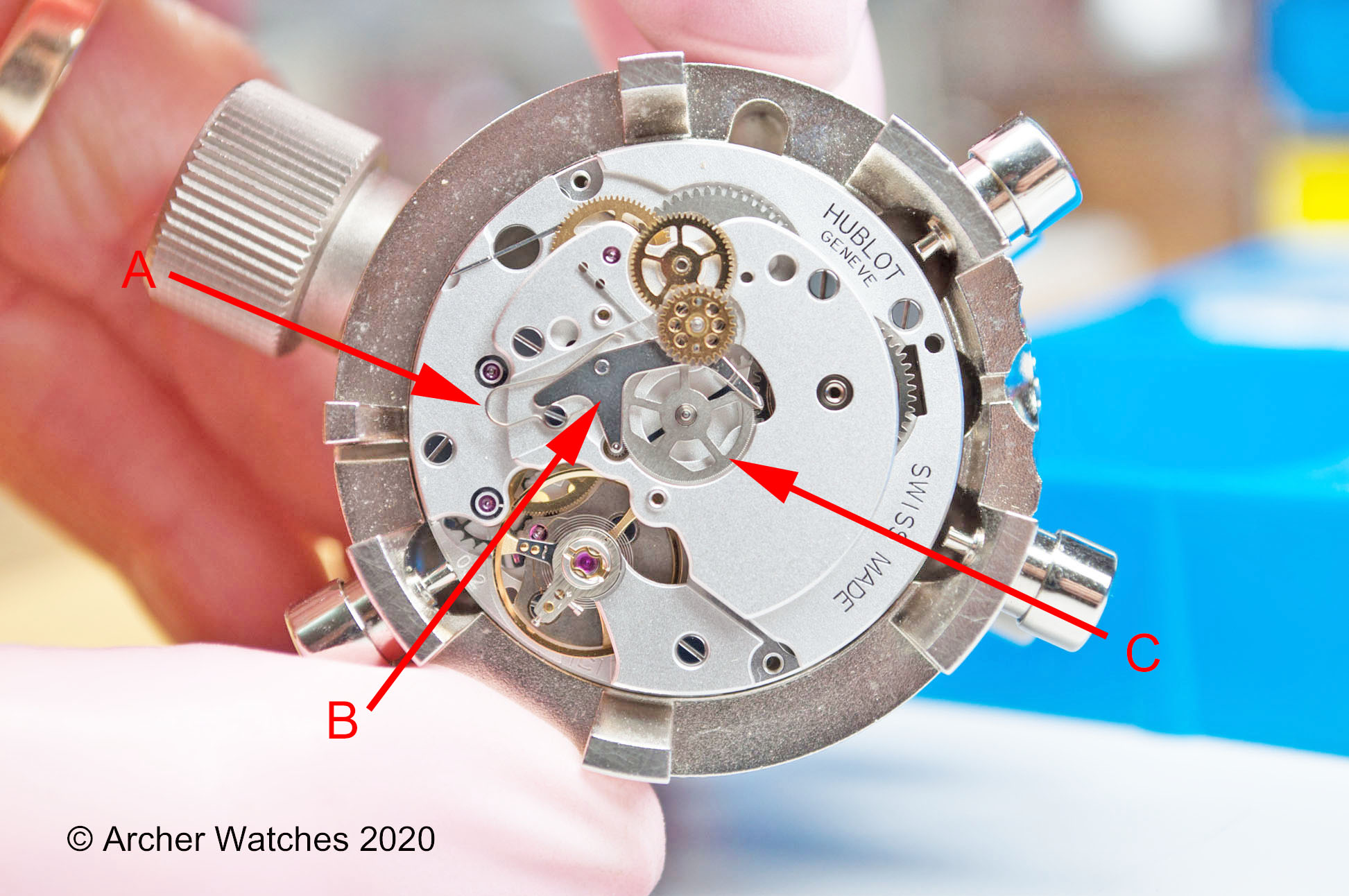 "A" is the spring for the 2 function clutch, "B" is the two function clutch, and "C" is the chronograph wheel. They have used the chronograph wheel as the central seconds wheel, and are essentially running the chronograph all the time. The two function clutch is always pushing the oscillating pinion into contact with the chronograph wheel as you can see here before I took it apart: