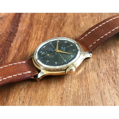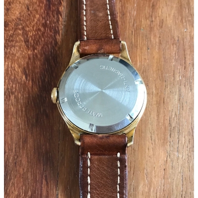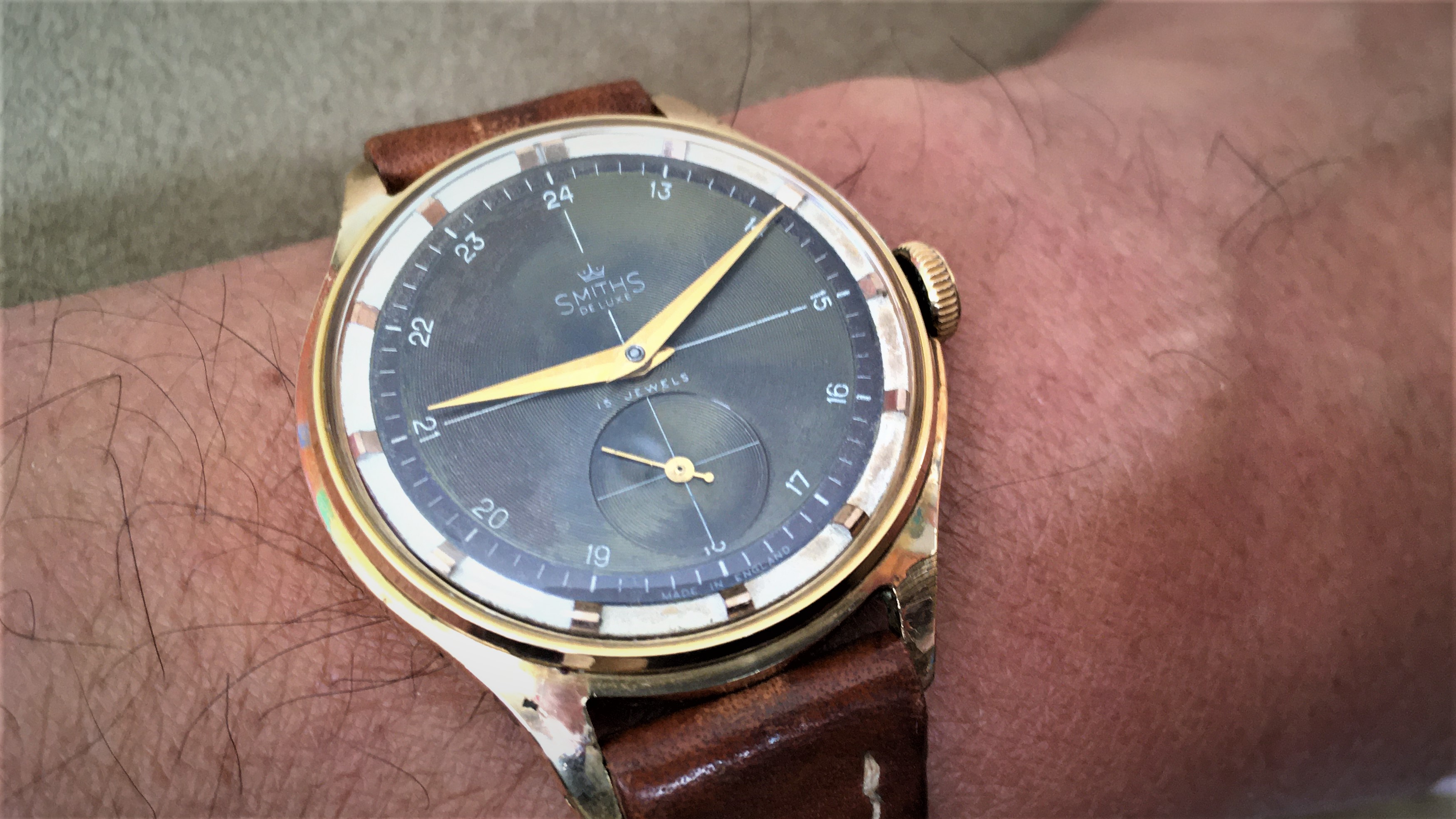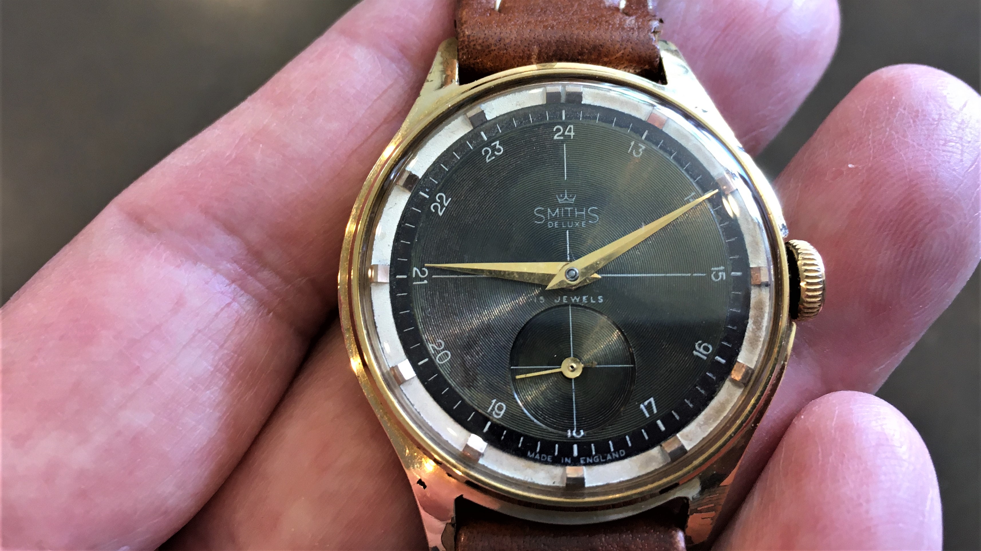Here are some watch specs: the dial is large at 35.5mm, a thickness of approximately 7mm and 17mm lugs. Of note is the striking dial with an incredible greenish-grey patina and radial grooves. I read, but cannot confirm, that the original dial MAY have been a bluish color that has changed over time to this specific patina. There is tremendous dial color movement when the light strikes, especially outdoors. The dial is enhanced by gold hour-minute hands and a small seconds; and of course, contains "Made in England". I am not sure of the 24-hour notations on the outside of the dial as there is no apparent GMT function. The case is gold-plated, you'll notice some wear but overall is very beautiful. The movement is a caliber 400/12.15 (12 ligne and 15 jewels), and would have been manufactured in the Cheltenham factory. This Smiths is reported to be an anti-magnetic watch, hence targeted as a watch for scientists and atomic engineers.