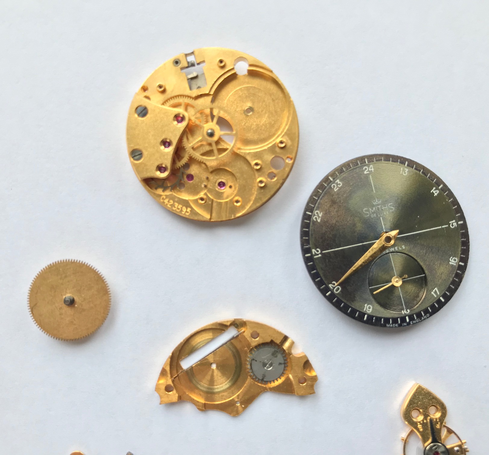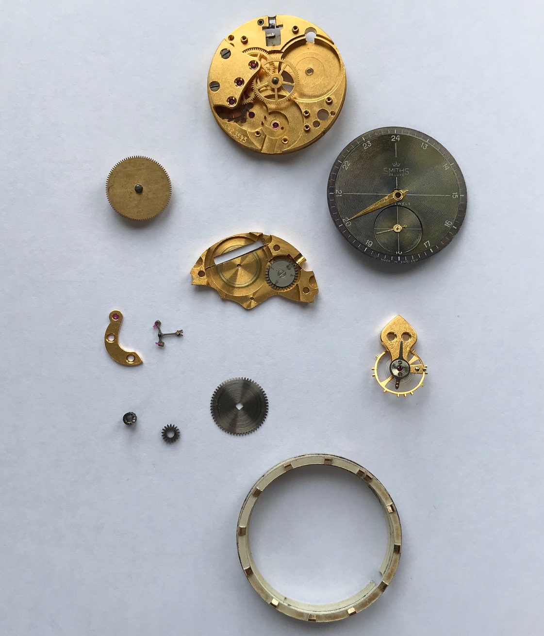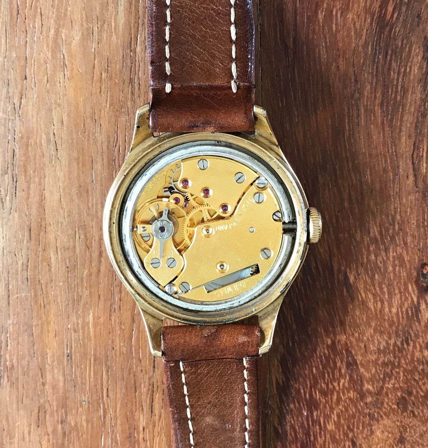 Here are some watch specs: the dial is large at 35.5mm, a thickness of approximately 7mm and 17mm lugs. Of note is the striking dial with an incredible greenish-grey patina and radial grooves. I read, but cannot confirm, that the original dial MAY have been a bluish color that has changed over time to this specific patina. There is tremendous dial color movement when the light strikes, especially outdoors. The dial is enhanced by gold hour-minute hands and a small seconds; and of course, contains "Made in England". I am not sure of the 24-hour notations on the outside of the dial as there is no apparent GMT function. The case is gold-plated, you'll notice some wear but overall is very beautiful. The movement is a caliber 400/12.15 (12 ligne and 15 jewels), and would have been manufactured in the Cheltenham factory. This Smiths is reported to be an anti-magnetic watch, hence targeted as a watch for scientists and atomic engineers.