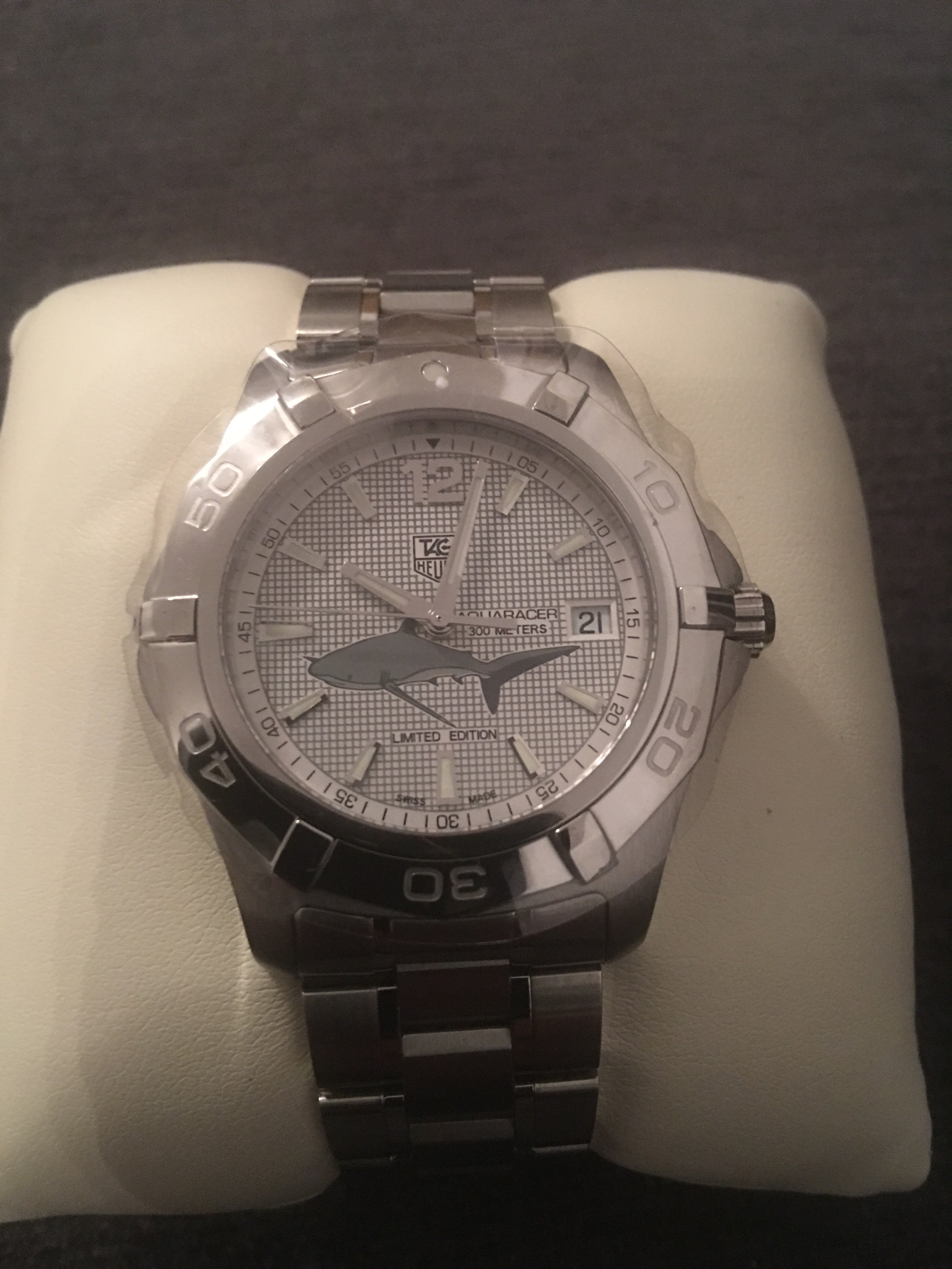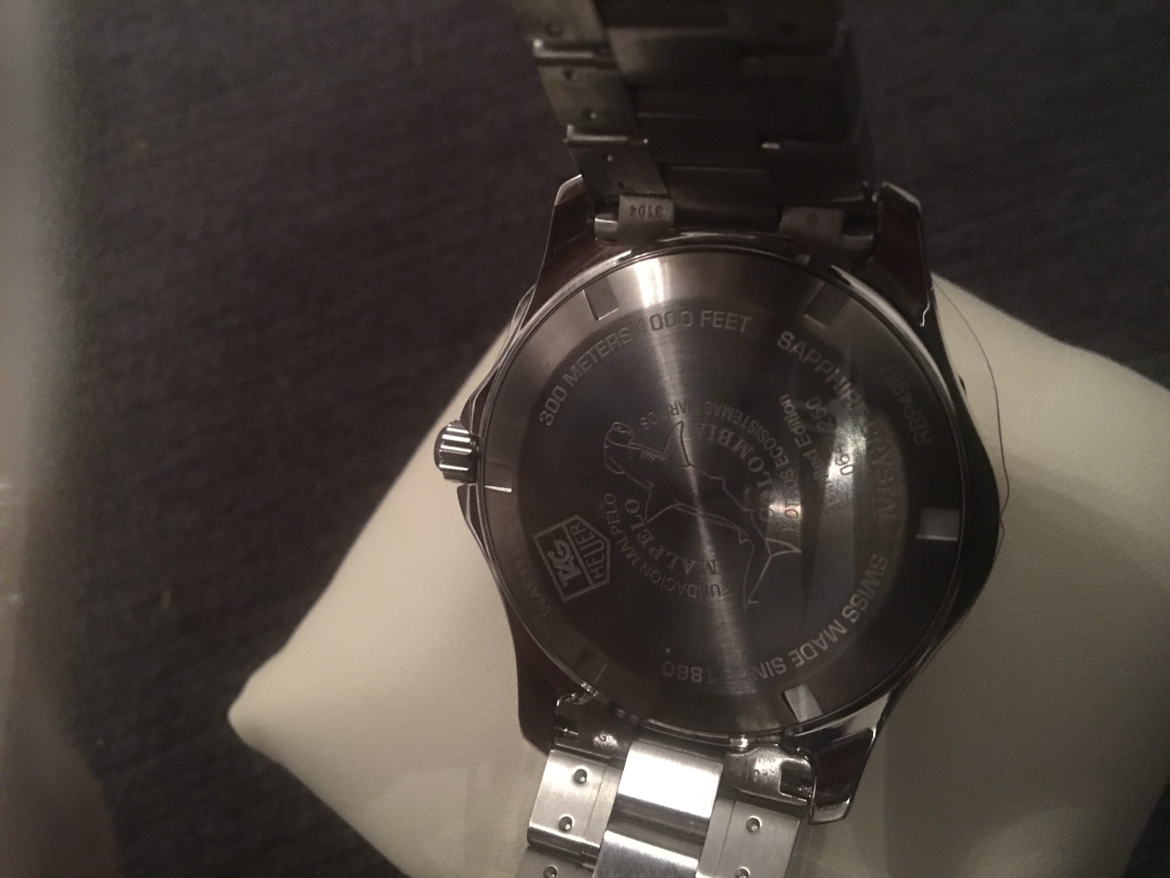 Hi. Your watch is a limited editon that TAG Heuer Colombia made for the Fundación Malpelo. The Foundation works on conservation issues in Colombia, with a focus on Malpelo Island- an isolated Island known for its shark population, and especially Hammerhead Sharks and Silky Sharks- which is why you have a Hammerhead on the back and a Silky Shark on the front.