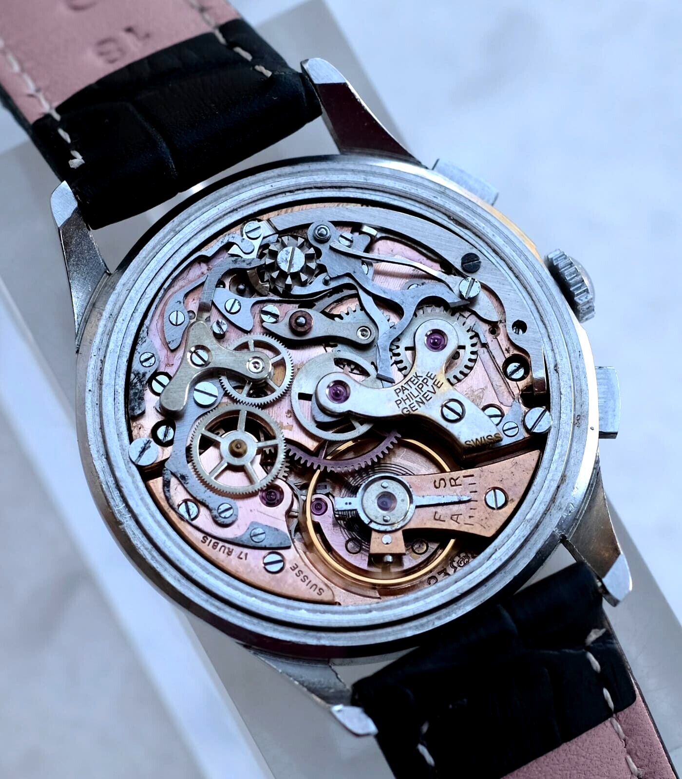 The seller is up-front that the movement has been recased, but I think that's just the tip of the iceberg. The description seems a little too perfectly worded. "Authentic [...] dial" but no claim that it hasn't been refinished or repainted. The movement is an "authentic Valjoux 23" and, indeed it does look like an actual Valjoux 23, though not in great shape. But it's definitely not the Patek version, as those were rather heavily modified by PP. The "authentic Patek Philippe bridge" on the movement looks like a joke. I can't imagine PP releasing something that crude. In fact, that claim alone makes me doubt everything else in the description.
