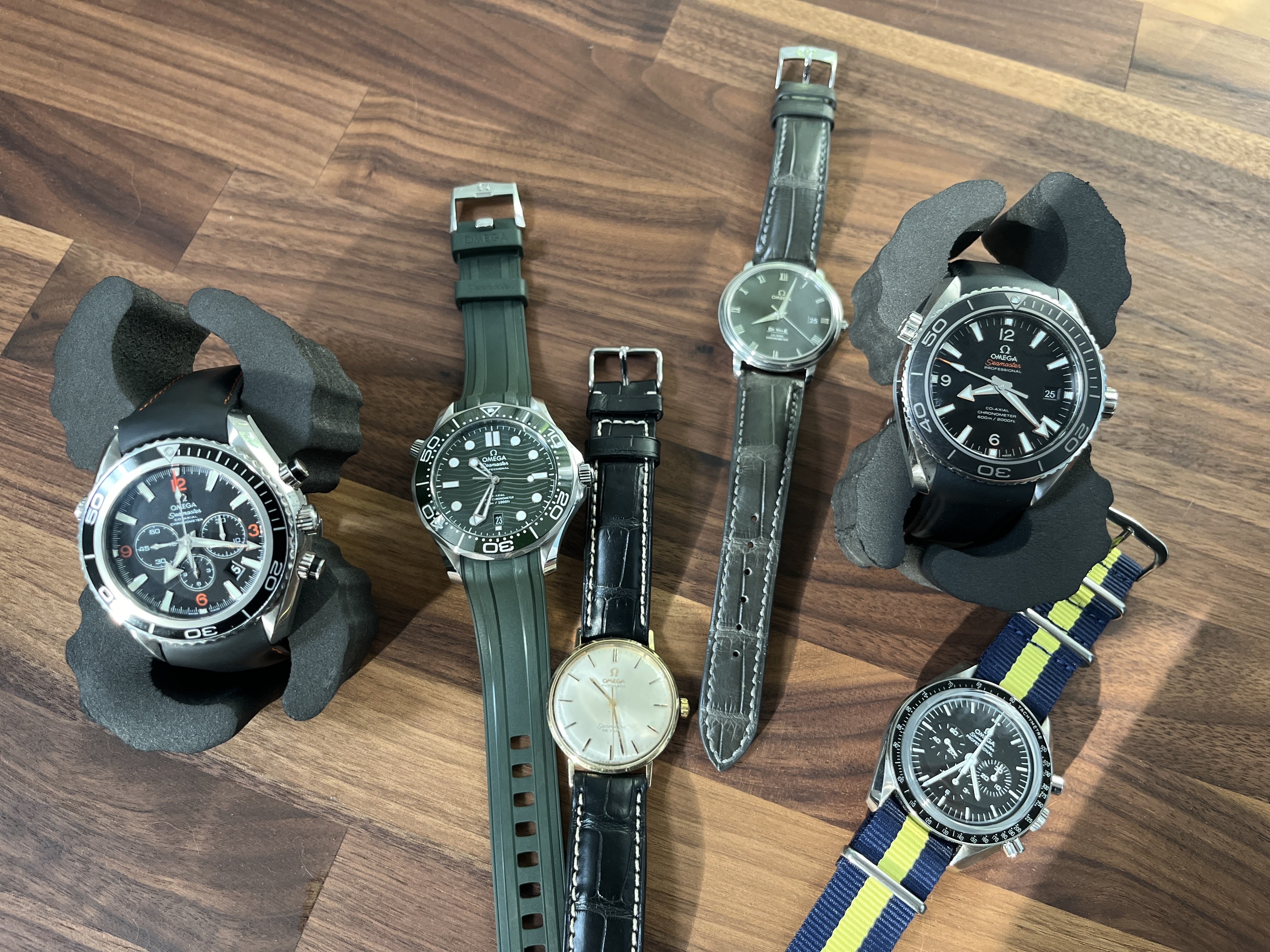 ·Howdy! I have been a bit of a lurker for quite a while but figured I would introduce myself as I've gotten heavier into watches the last couple of years. My other two obsessive hobbies (vehicles and firearms - open to trades!) seem to have waned in favor of them actually. Here's a shot of most of my Omega's. I have some other brands as well, but the bulk is focused on Omega. Two others are currently being serviced. I definitely find myself moving more towards the larger planet oceans (a creamsicle and a blue gmt are next), but I do love my speedy. And the devilles. And the AT in service...ugh, horological rabbit hole of hoarding!