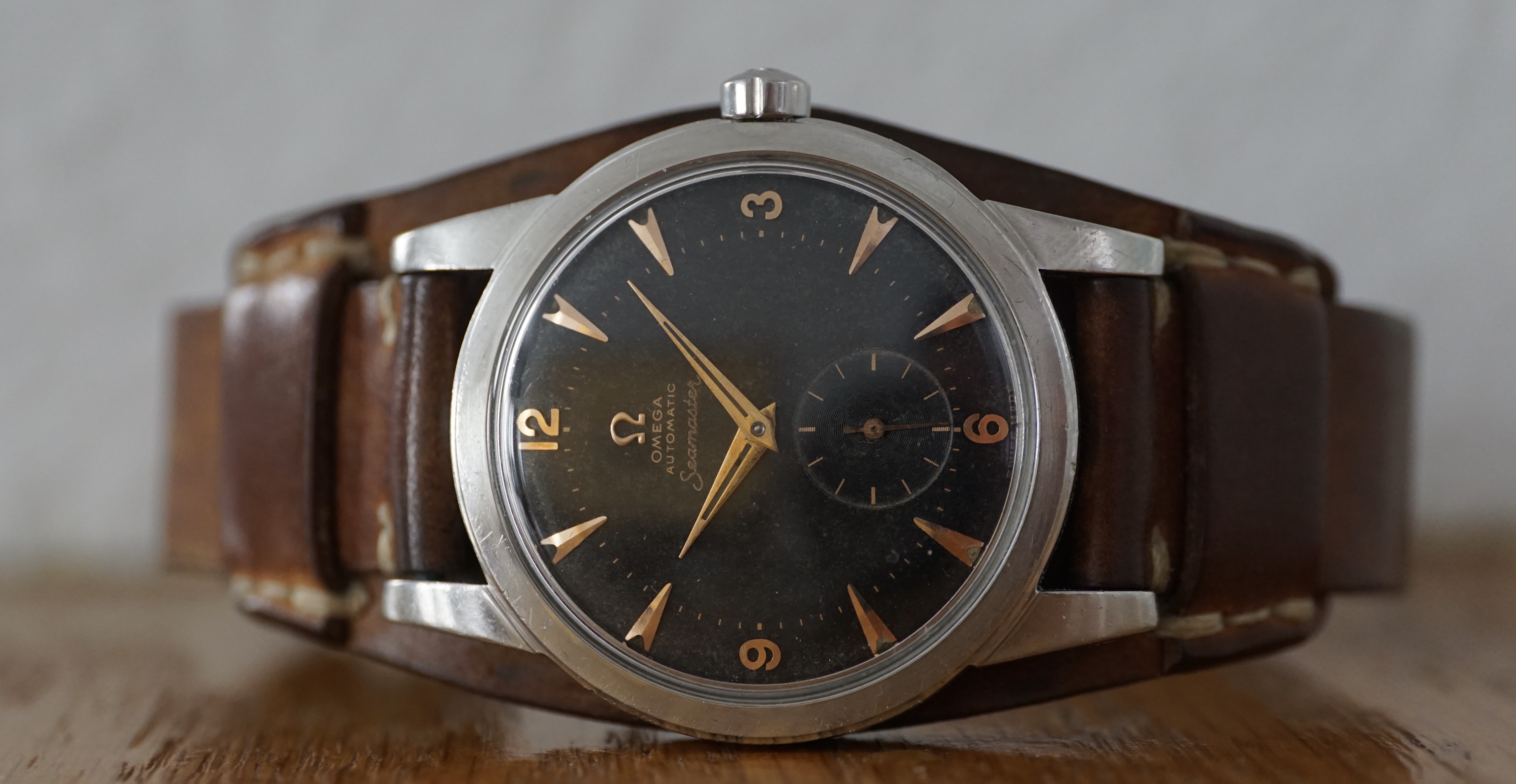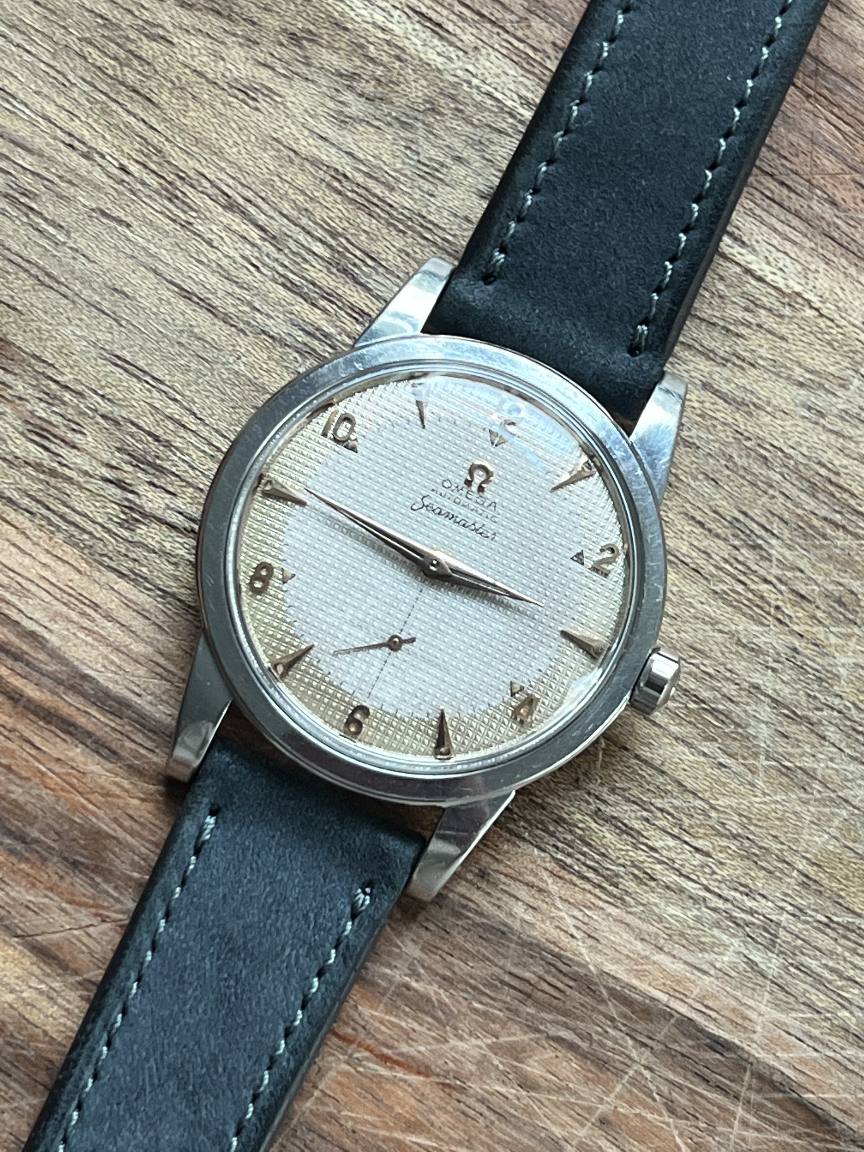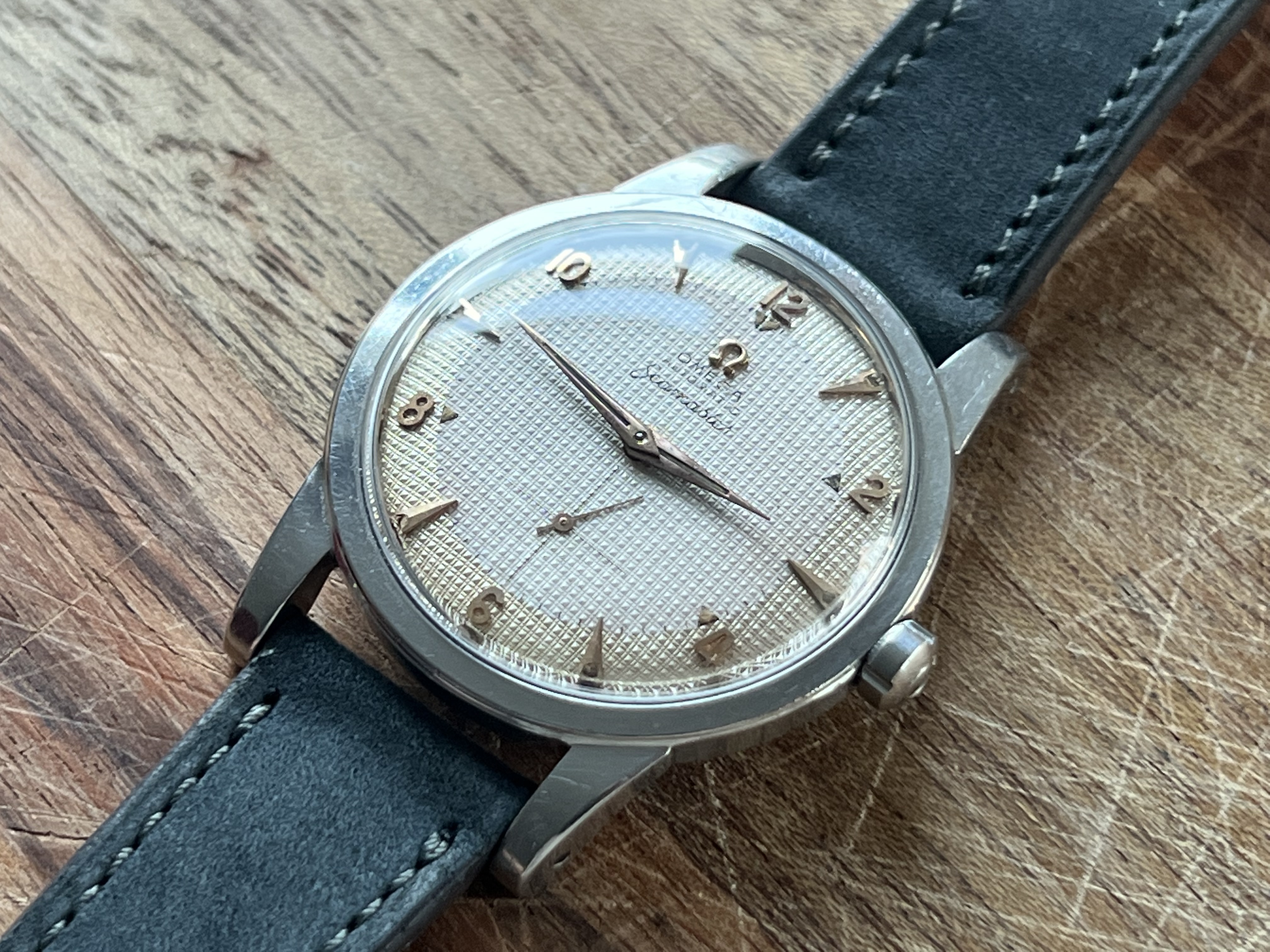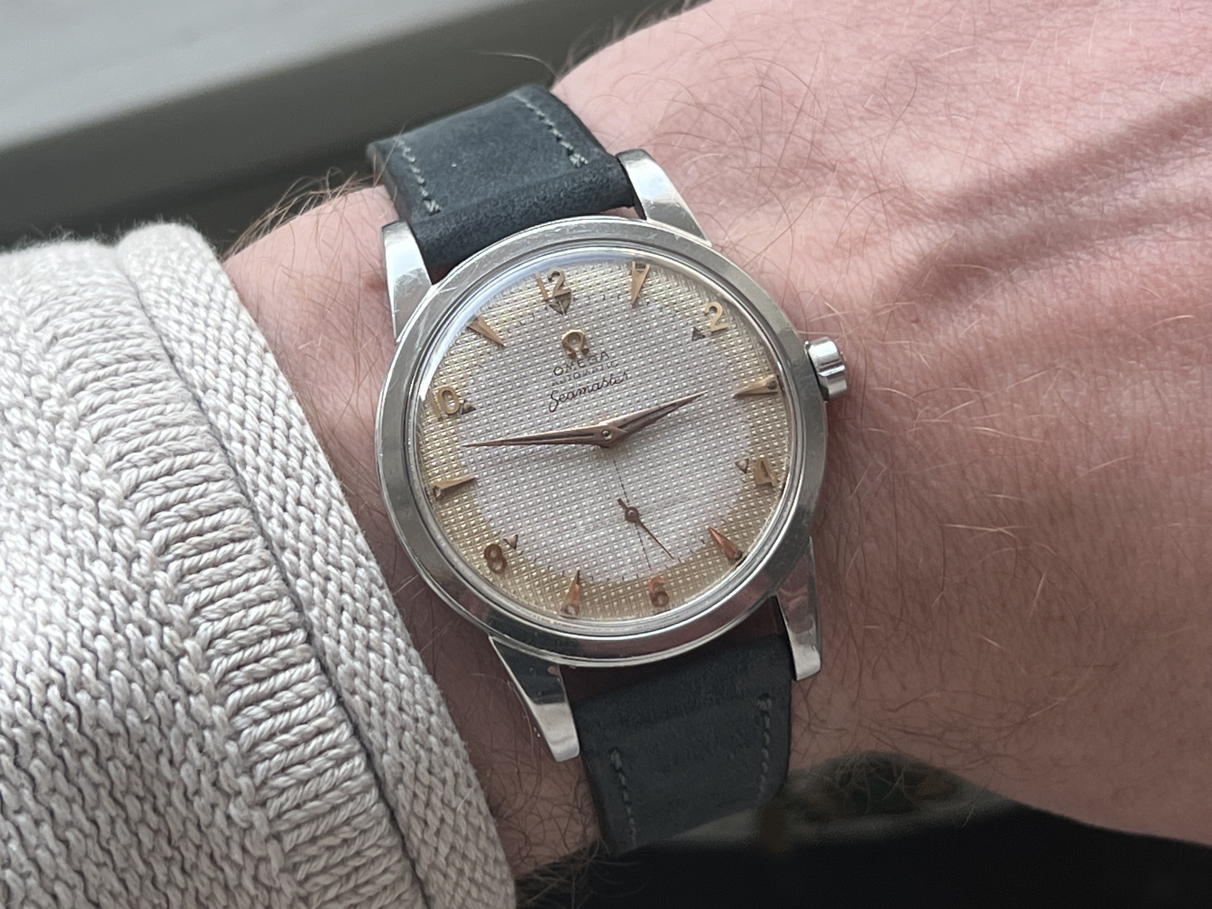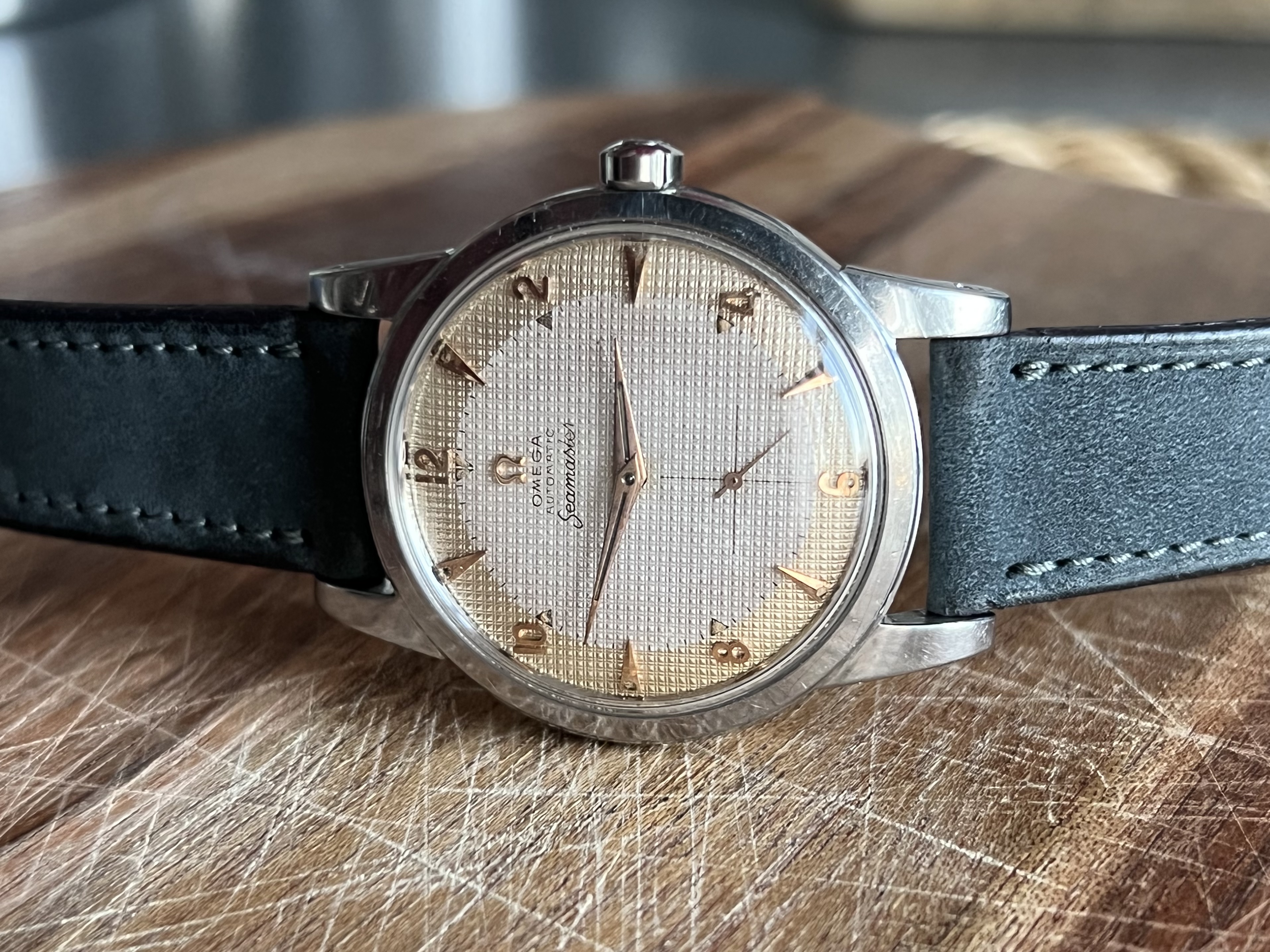 This one is a ca. 1953 Omega Seamaster 2657 - a 36mm “jumbo” reference. Stainless steel case, rose gold furniture, and most importantly a two-tone dial with, once again, a hobnail structure. And boy, do I like them.