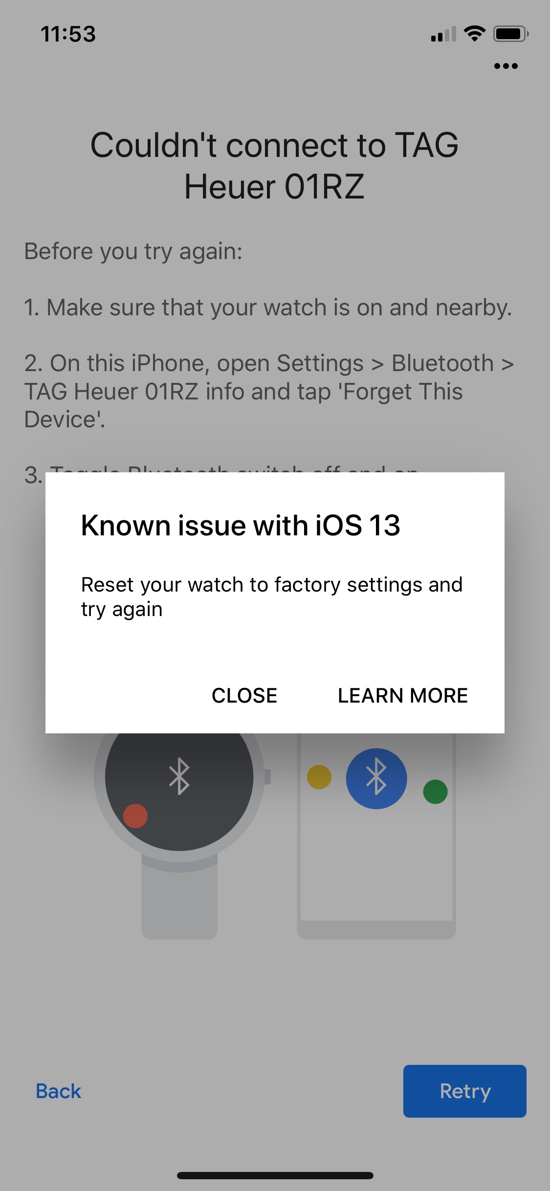 ·I've just upgraded to ther above and found that when pairing my Tag connect the wear os app, it says there are issues with IOS 13. I now have a watch that I cannot use as it was reset to factory settings.