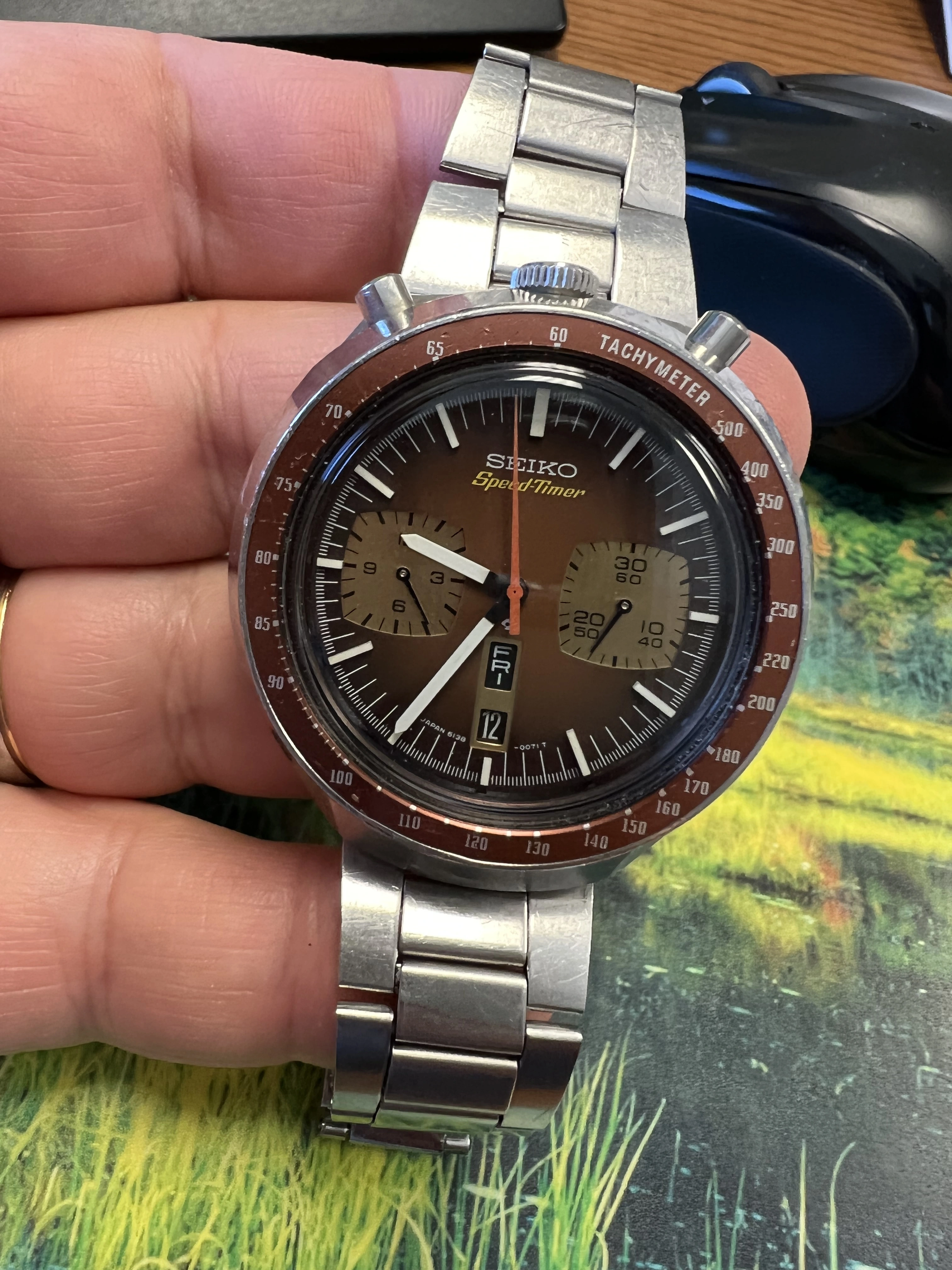 Seiko bullhead 6138-0040 came in 2 flavors, the brown “Root beer” and the “Black Horse” with black dial and blue subdials.