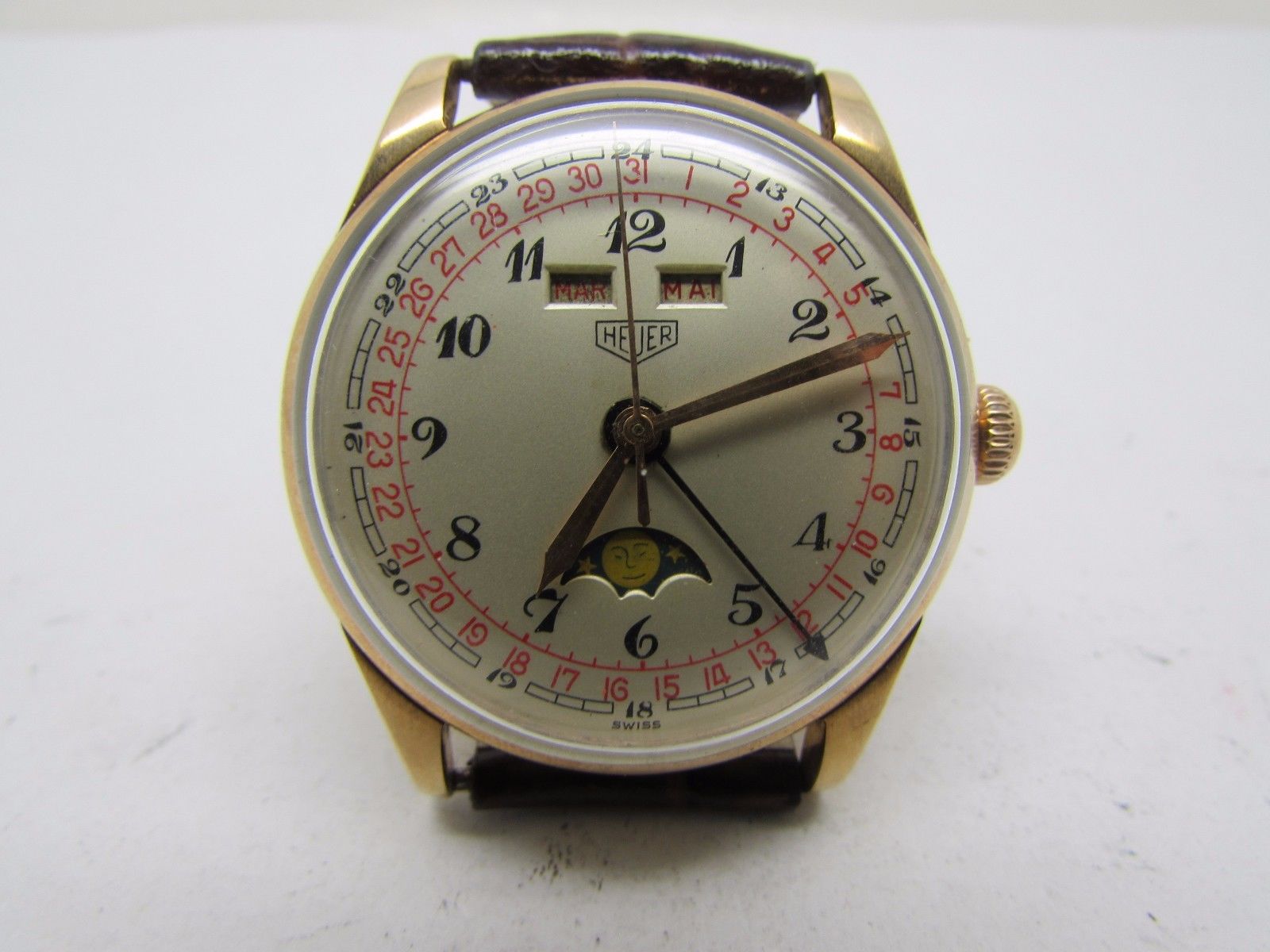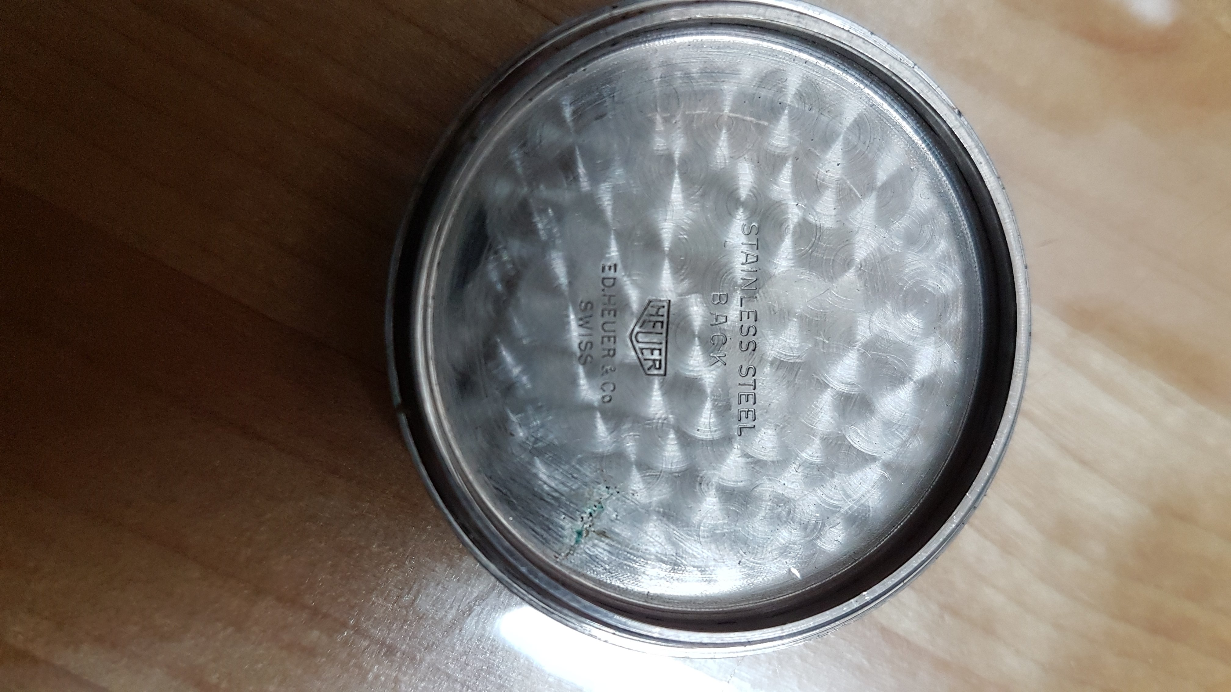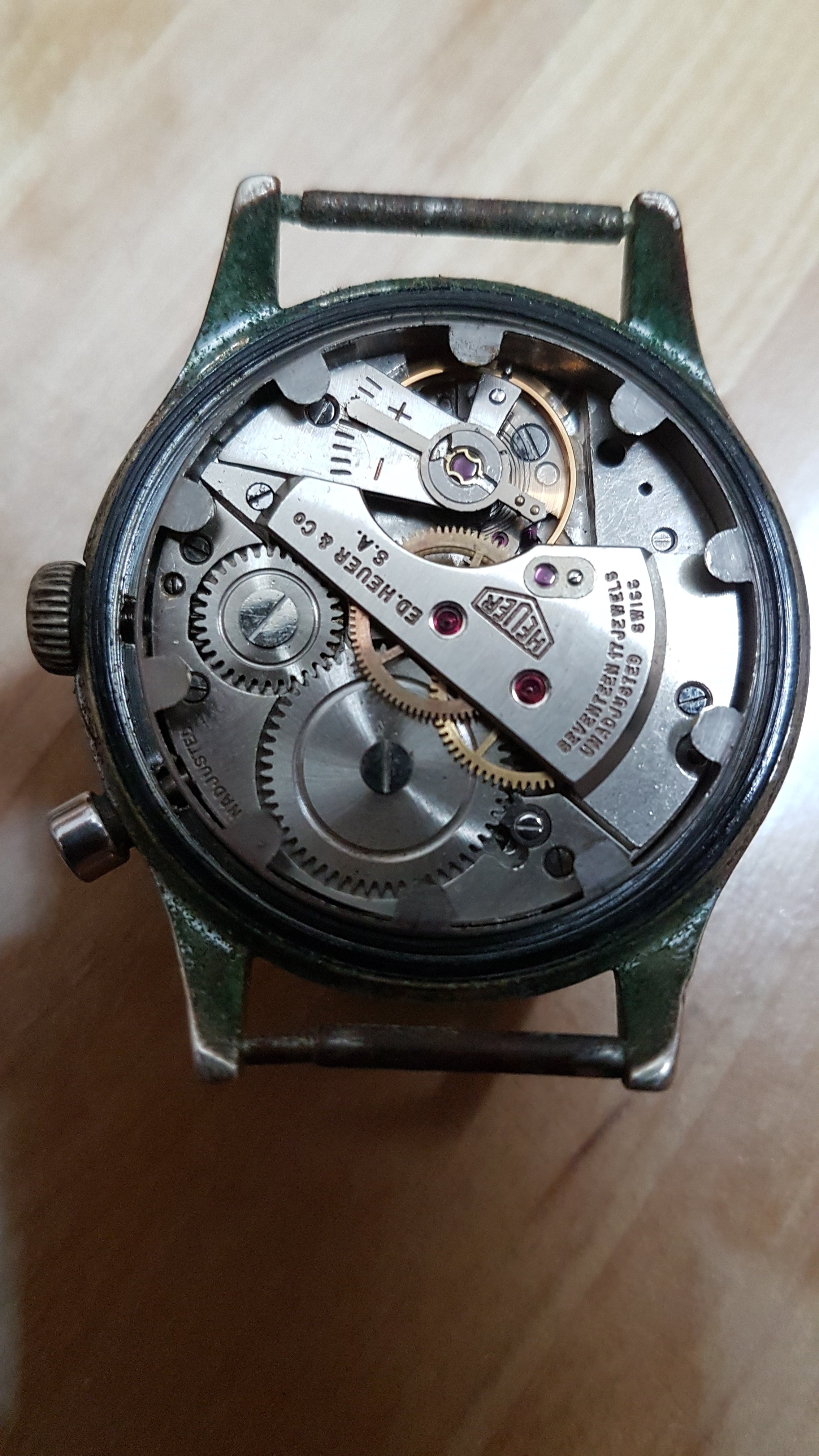 The movement is a Valjoux 90 which was used by Heuer. But a photo search hasn't turned up a Heuer moonphase with that "Breguet" style of numbers, nor any "pen-nib" hands. The Heuer logo on the dial does not look very well done either. So back of shop looks good, but I am not all confident about the front.