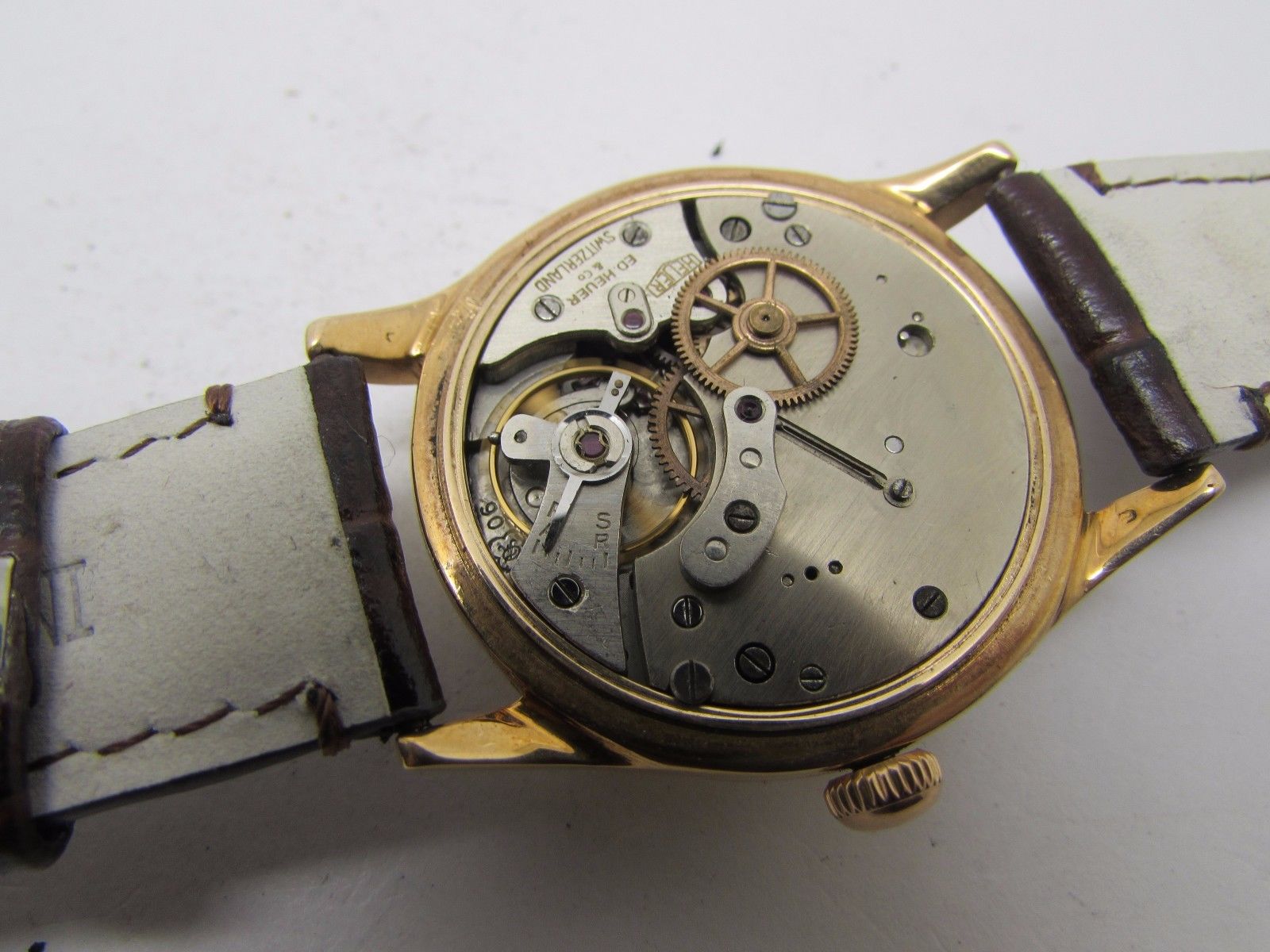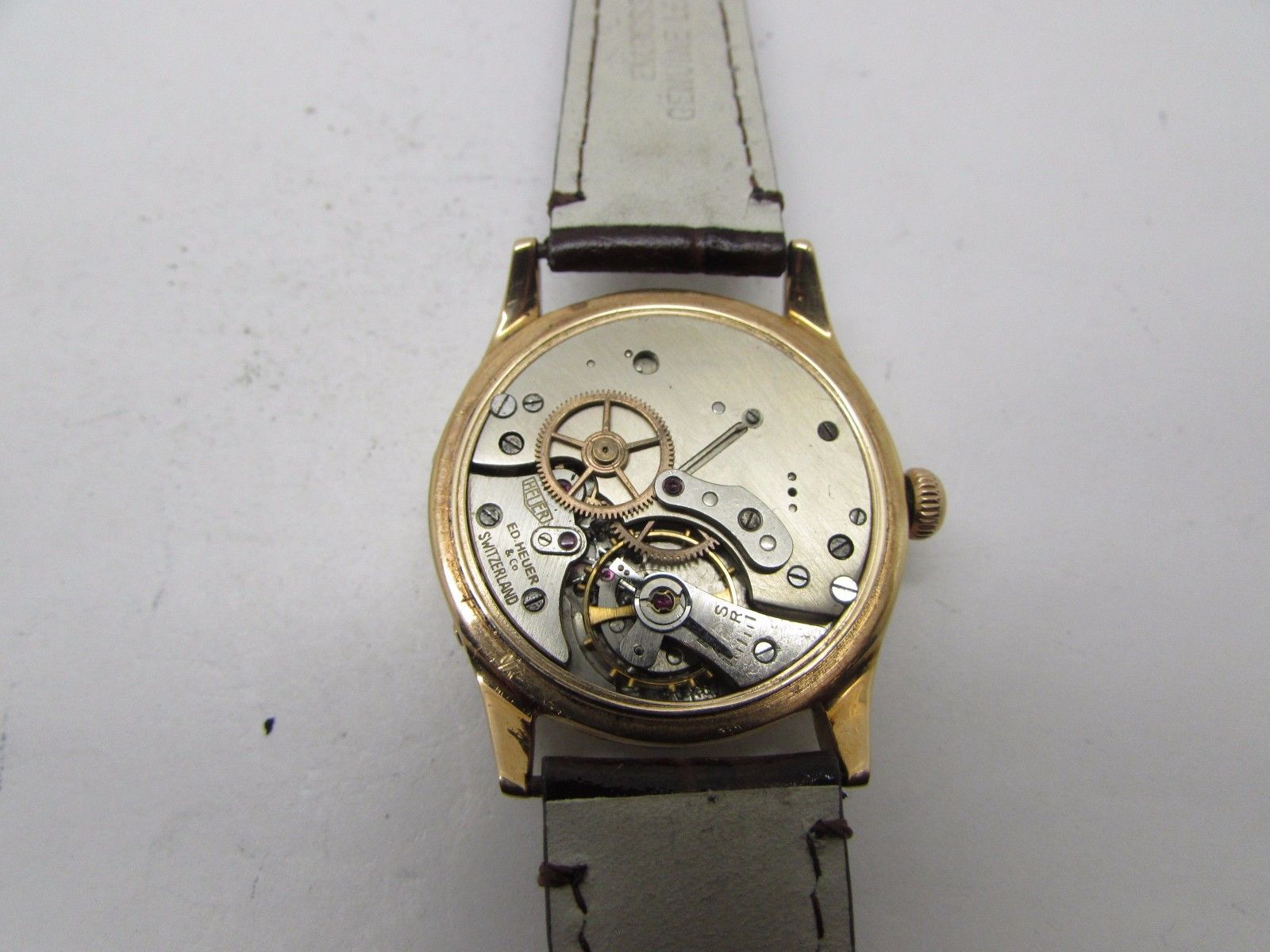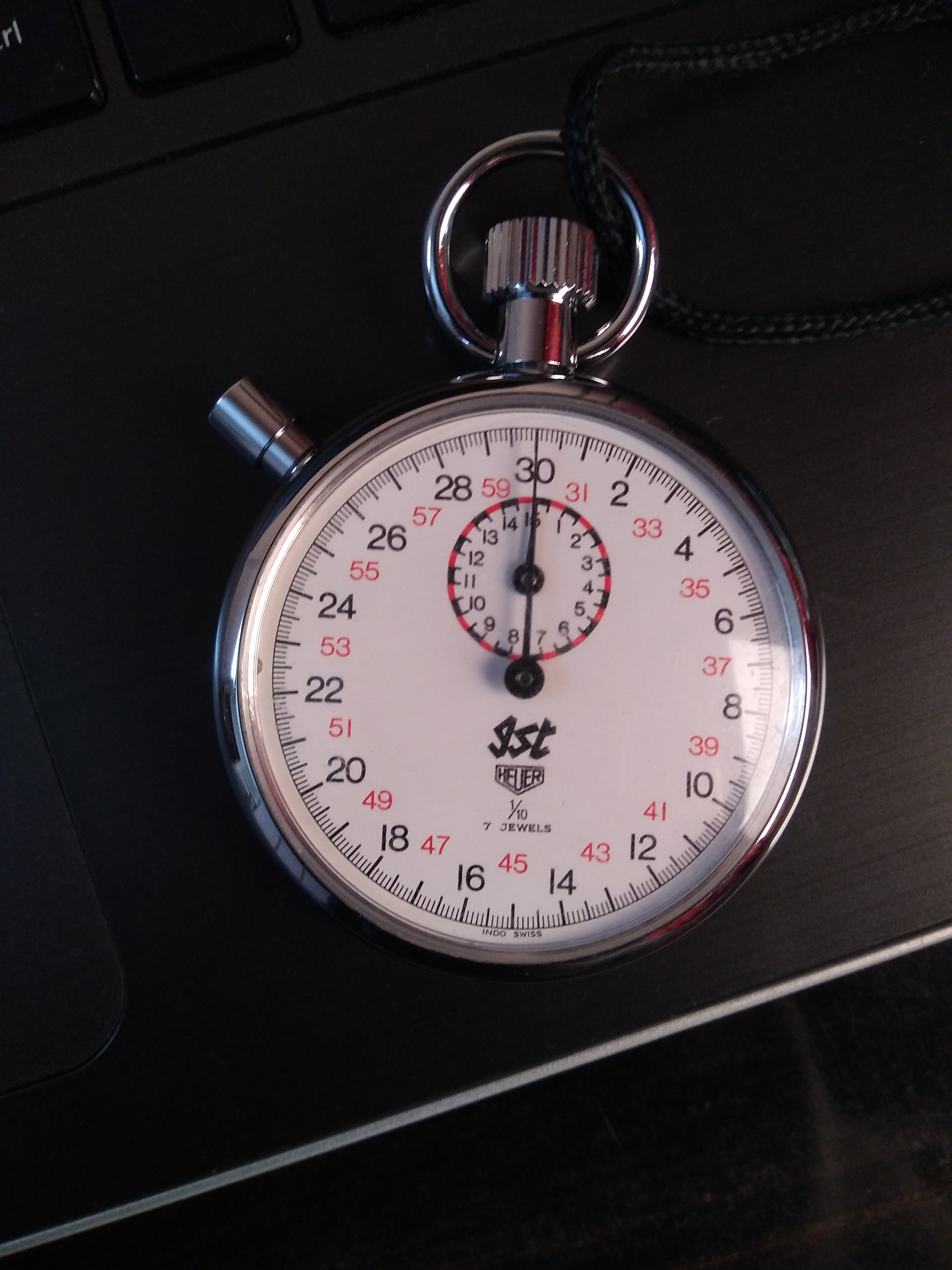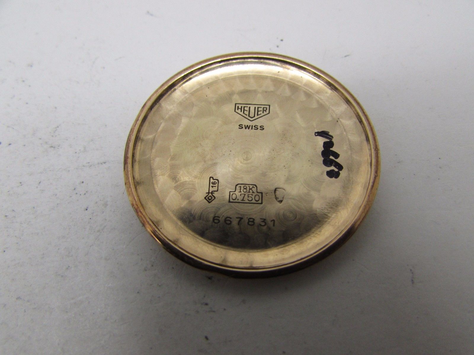 The movement is a Valjoux 90 which was used by Heuer. But a photo search hasn't turned up a Heuer moonphase with that "Breguet" style of numbers, nor any "pen-nib" hands. The Heuer logo on the dial does not look very well done either. So back of shop looks good, but I am not all confident about the front.