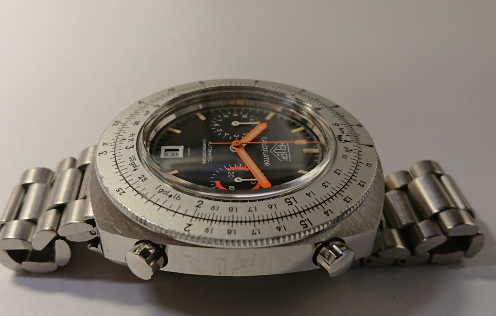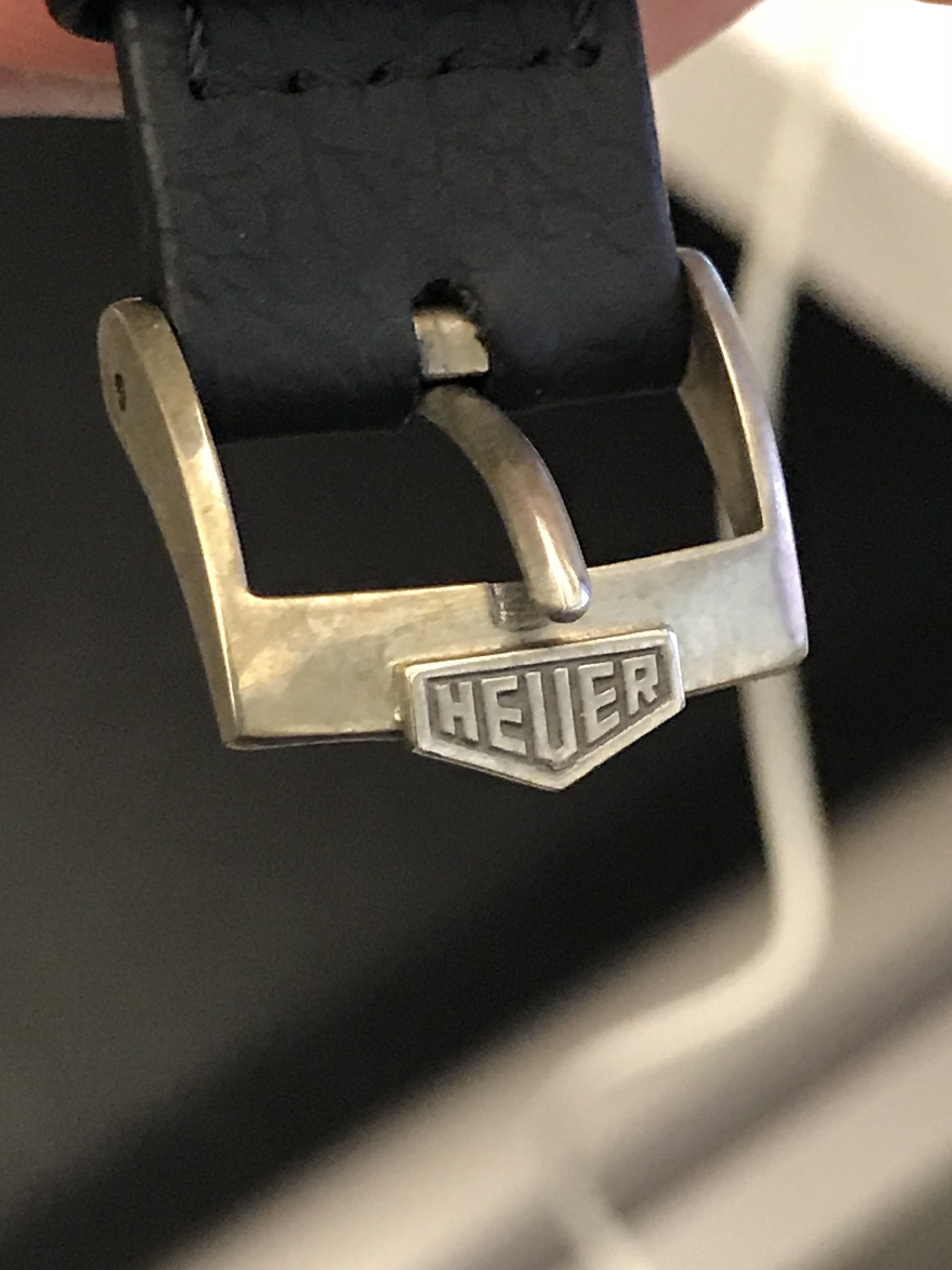 ·The overall appearance is 1950s to mid-60s, but I do not think Heuer were using anything but round cases with external lugs until 1969. The Heuer shield looks very crowded, and the minute and hour hands are not matched in shape. The sub-dial hands are not matched but as far as I can see Heuer only used matched plain baton hands for all sub-dials. The railroad track minutes/seconds is unusual too, Heuers generally seem to have a single line with ticks sticking out.