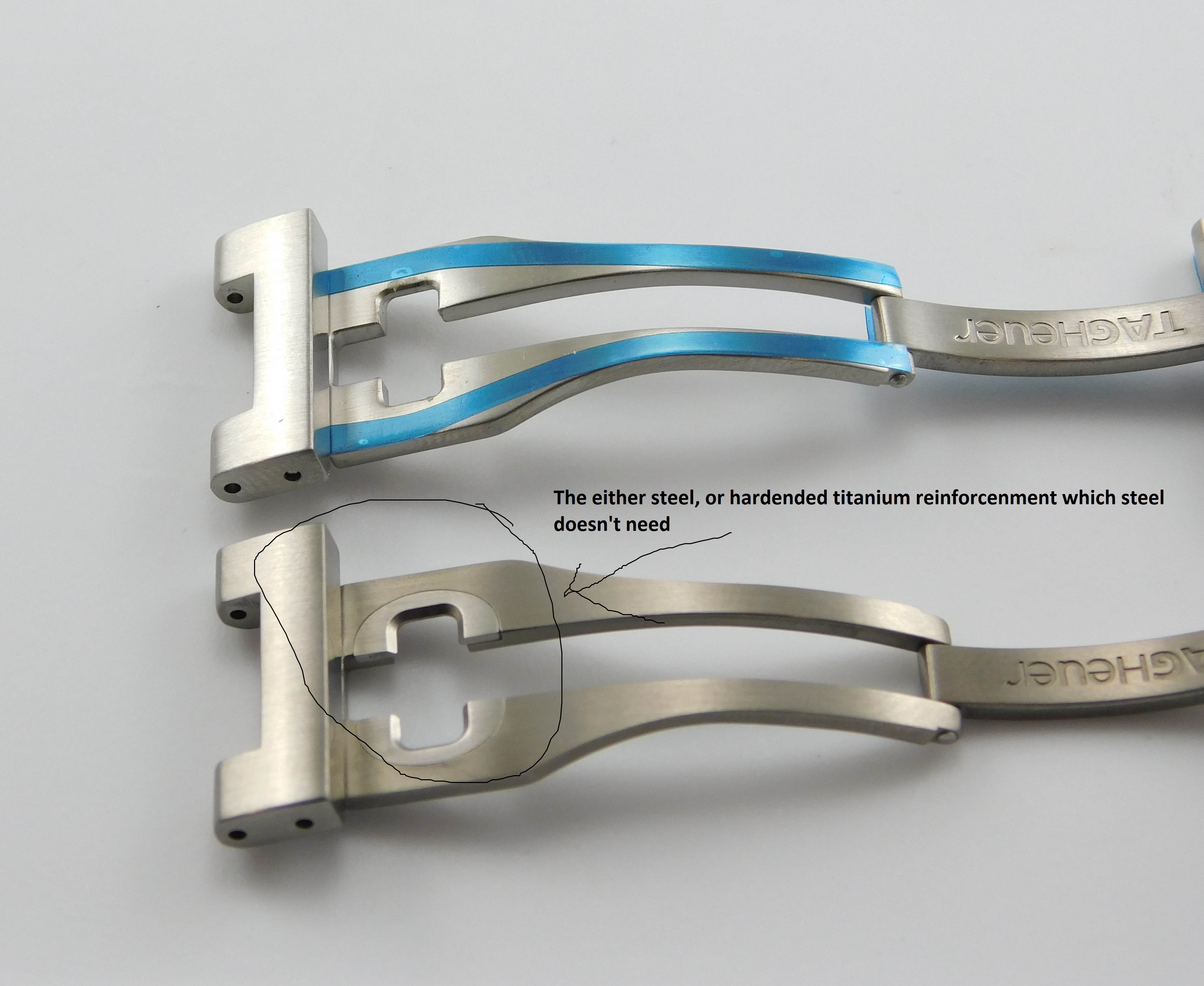 I'll take some pics for you for comparison. When I get a chance. The slight differences you're seeing, are the differences between titanium and steel. Titanium is lighter, and tends to be more brittle, so they have to reinforce certain spots with a more hardened version.
