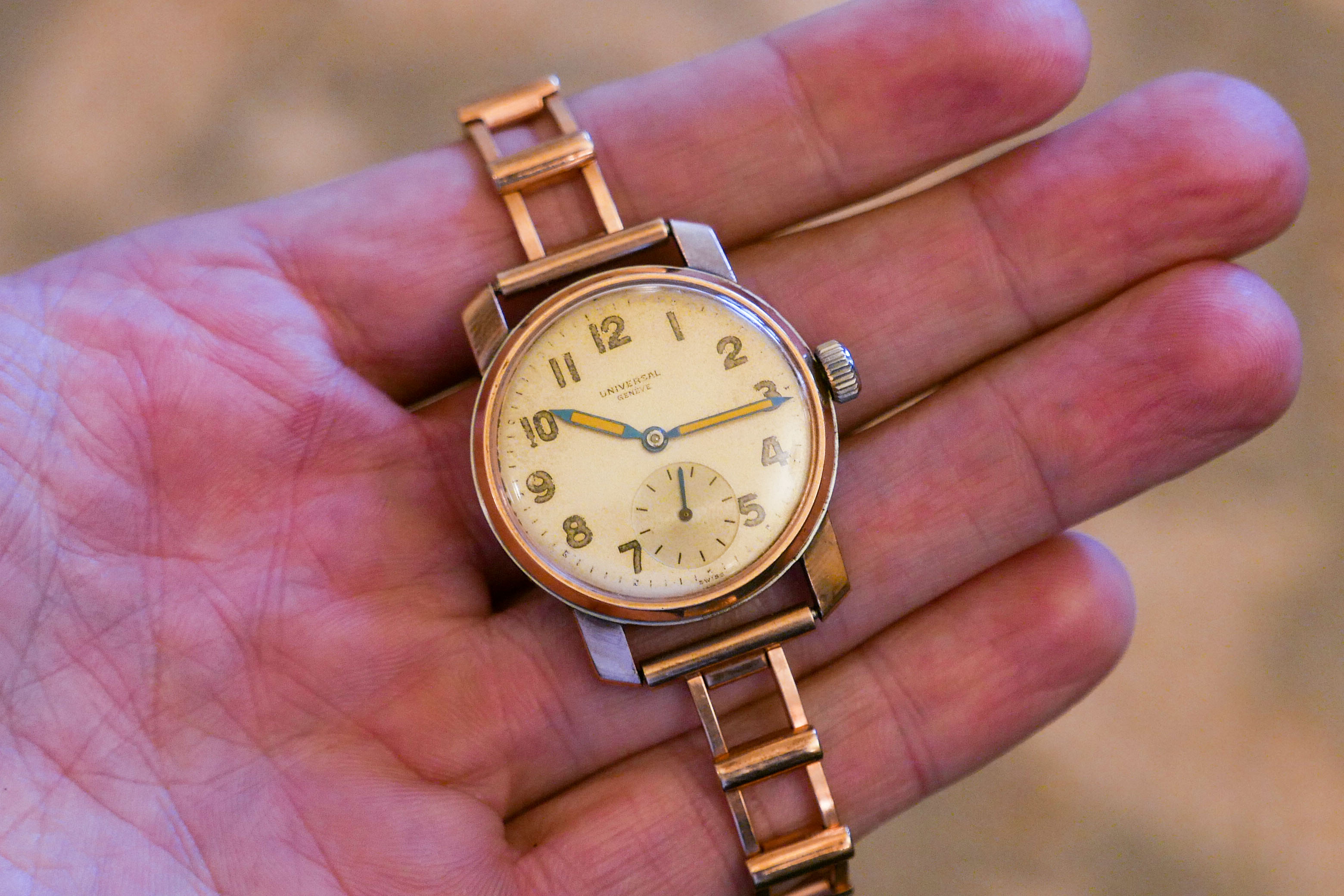 It's also definitely not gold cap. I know how it appears in the rear photo, and I know how that can be misleading, but I have it here in my hand, the gold color completely covers the bottom surface of the lug without any SS visible, and my understanding with gold cap is the base metal would be visible on the underside of the lugs?