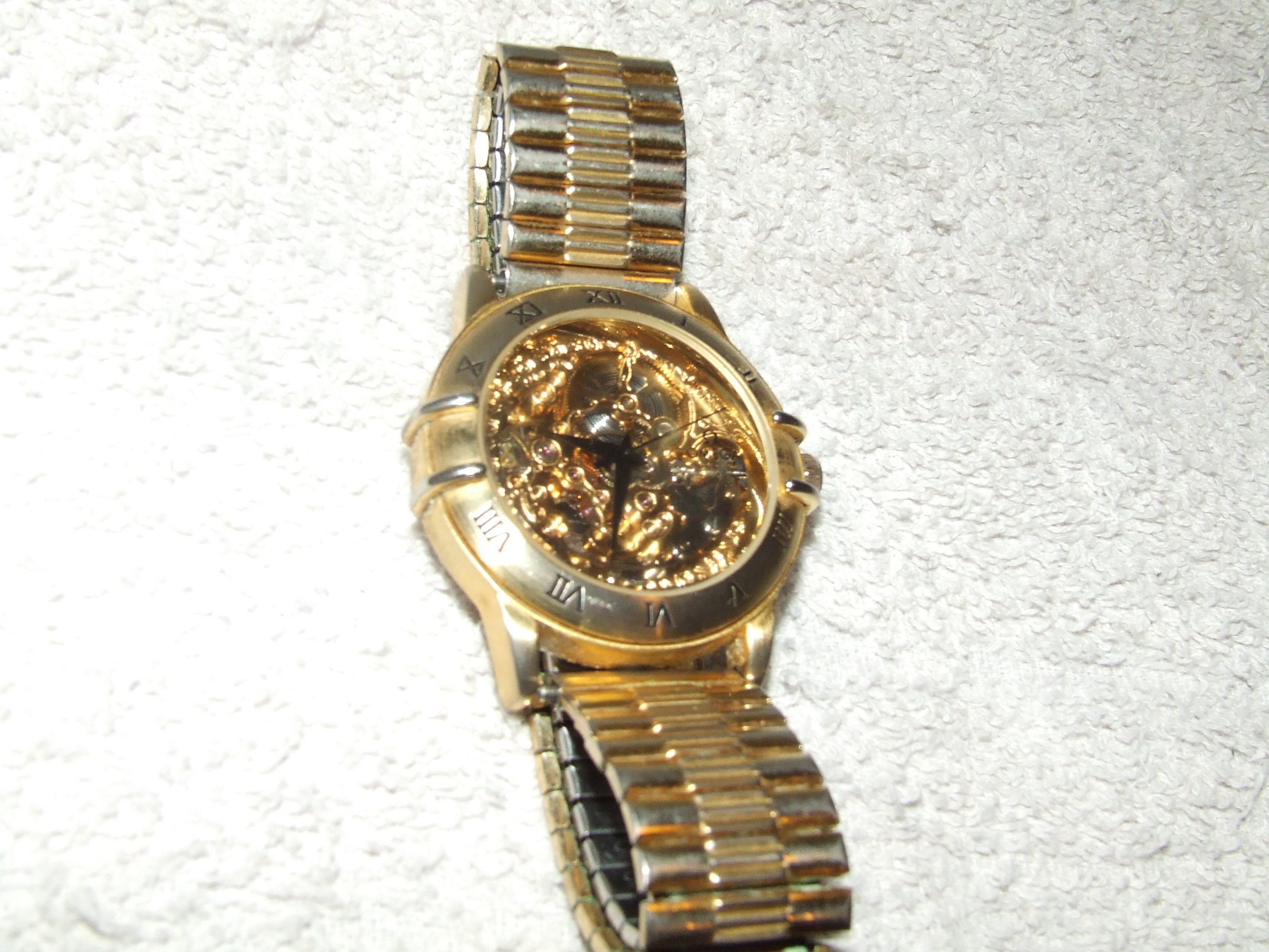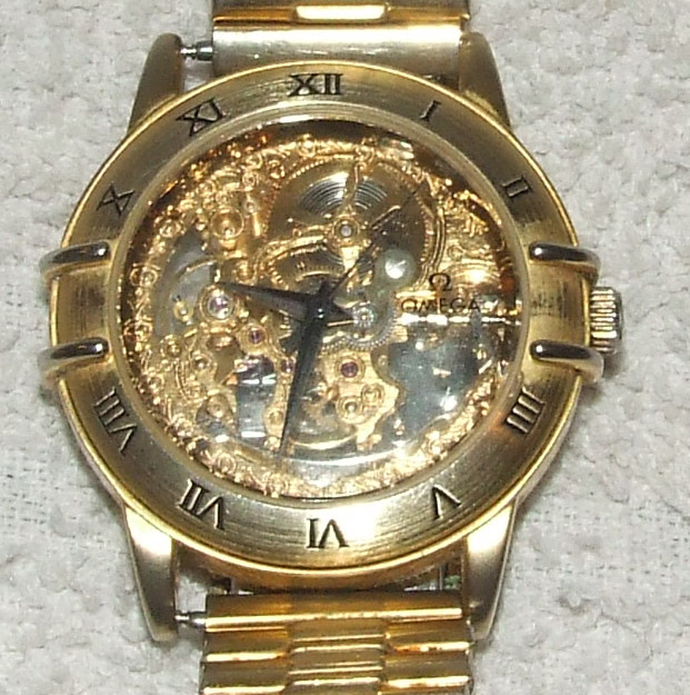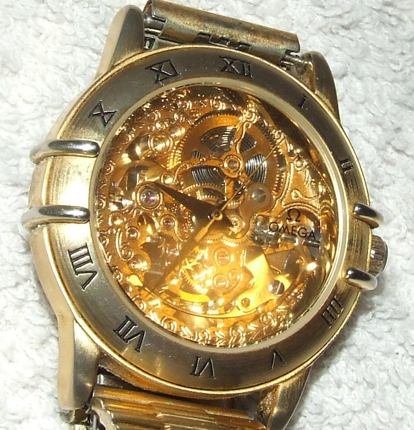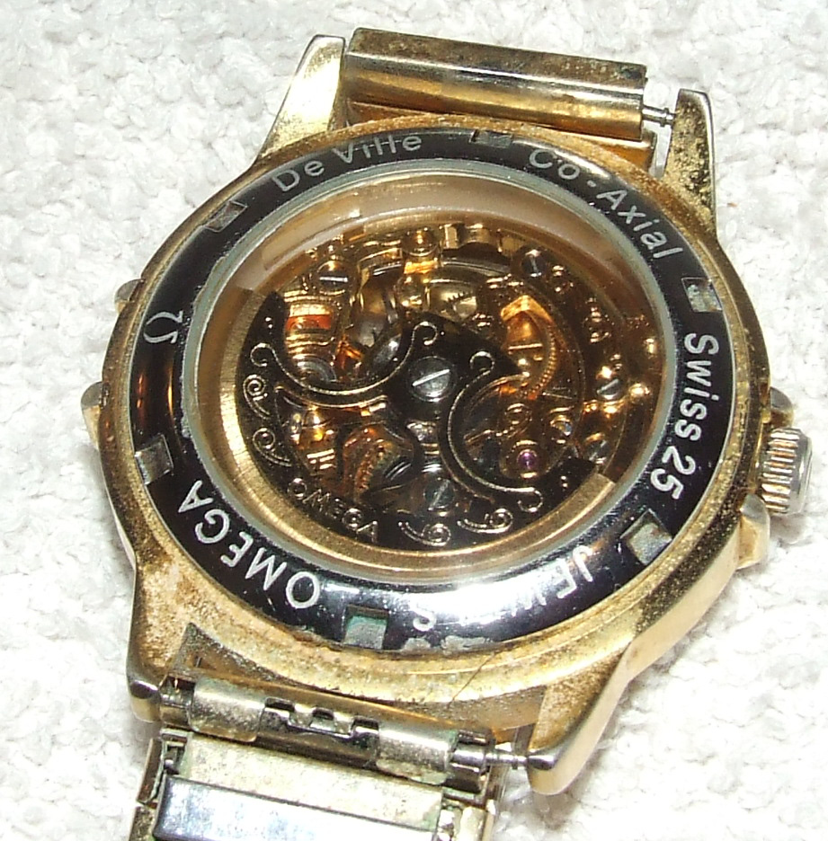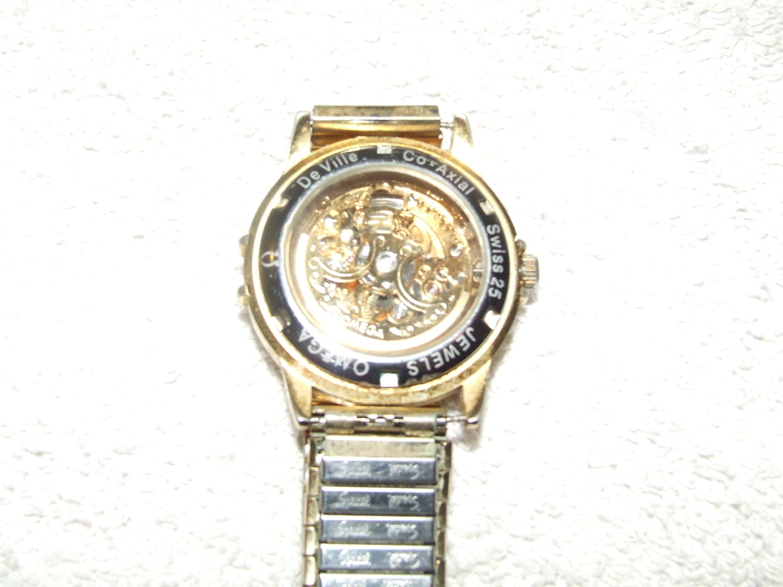 ·I went to an estate sale and got a bag of 4 vintage watches which included; A 1969 BULOVA Oceanographer Automatic Snorkel 666 Feet Swiss Diver Watch, A KALTRON 17 Jewels Incabloc Wristwatch, A RONA 17 Jewels French Wristwatch, and an Omega Deville Co-Axial Skeleton Watch. All the watches from the estate appear to be 1960's-1970's. I really like the Omega watch, its really unique! I couldn't find one like it anywhere else. I am not sure if it is a fake or not. I couldn't even find any fakes that look like it. The band has been replaced with a Speidel Flex band and the watch could use a cleaning but it runs nice! I think it is Vintage? It is signed "Omega with the Horseshoe trademark" on the front glass near the number 3. The back is signed on the outer ring "Omega DeVille Co-Axial Swiss 25 Jewels". The stem has the Horseshoe, and the rear inside movement is signed "Omega" on the swinging part of the Automatic Movement. I have included some pictures, any help would be greatly appreciated in Identifying the watch and if it Fake, Thanks! Ricky