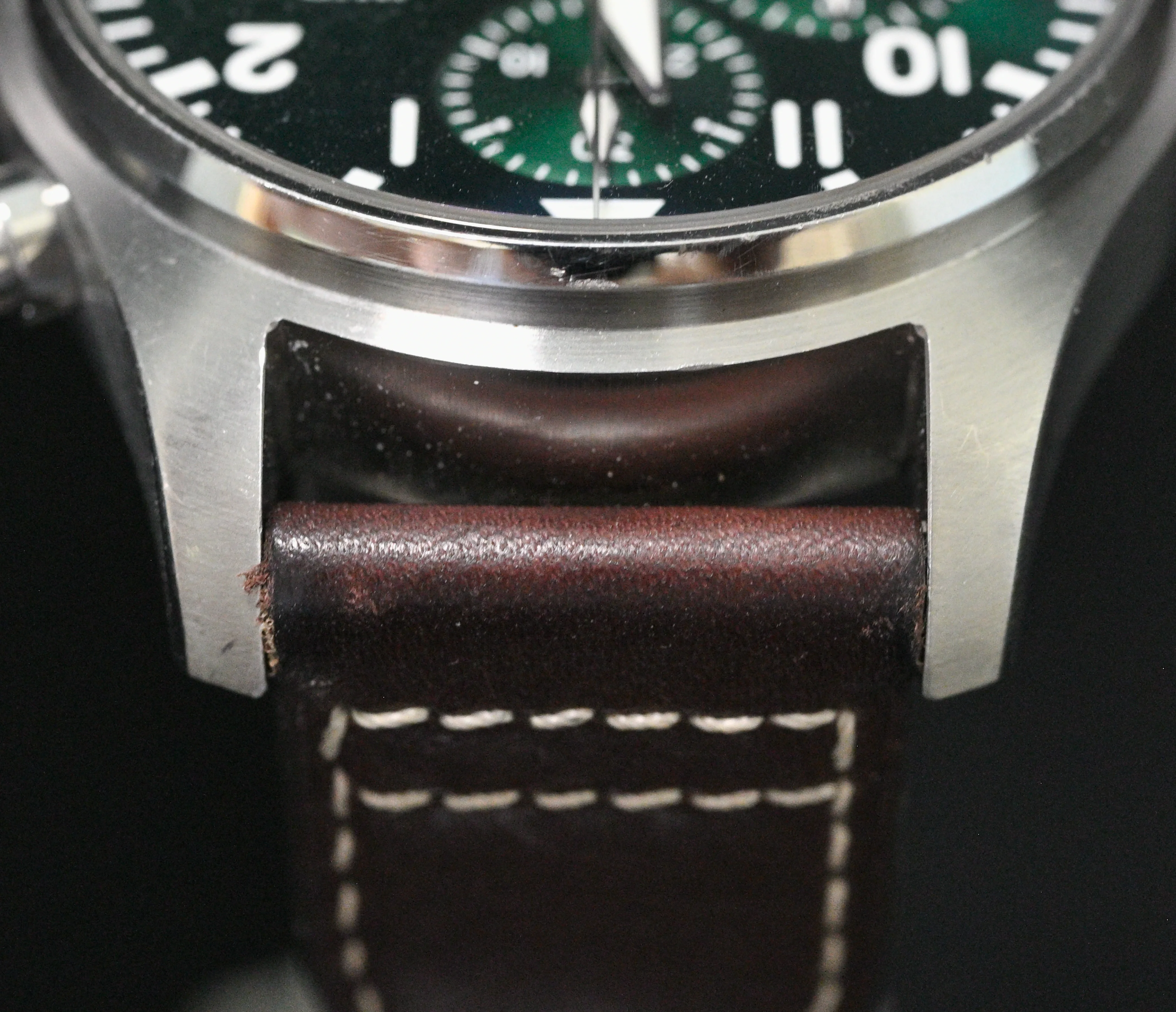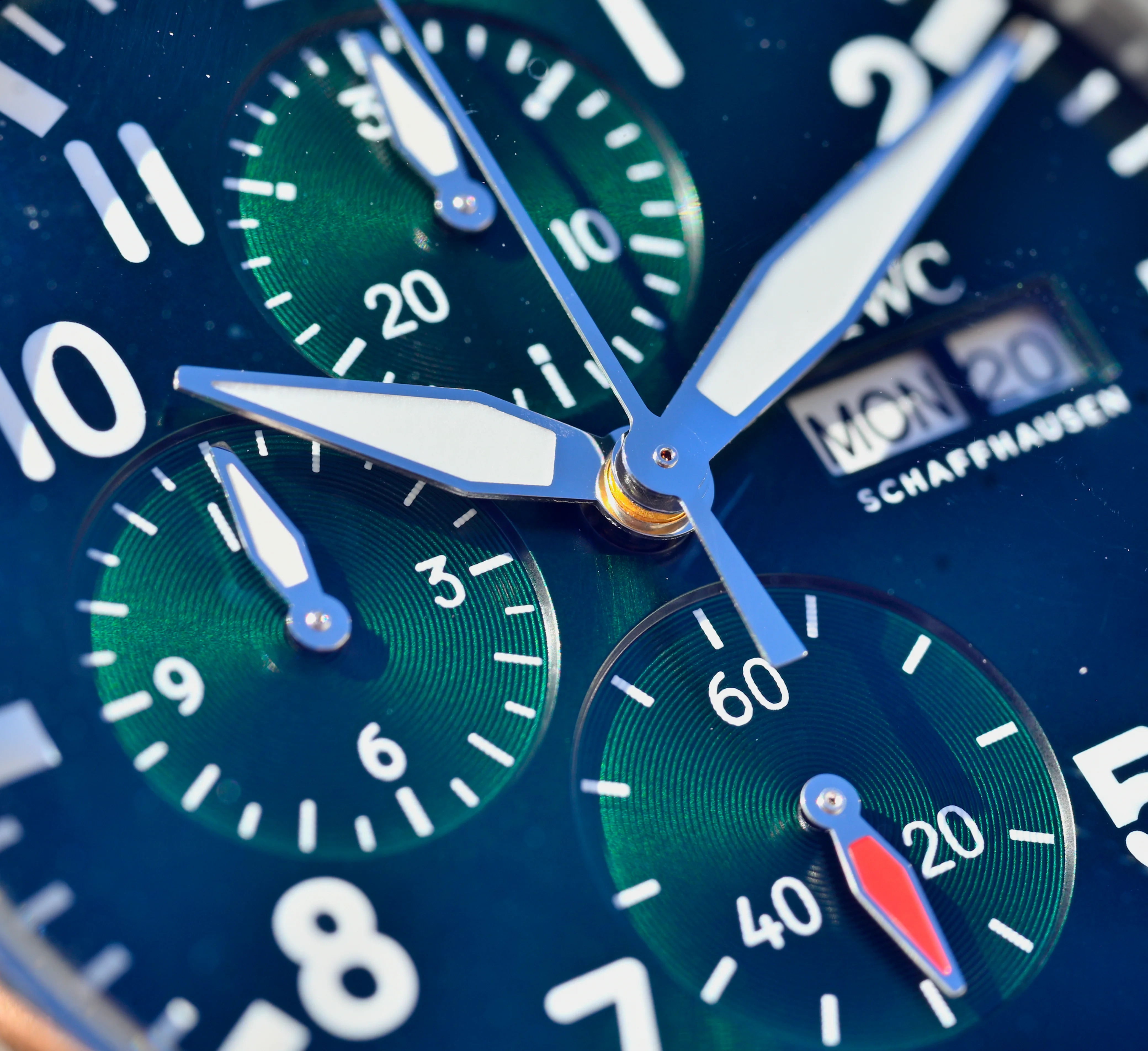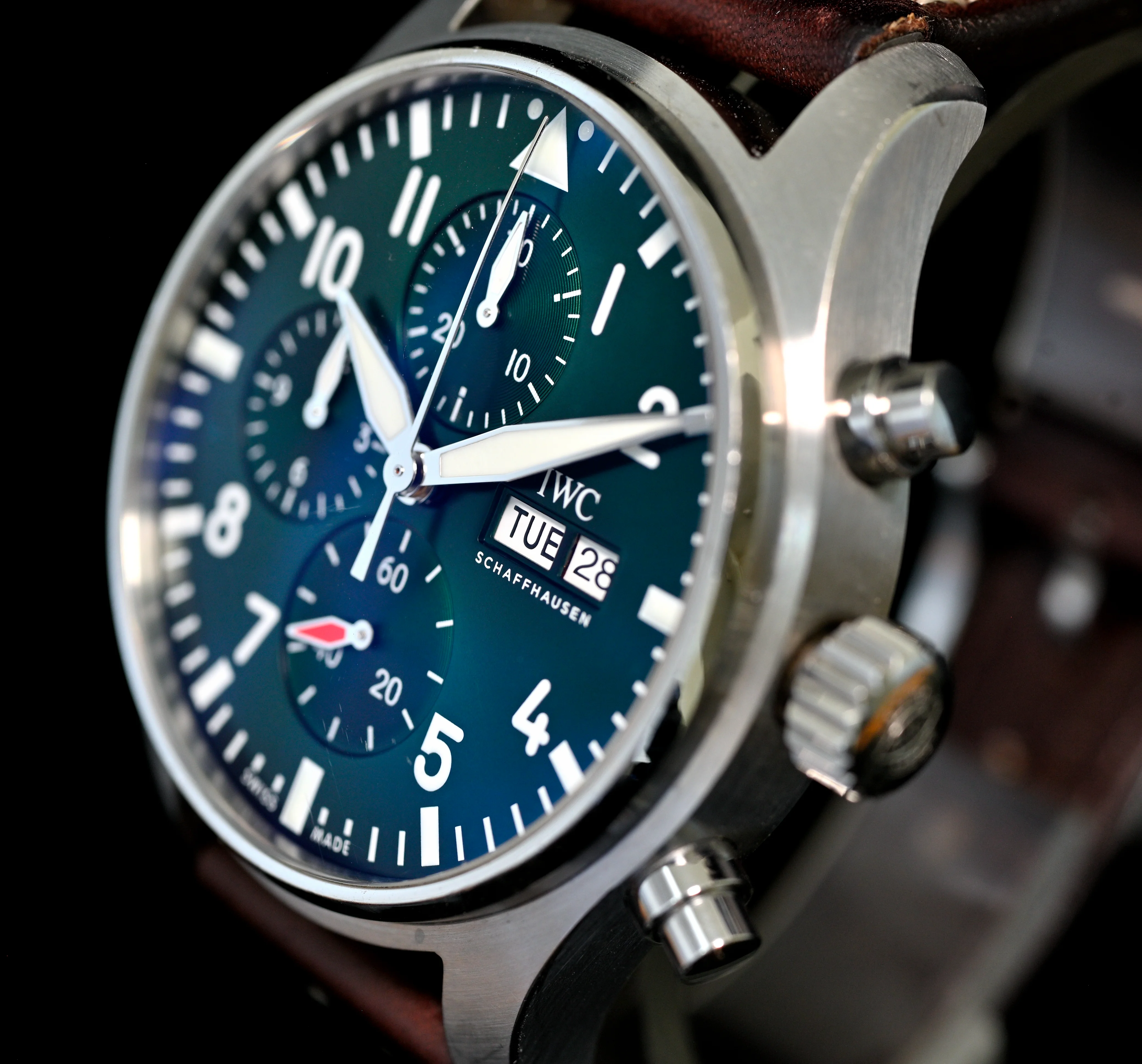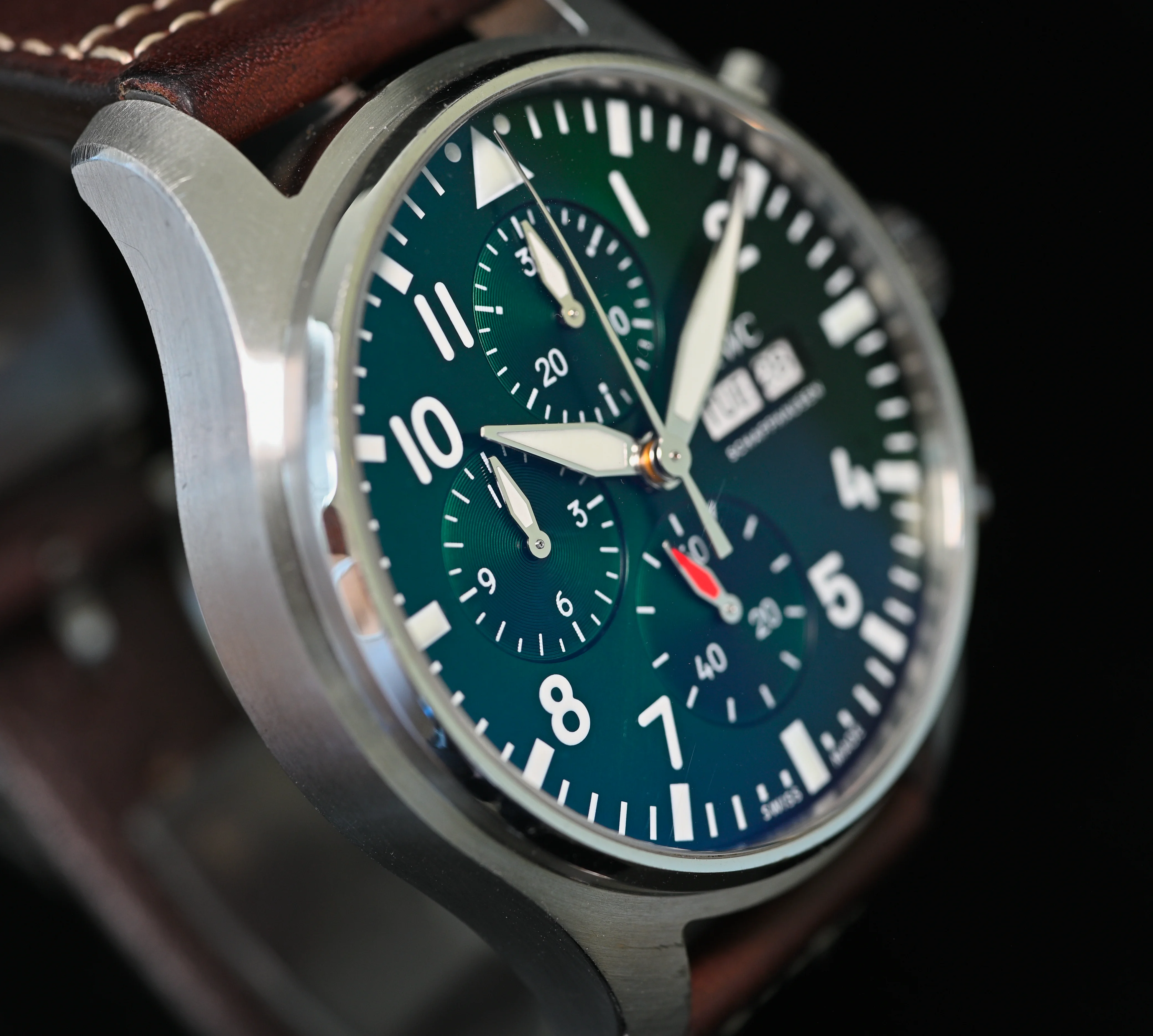The IWC Pilot's Chronograph features a beautiful green dial and a brown calf leather strap with IWC’s EasX-CHANGE system, allowing quick, toolless exchange to other EasX-CHANGE straps.