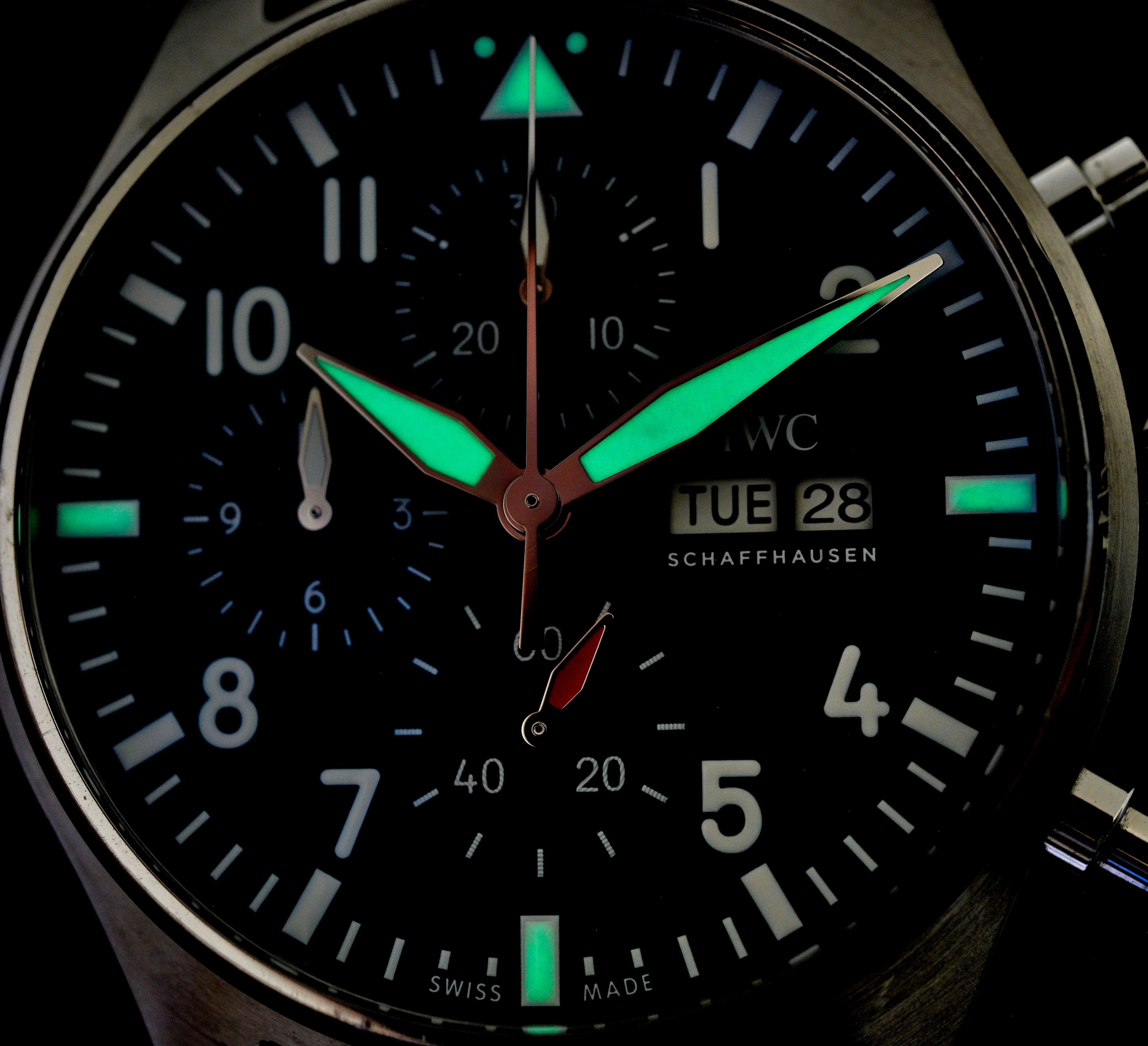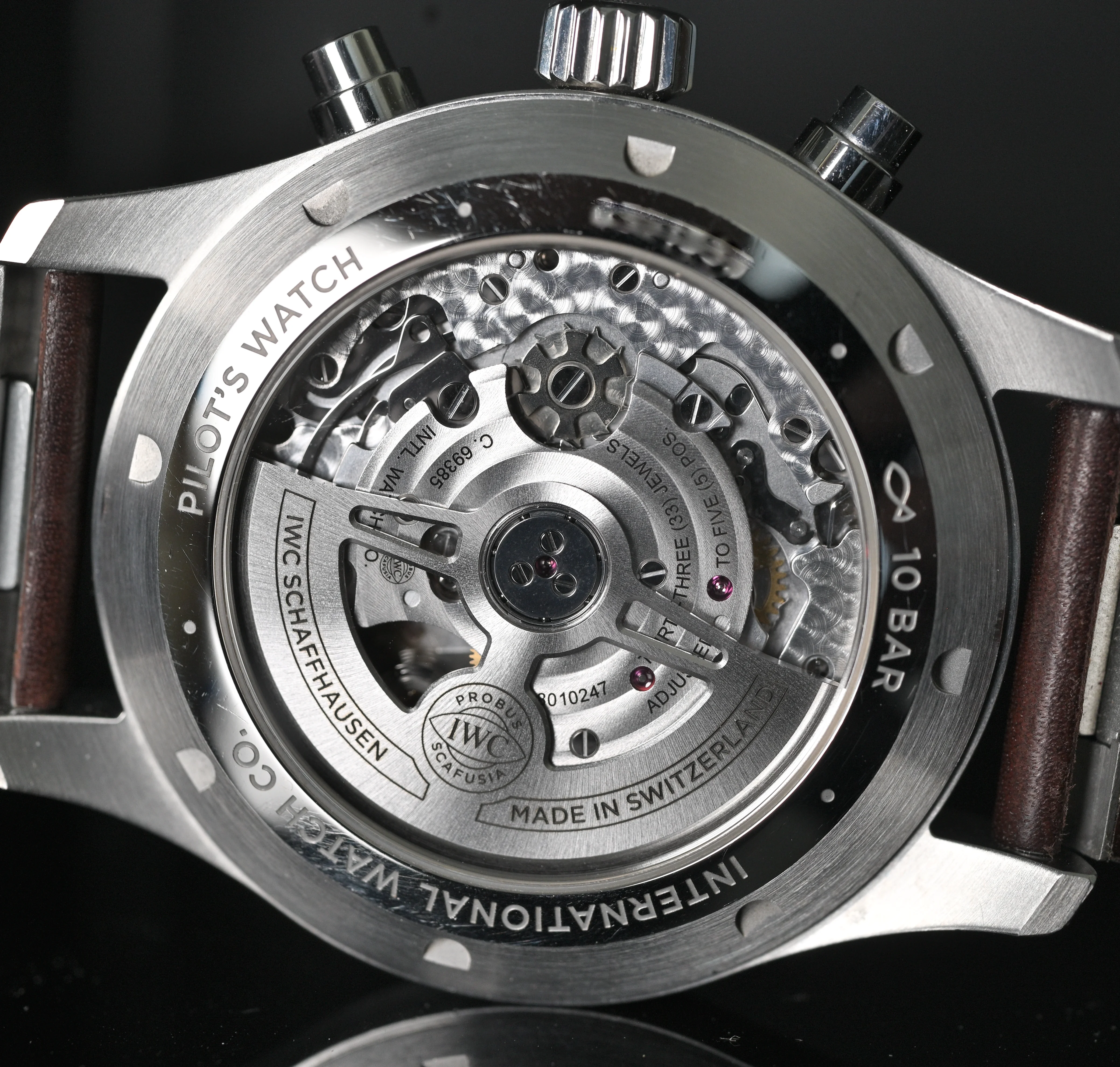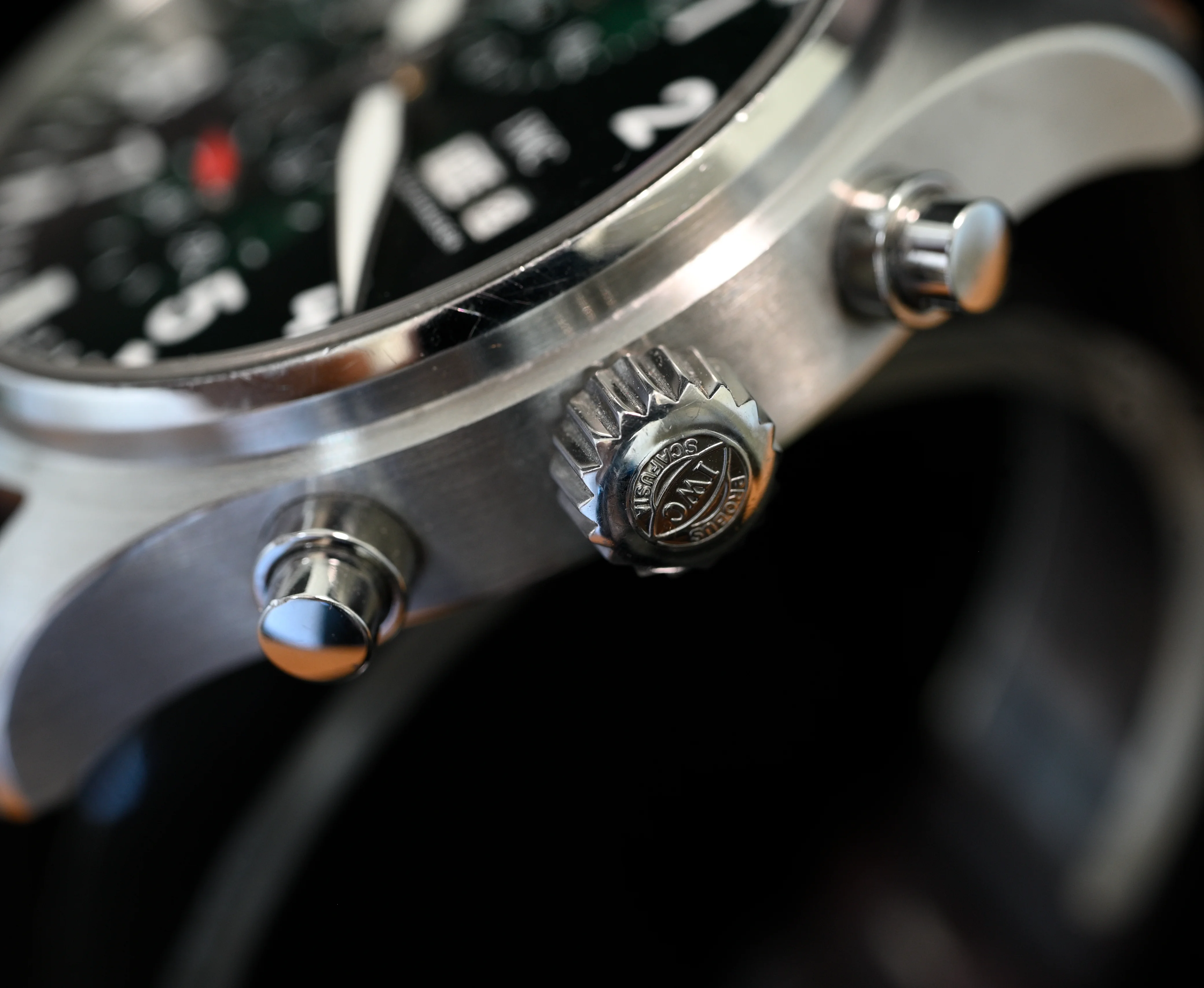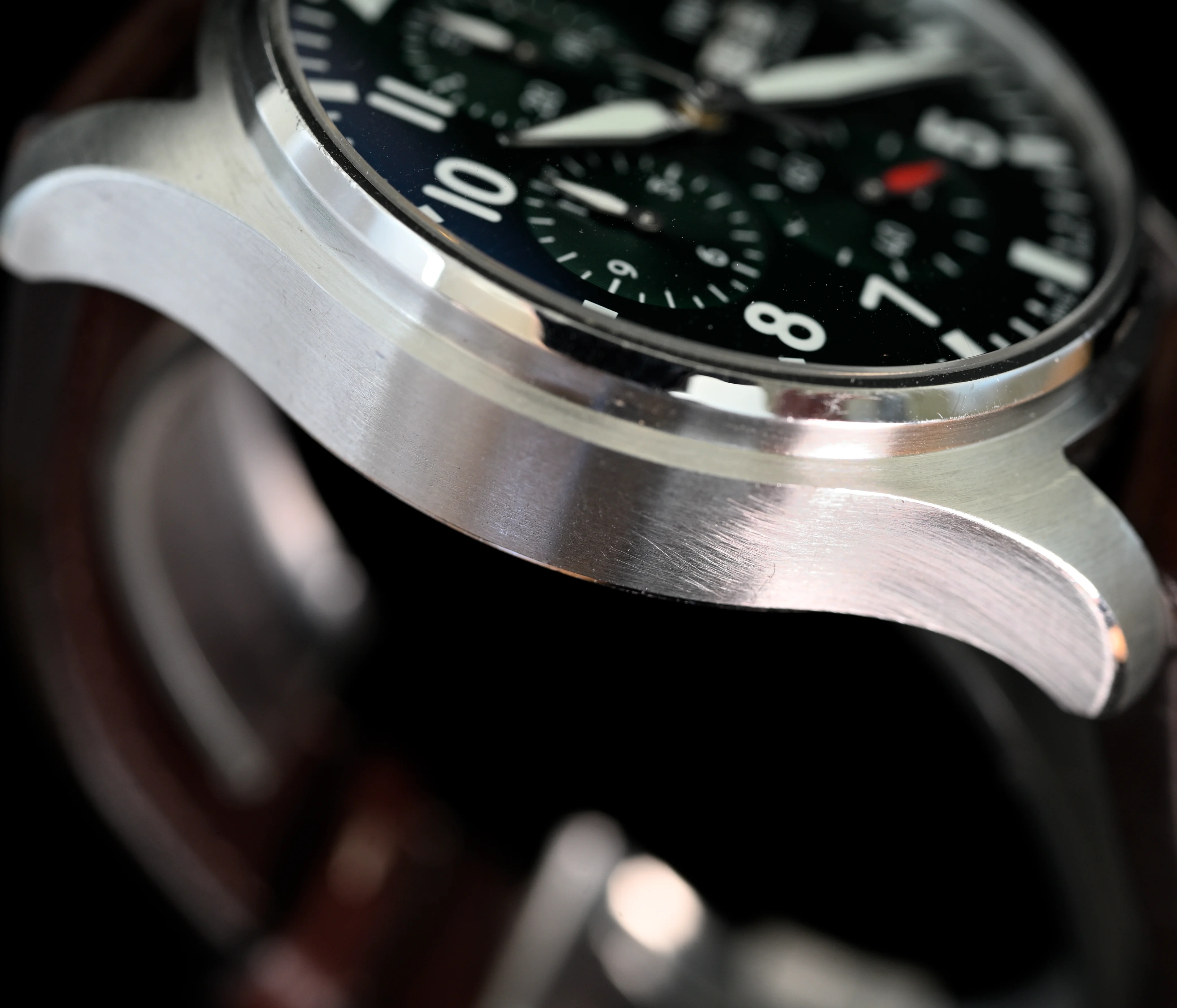 The IWC Pilot's Chronograph features a beautiful green dial and a brown calf leather strap with IWC’s EasX-CHANGE system, allowing quick, toolless exchange to other EasX-CHANGE straps.