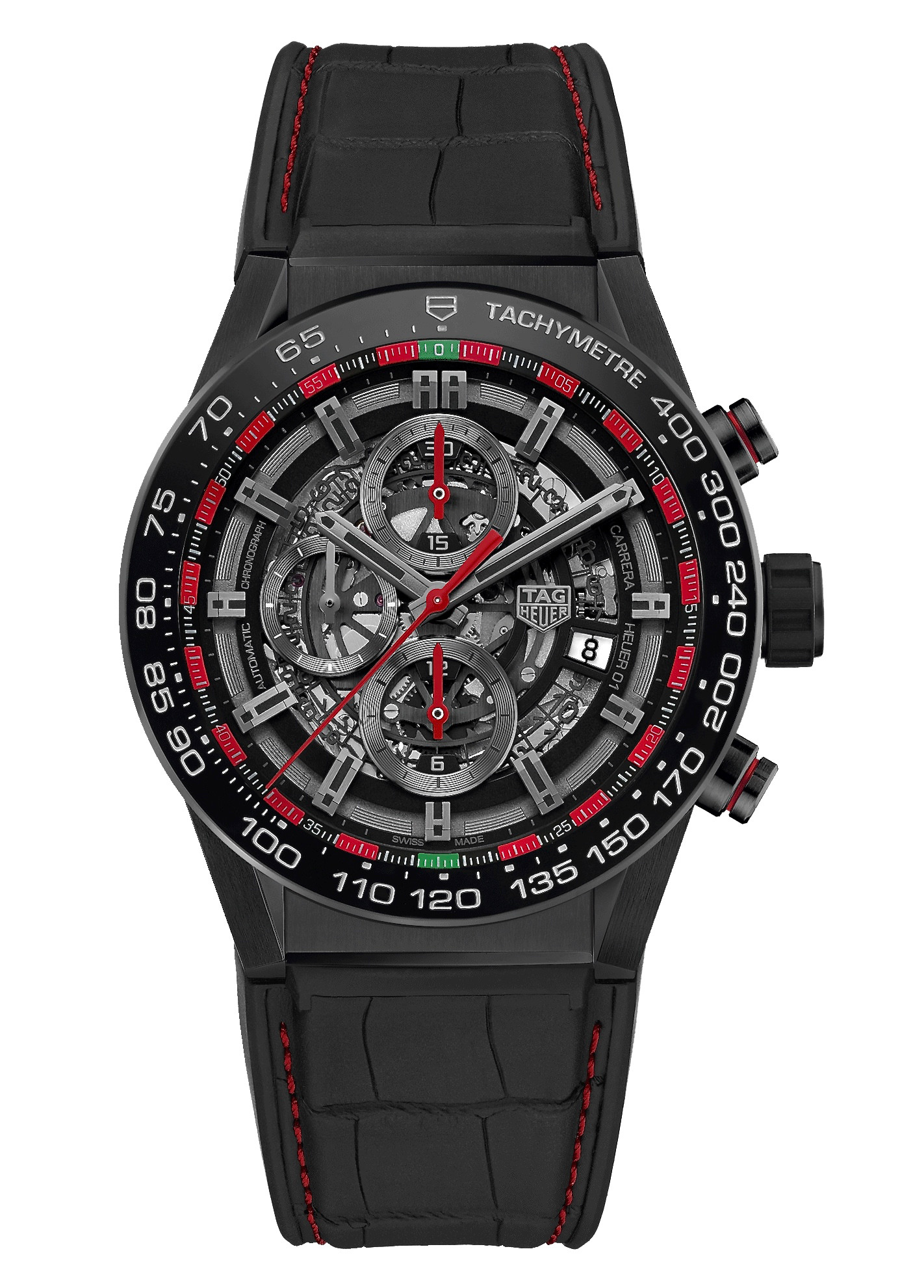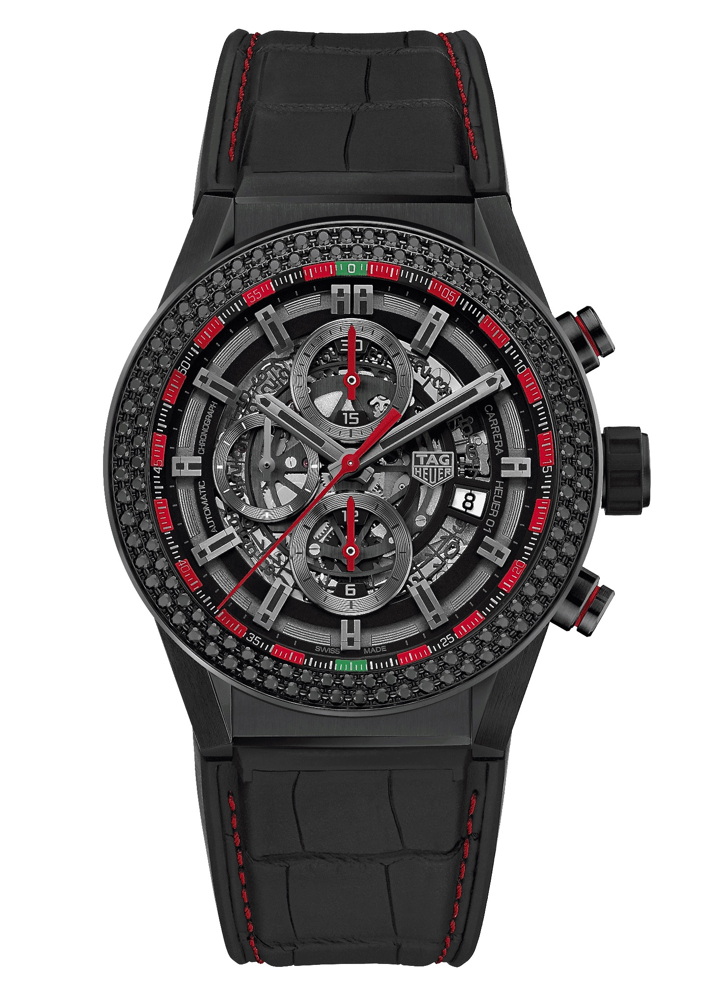 TAG Heuer also released two limited editions of the Carrera Calibre Heuer 01 in honor of the opening. TAG Heuer unveiled a pair of Carrera Calibre Heuer 01 Las Vegas Limited Edition watches, which pay homage to The Strip by drawing inspiration from classic casino games. The watches bring the roulette table to life with the design of the dial, which alternates black, red and green sections along the outside of the perimeter. The alligator printed rubber and leather straps are black with red stitching as a nod to the card game blackjack.