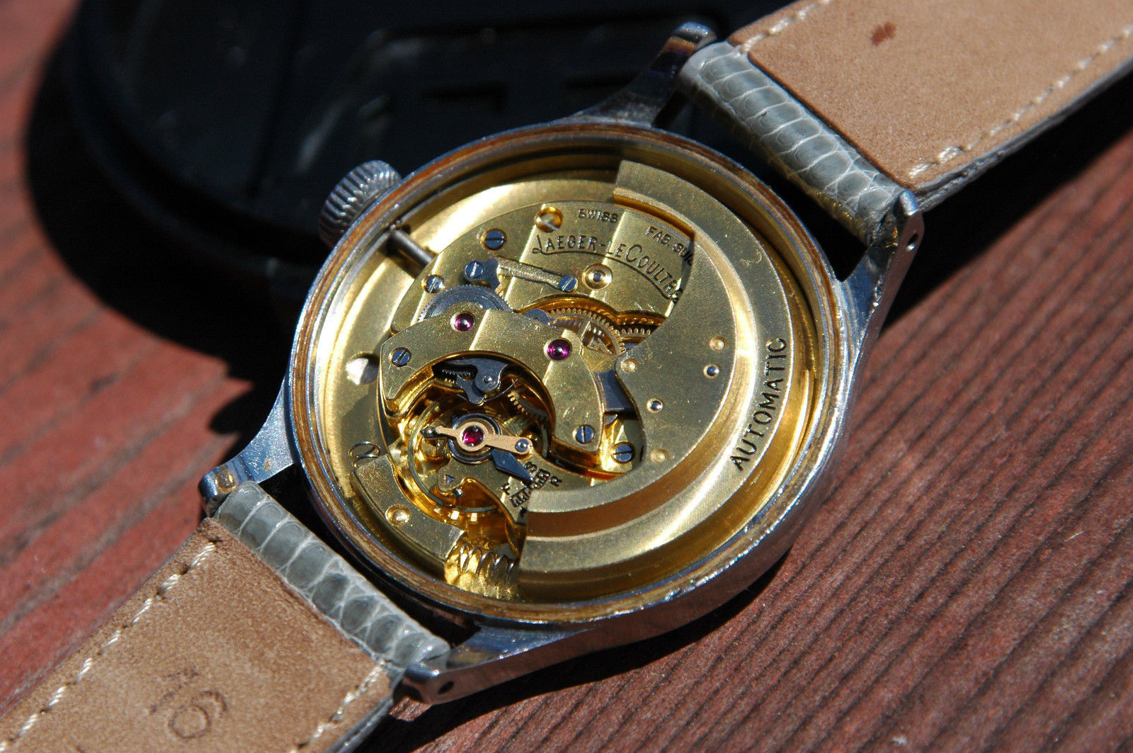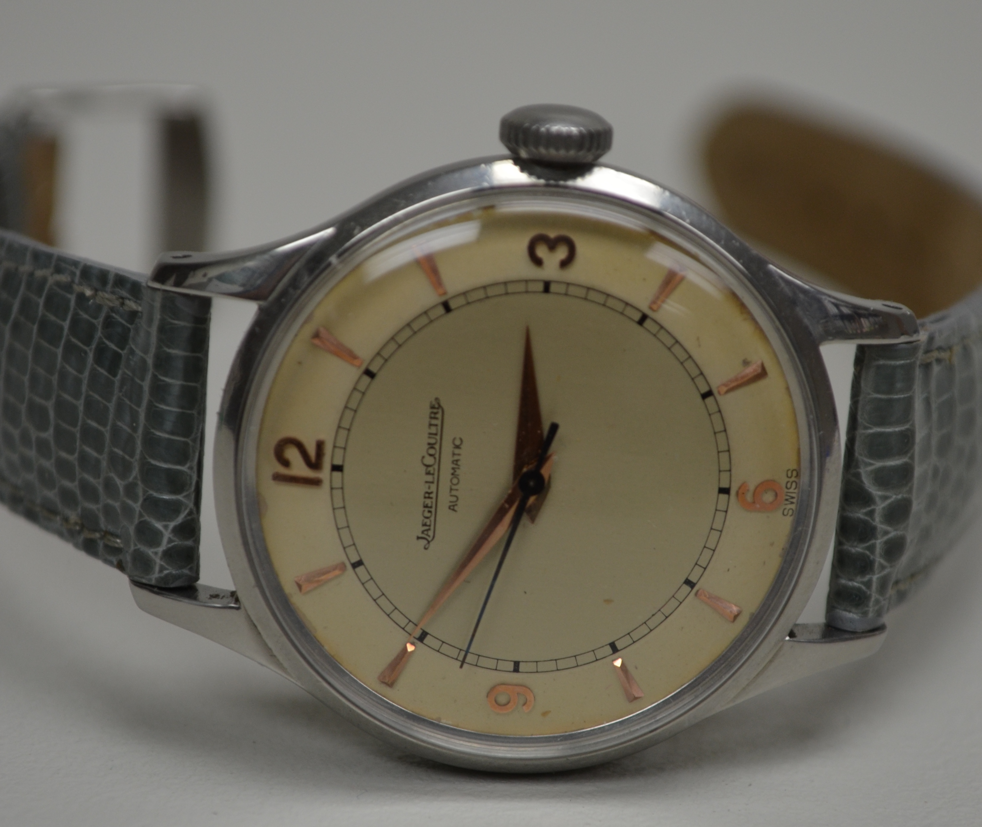 ·A beautiful, stainless steel men's automatic Jaeger LeCoultre with case diameter of 33.5mm without the crown. Everything about this watch is clean; dial, case and movement. No apparent signs of abuse inside or out that i can see. The dial is completely original and gorgeous. The dial is one color, but changes depending on how the light is hitting it, making the inner portion of the dial and the outer ring of the dial appear to be two different colors. The hands and markers are rose gold and blued second hand. Condition is excellent. The automatic bumper cal 481 movement was cleaned and oiled recently. The movement is fully gold colored and looks very beautiful. Watch comes with a brand new lizard band. Asking price is reduced USD 1400 >>> to USD 1300, shipped and paypal fee included. I am selling this beautiful watch only because I am looking to replace my vintage pieces with modern ones that are more likely to be worn often.