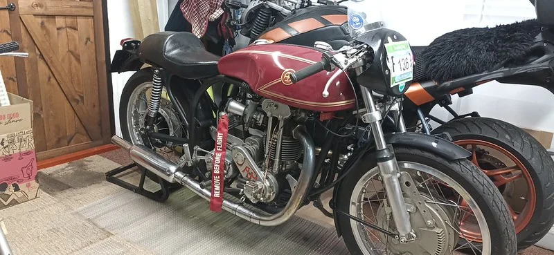 So - he and a friend started gathering the parts, having decided, over long evenings in the family bar** involving lots of whisky, cigars and banter: that the ideal conglomeration of parts would include a Norton Featherbed frame (the special builders' favourite for good reason), the biggest front brake they could find, and while being built up as if it were destined for the track and competion, would actually be road-legal (ish) and somewhat down-tuned to make it easier for aged legs to kickstart!