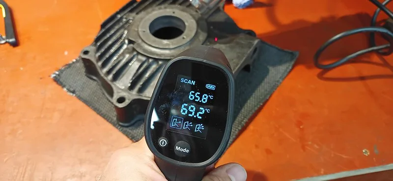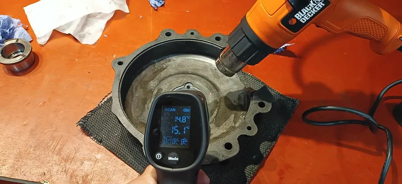 I rigged up the hot-air blower in an articulated grabber (a digital tablet holder in fact), and took a preparatory reading