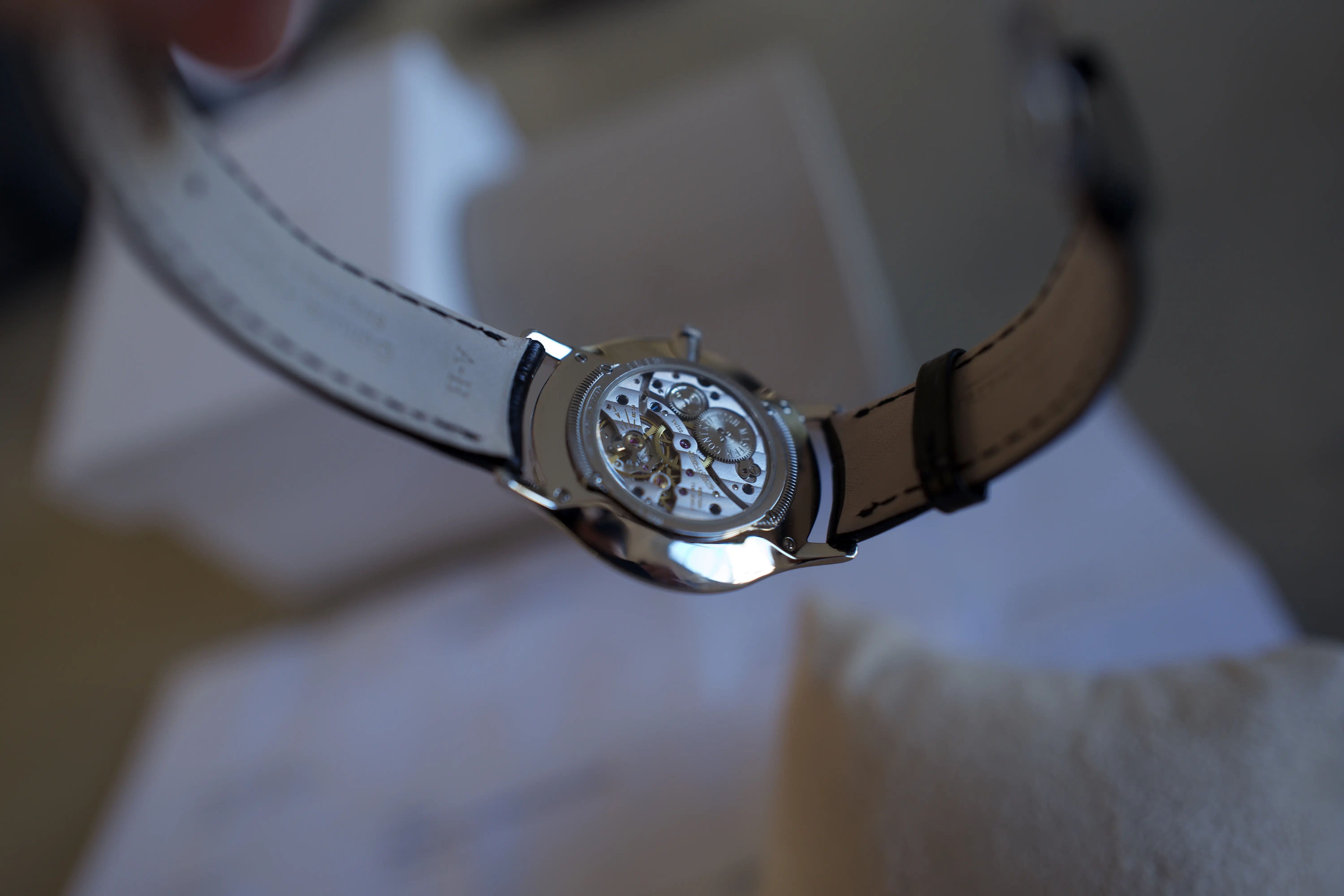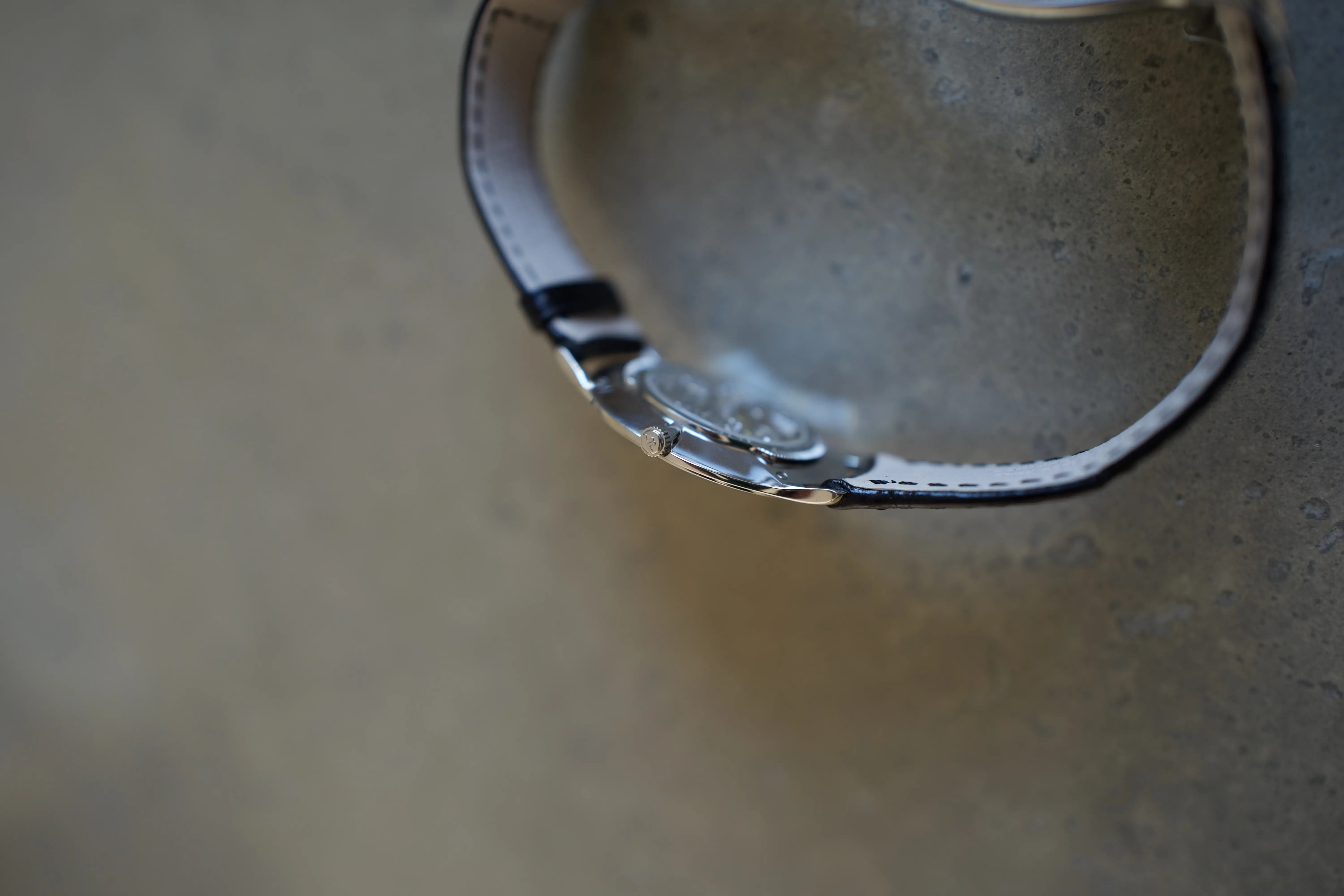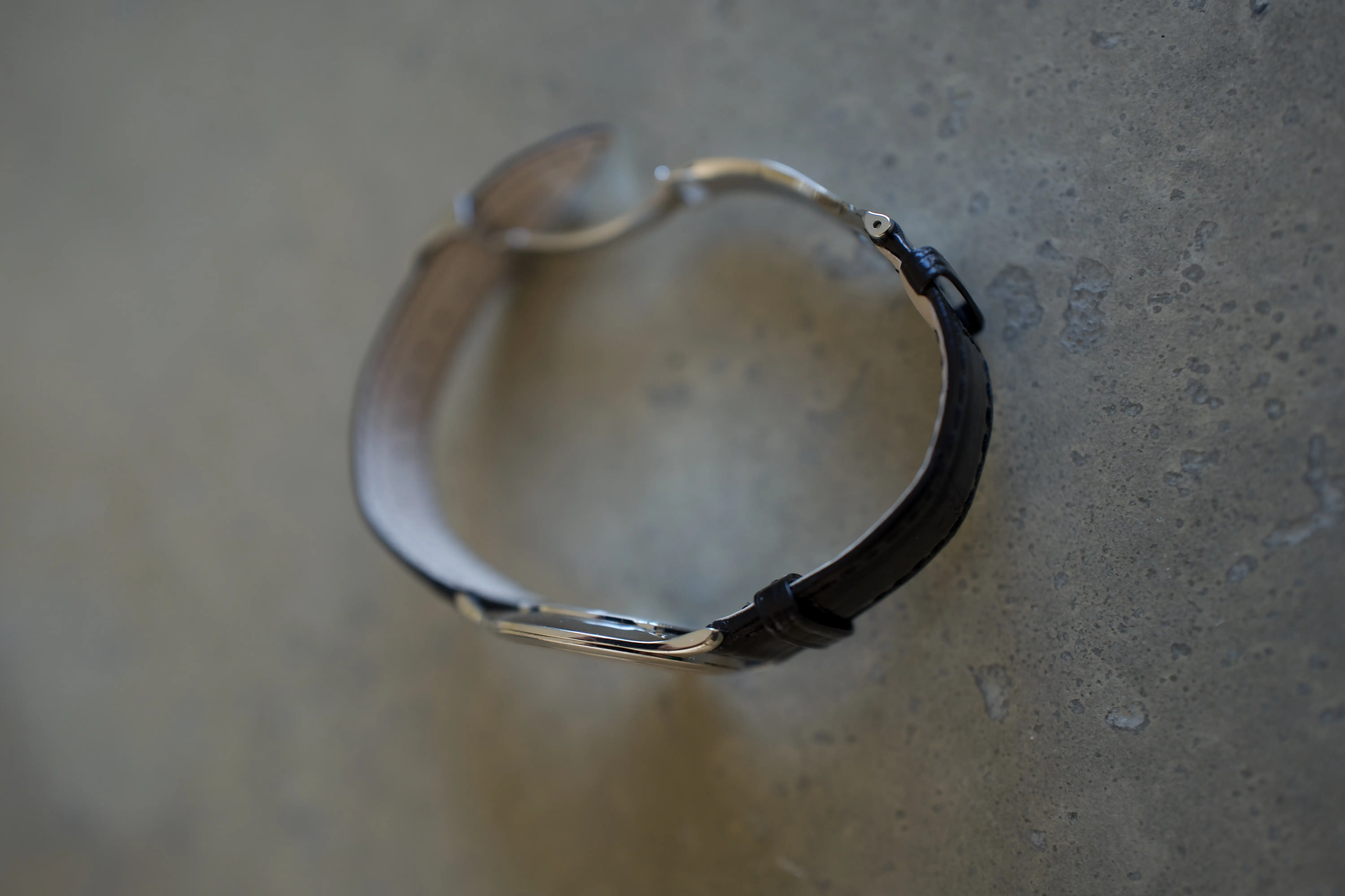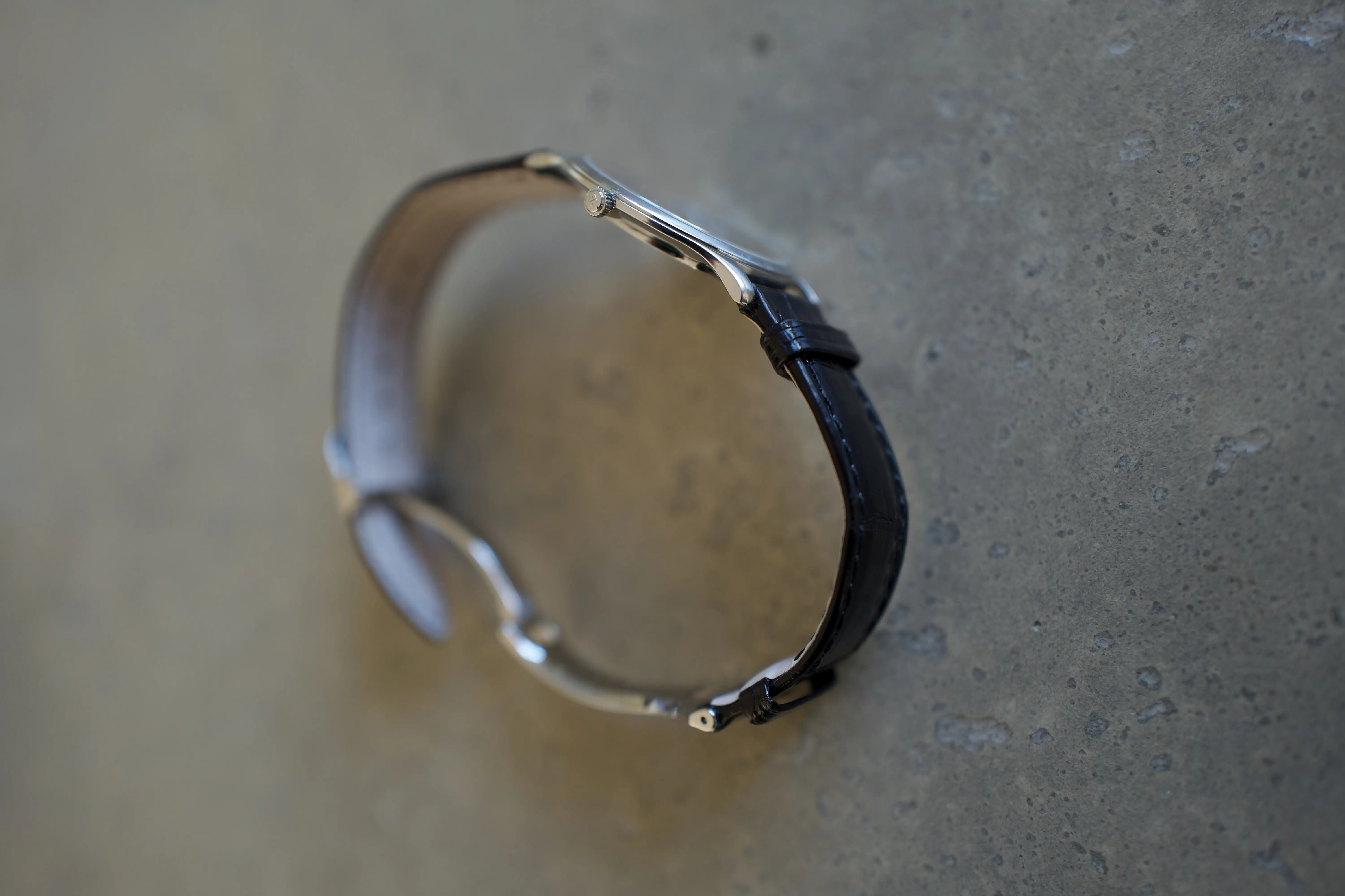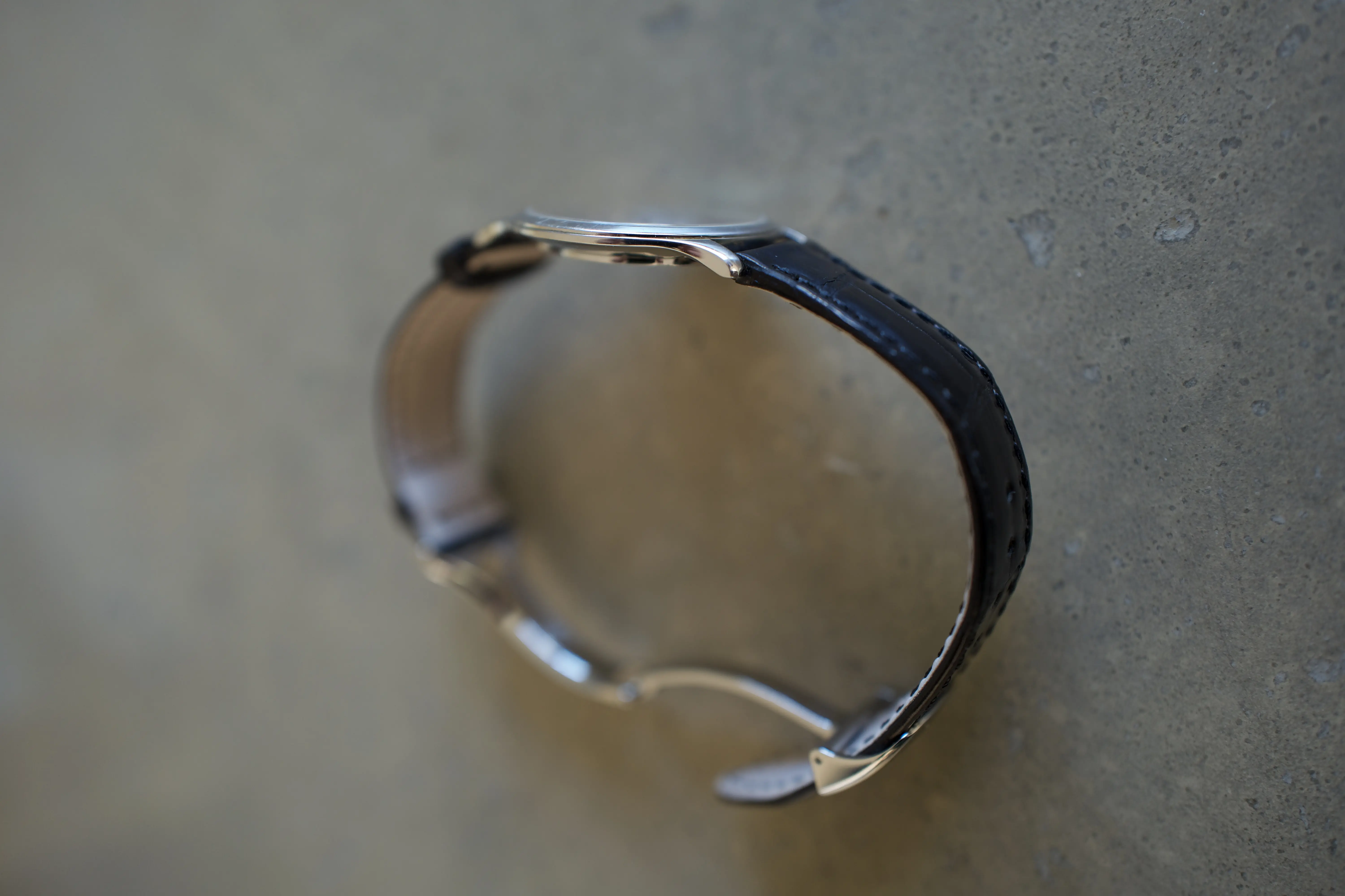 The design is super minimalist and timeless in my opinion. The ultra thin movement is a beauty to look at. It winds smoothly and keeps good time. Factory service adds some peace of mind. However, it does have surface scratches all over the case. The previous owner must have worn it as a daily driver. It’s a short strap so it won’t fit any wrist larger than 7’.
