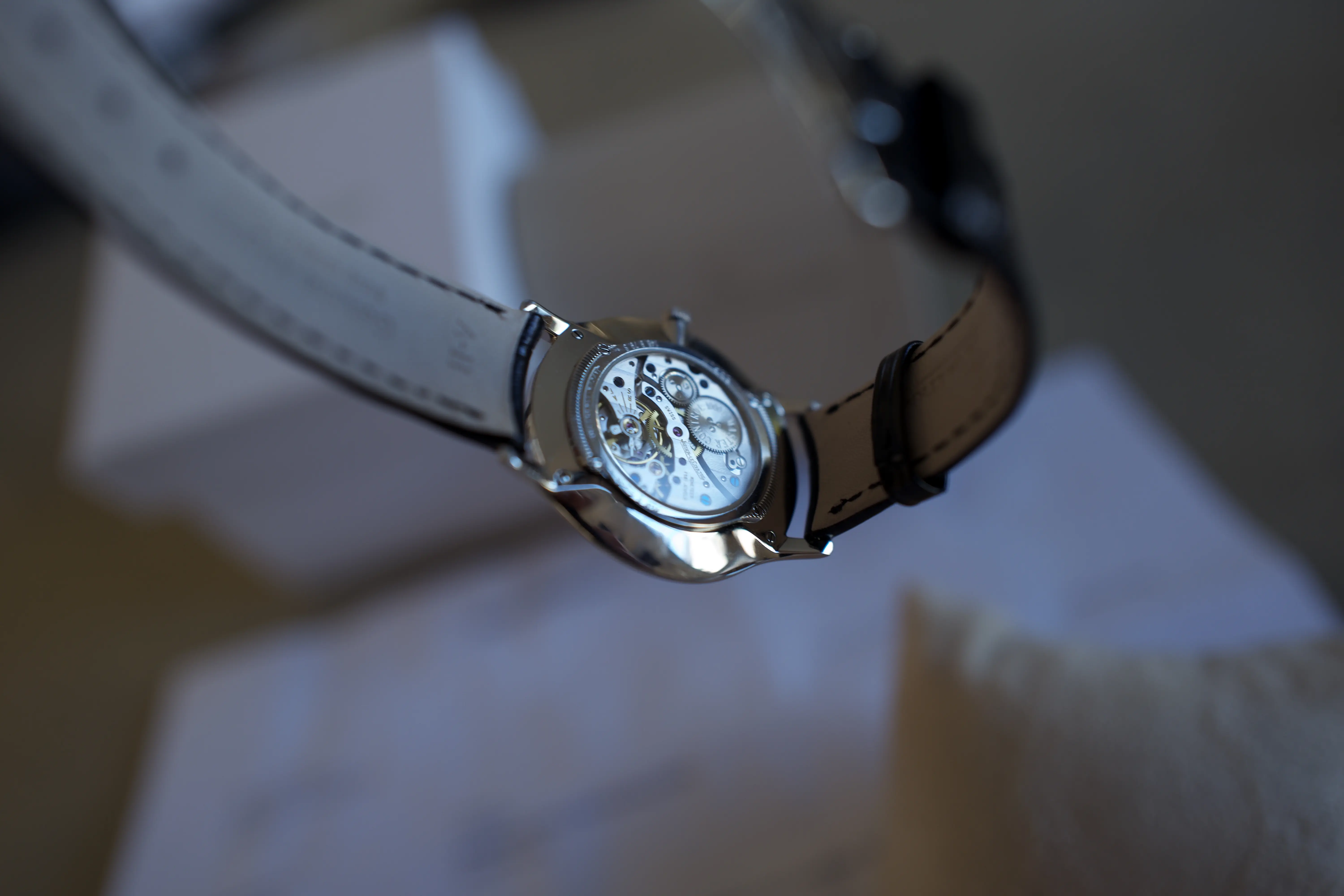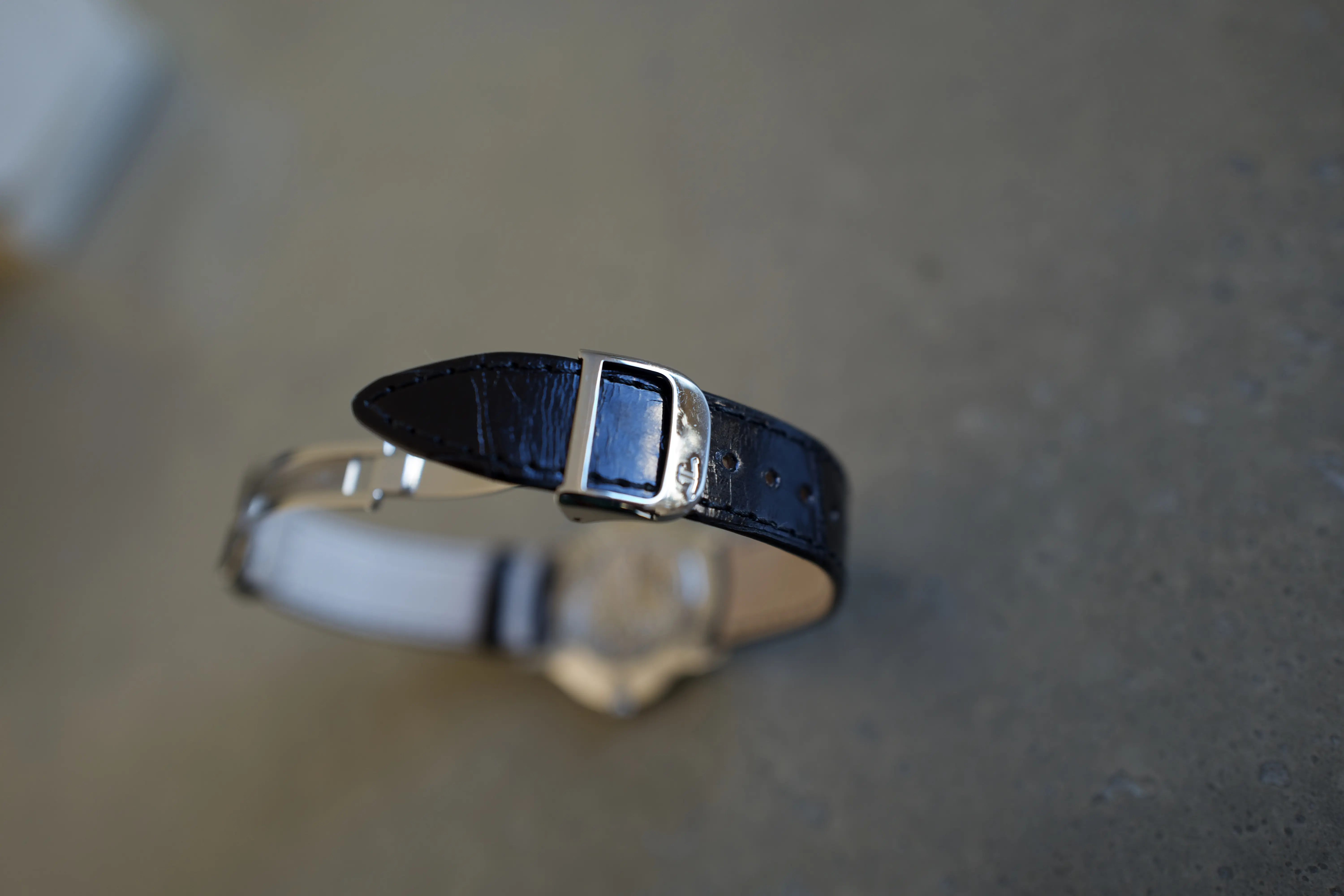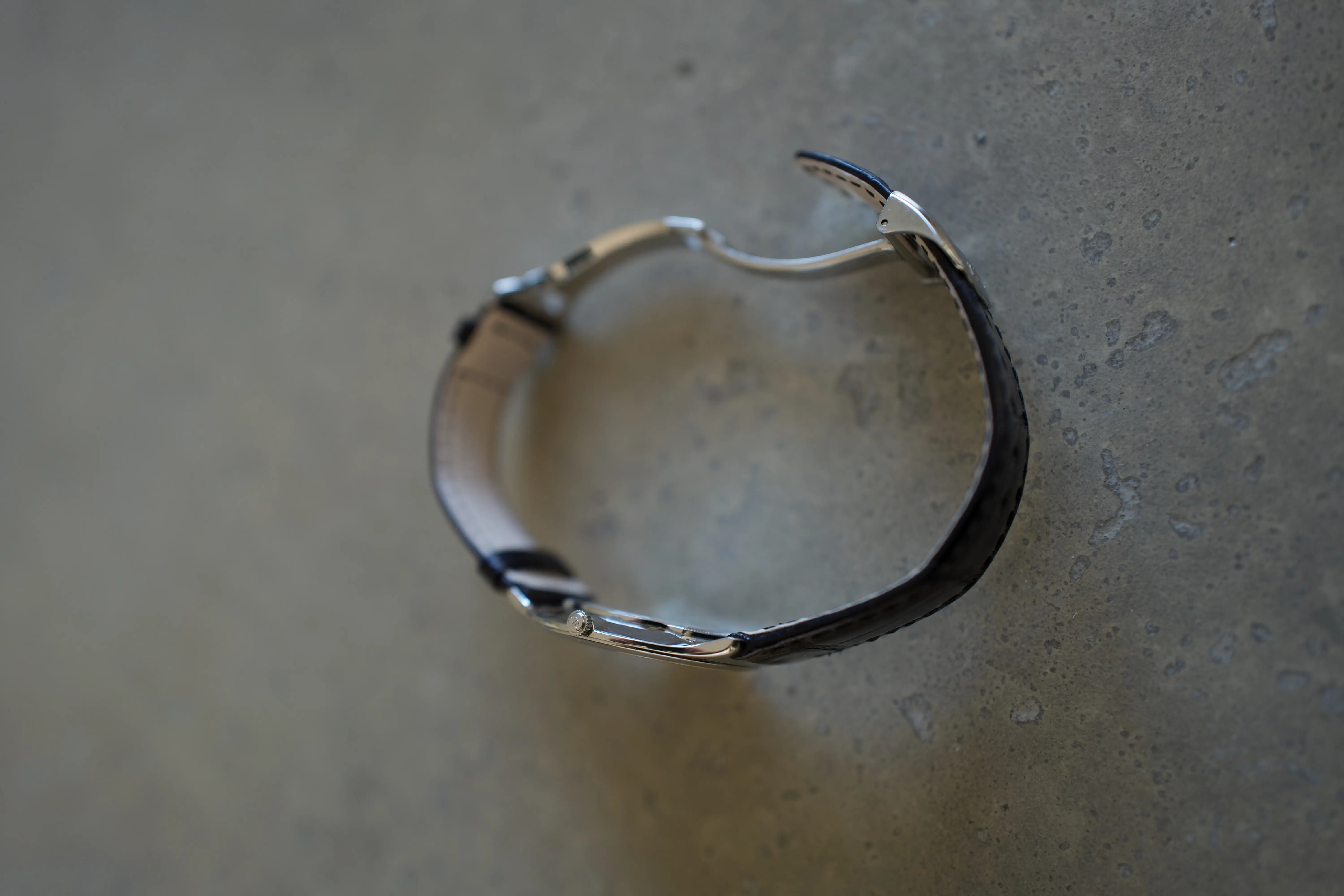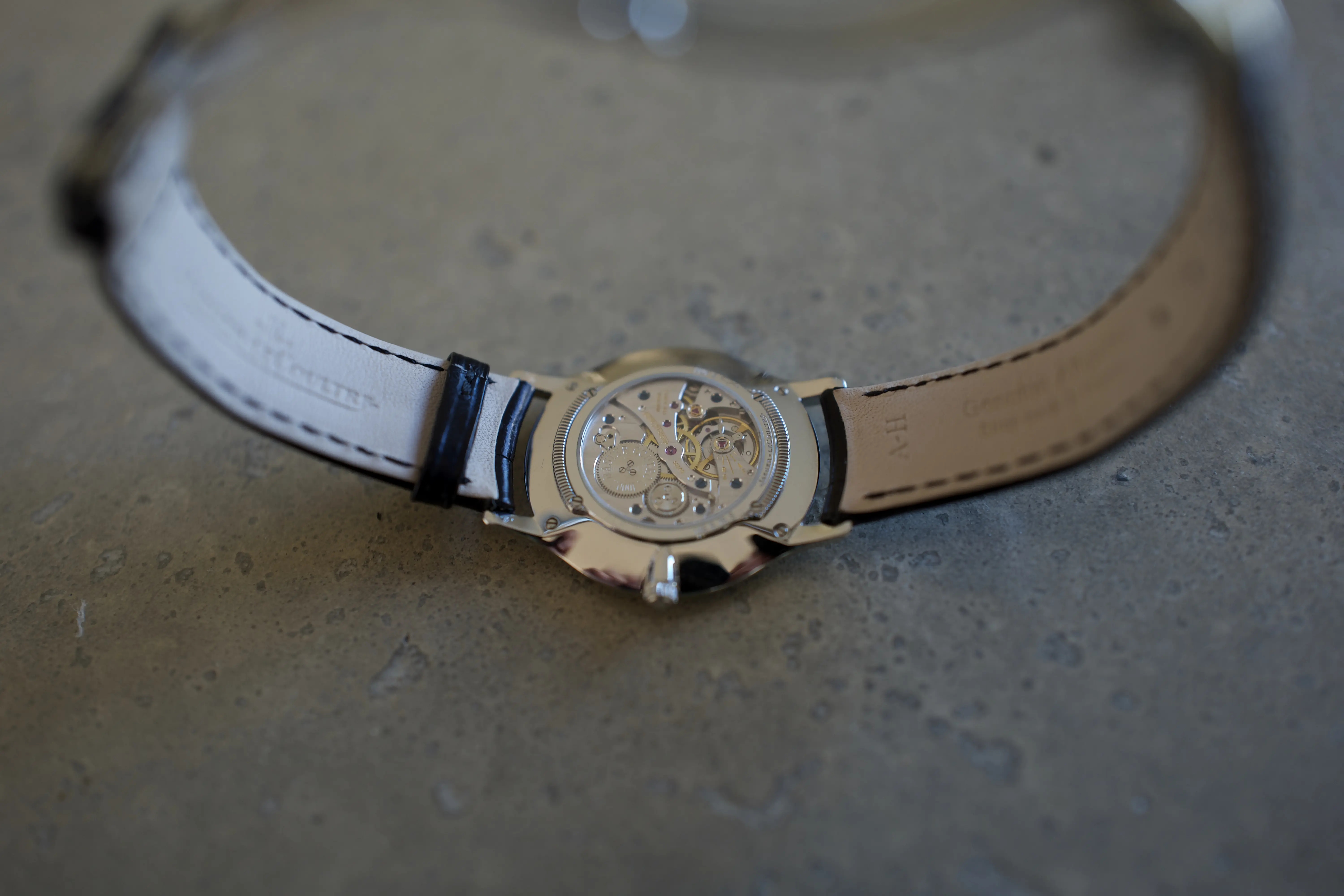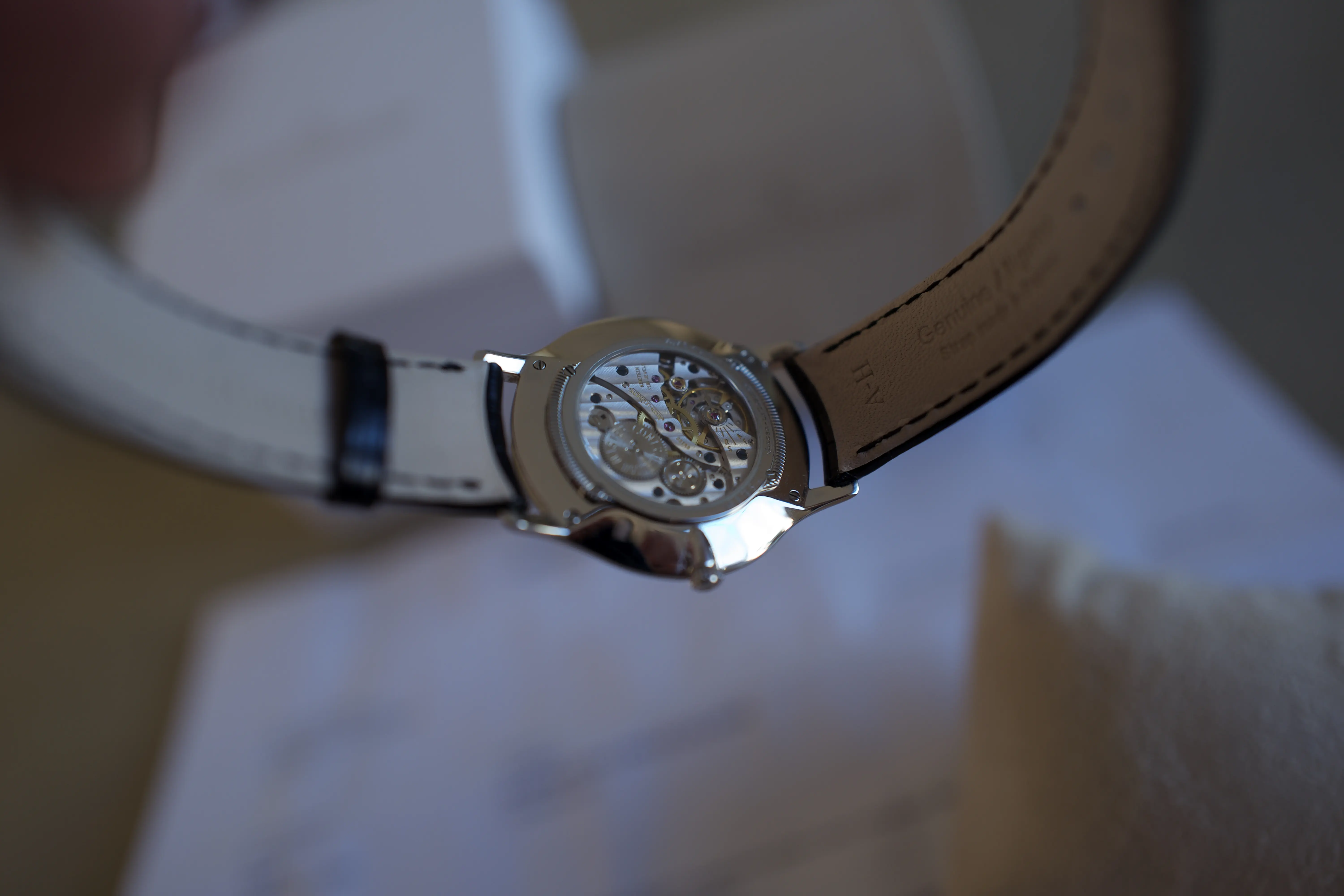 The design is super minimalist and timeless in my opinion. The ultra thin movement is a beauty to look at. It winds smoothly and keeps good time. Factory service adds some peace of mind. However, it does have surface scratches all over the case. The previous owner must have worn it as a daily driver. It’s a short strap so it won’t fit any wrist larger than 7’.